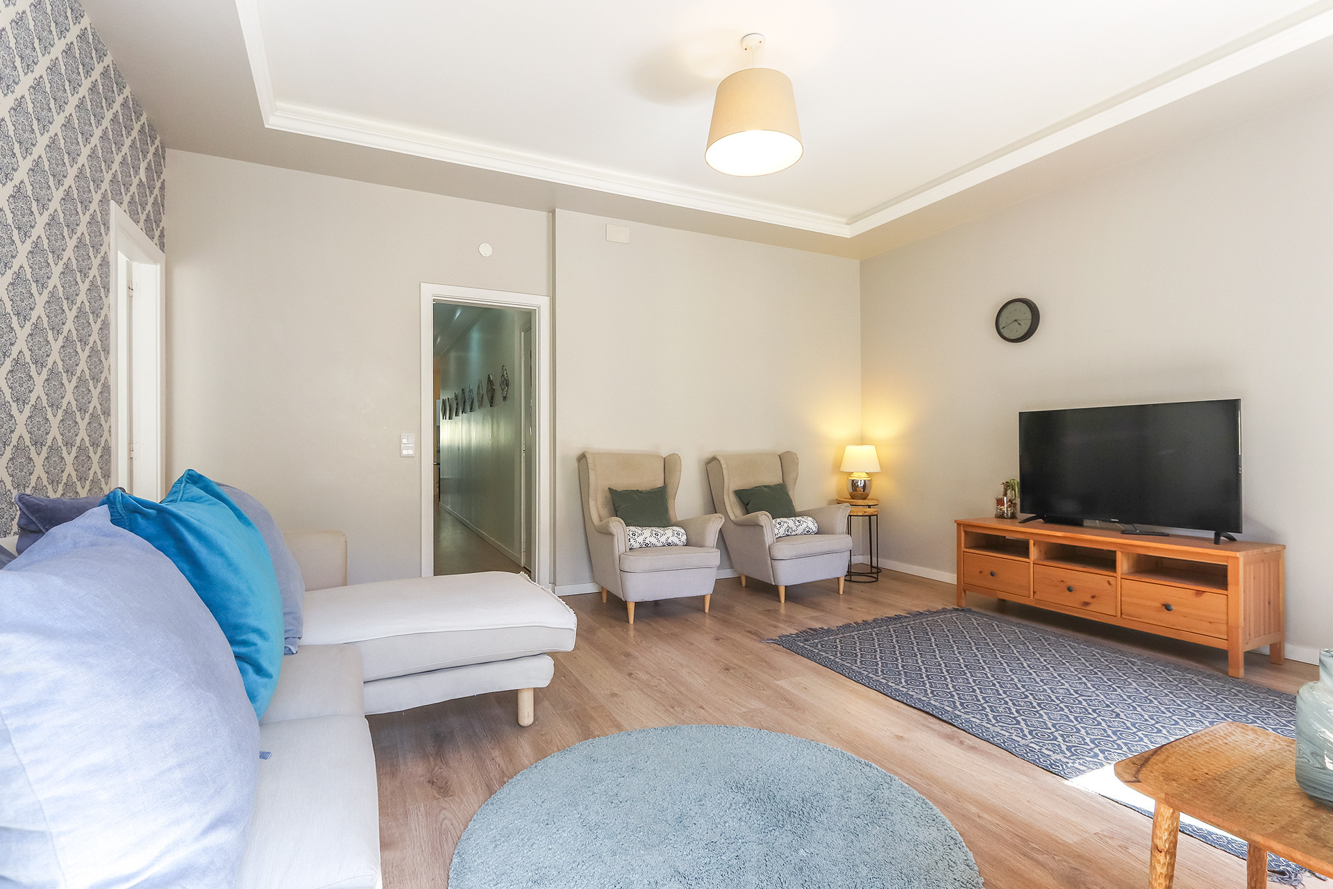 El apartamento está totalmente amueblado, decorado y equipado. El diseño y la decoración funcional le dan al apartamento la sensación de estar en casa. La cocina y los baños están equipados con todo lo que pueda necesitar. Toda la ropa de cama y las toallas se proporcionan como servicios para el primer día, como gel de ducha, papel higiénico, etc. TV por cable y Wi-Fi están disponibles en el apartamento de forma gratuita. Cinco habitaciones, tres con camas dobles, dos con dos camas individuales dan al apartamento la capacidad para 10 personas.