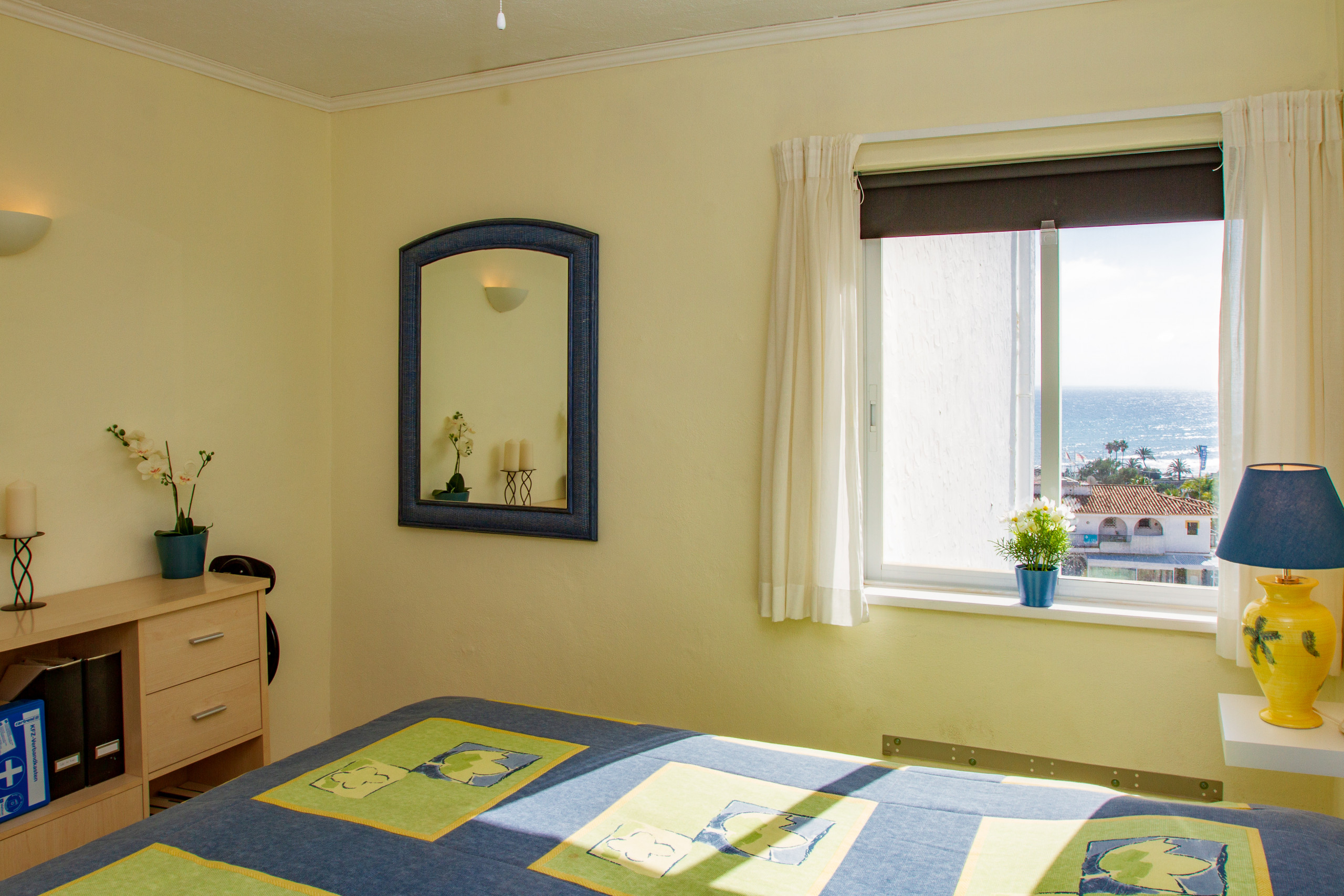 La cocina está totalmente equipada con refrigerador, congelador, horno, etc. Al lado de la cocina tiene la sala de estar que tiene un área de comedor y una acogedora área de sofás, donde encontrará un televisor con muchos canales de televisión de idiomas diferentes, como inglés, francés, alemán, ruso, escandinavo, etc. Desde la sala de estar hay acceso directo a la terraza donde hay una hermosa vista al mar Mediterráneo. La terraza tiene muebles de jardín donde podrá disfrutar de una comida.