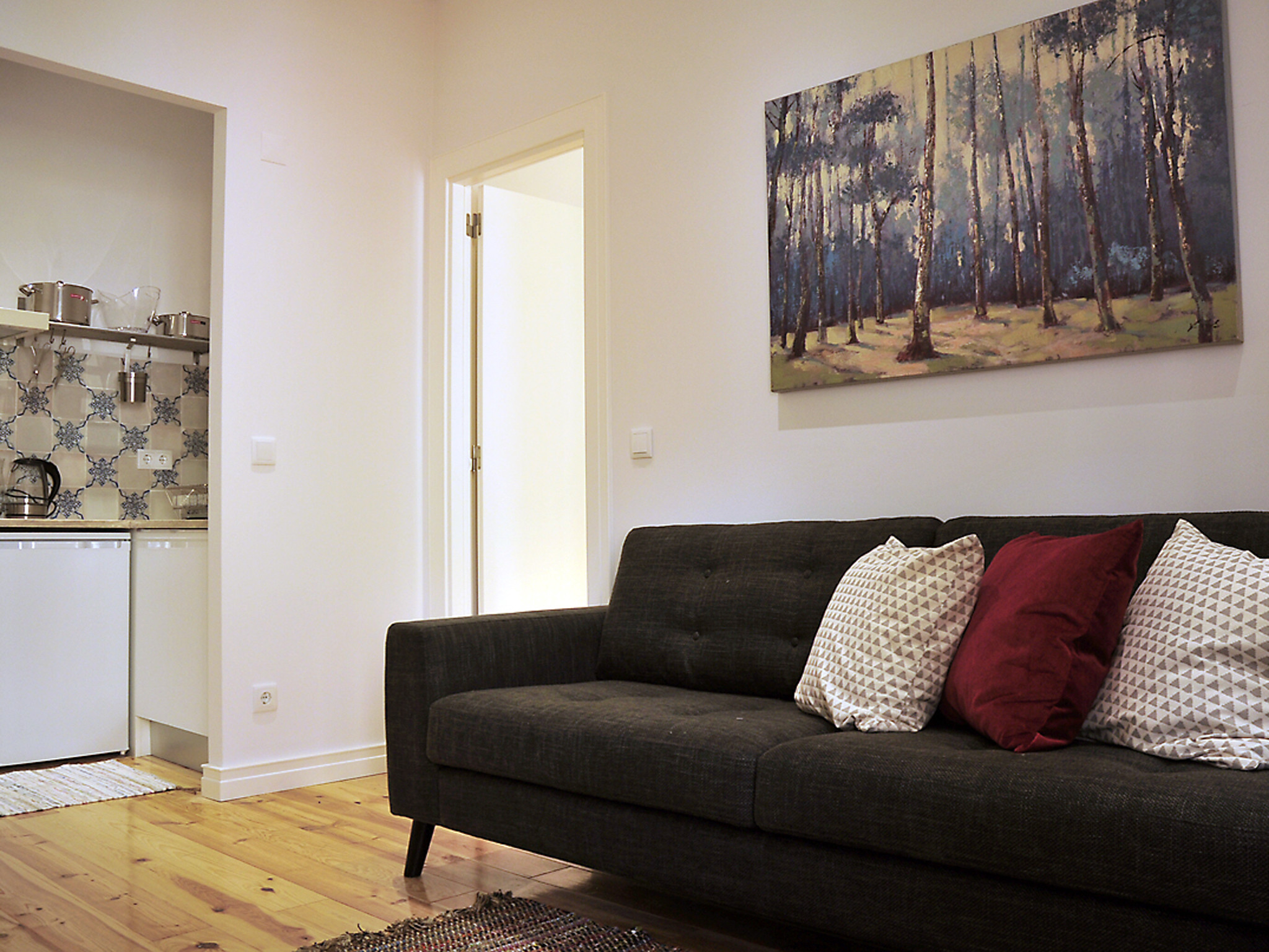 El apartamento incluye un dormitorio doble con closet, una sala de estar, cocina y baño con ducha. La cama doble se puede convertir en dos camas individuales.