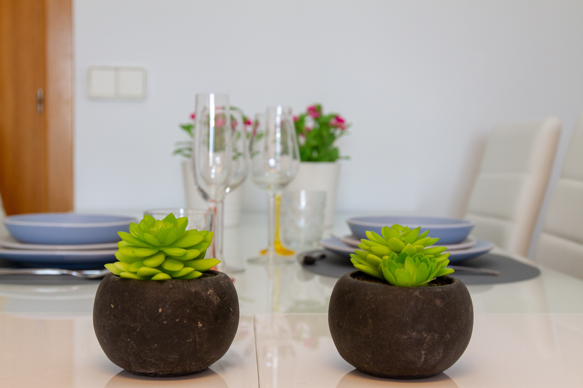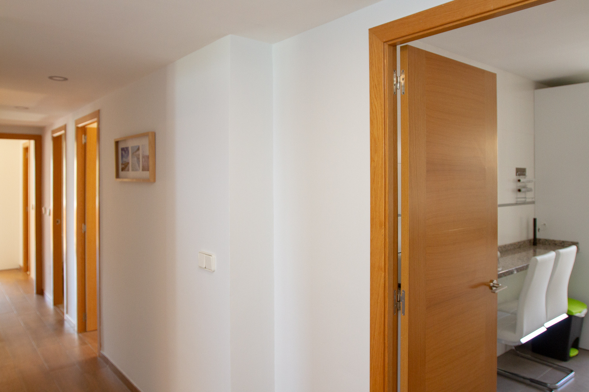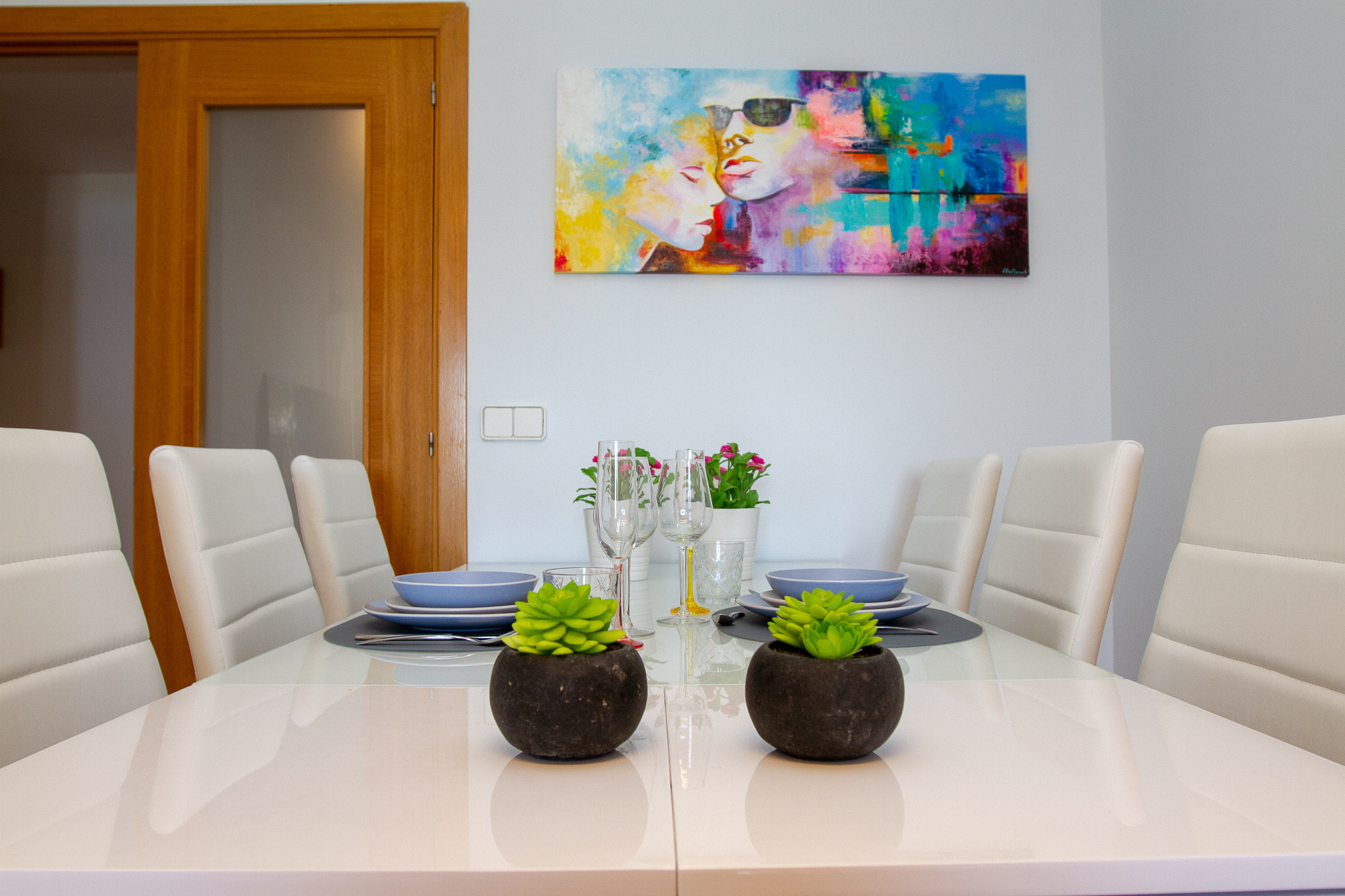 Al entrar en el apartamento hay un gran hall con acceso a todas las habitaciones. El área de la sala de estar está a la izquierda y a la derecha hay una cocina totalmente equipada. La sala de estar tiene muebles de lujo y tiene un comedor y un gran sofá de cuero con un televisor inteligente de pantalla plana súper grande y Apple TV. Desde esta área hay acceso directo a la terraza orientada al sur, donde se puede disfrutar de la hermosa vista al mar. Esta terraza tiene una mesa de comedor para 6 a 8 personas.