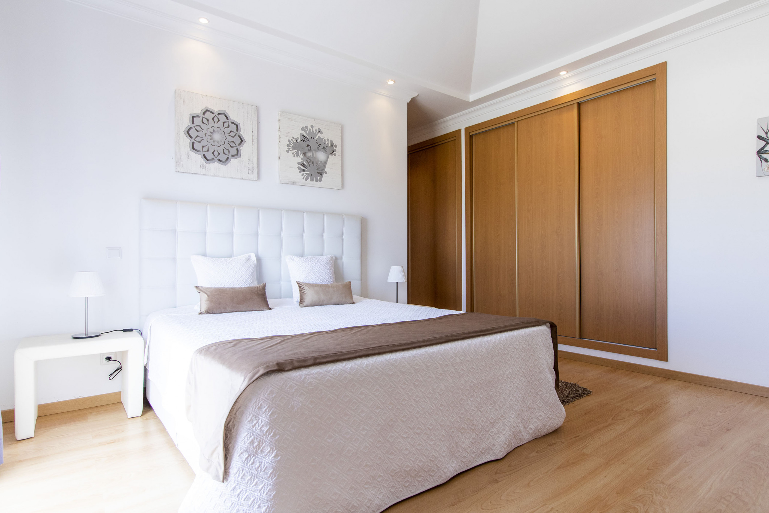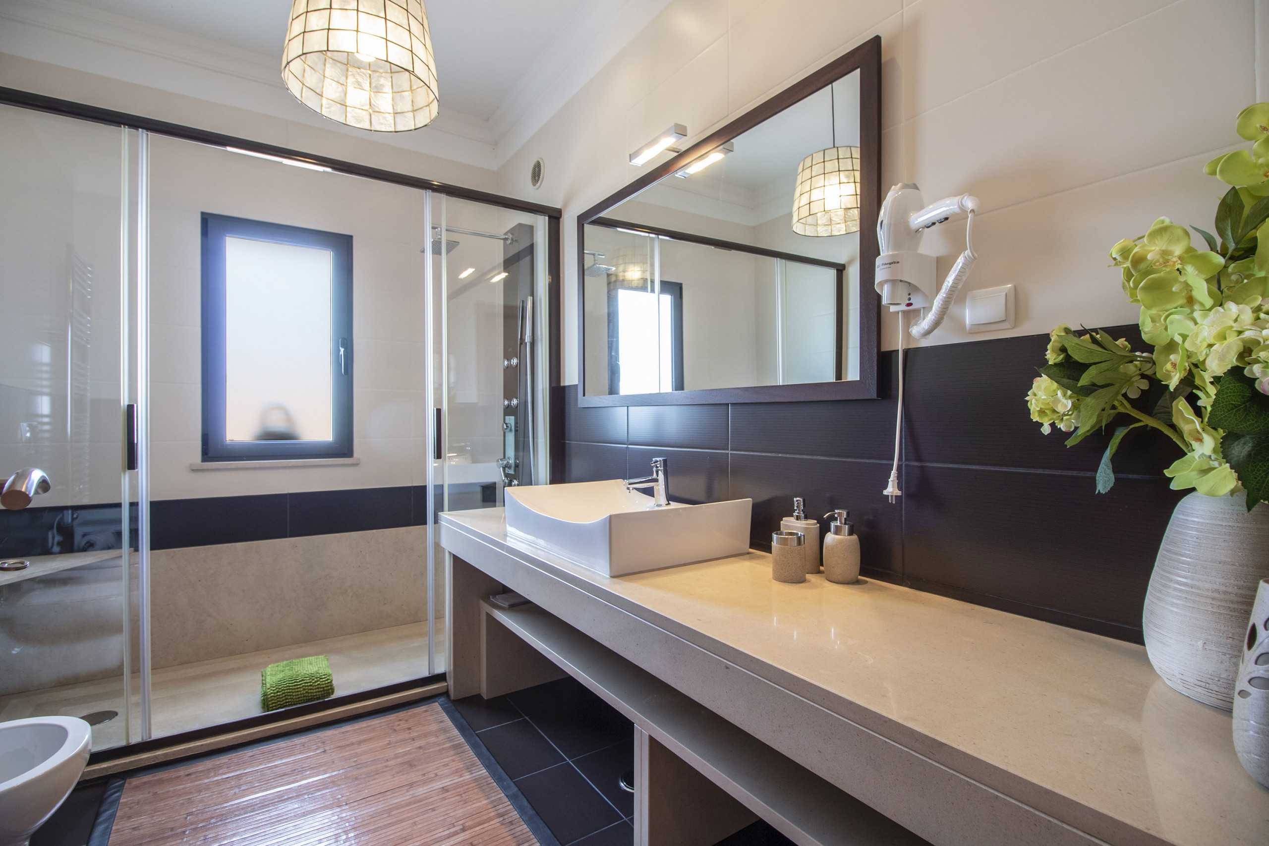 Esta villa tiene 3 dormitorios y 3 baños más un aseo, configurados de la siguiente manera:
