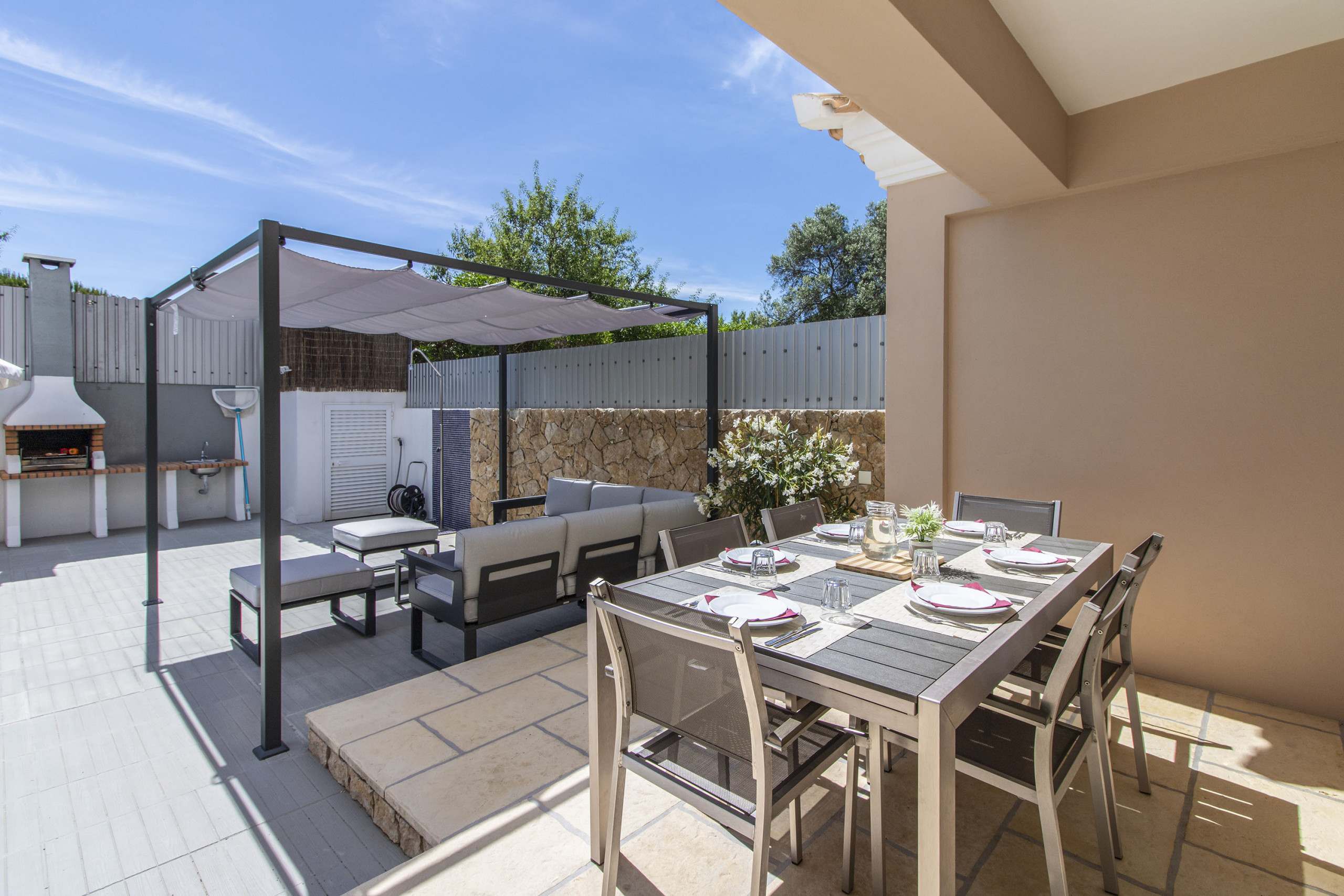 Jardín privado, rodeado de arbustos y tapiado, césped para juegos infantiles, con suelo de gres que rodea la piscina, varias tumbonas y sofás exteriores para disfrutar del sol y del aire libre, zona de comedor exterior con mesa y cómodas sillas servidas por una barbacoa de carbón. Zona muy bonita y muy privada y tranquila para disfrutar de sus vacaciones.