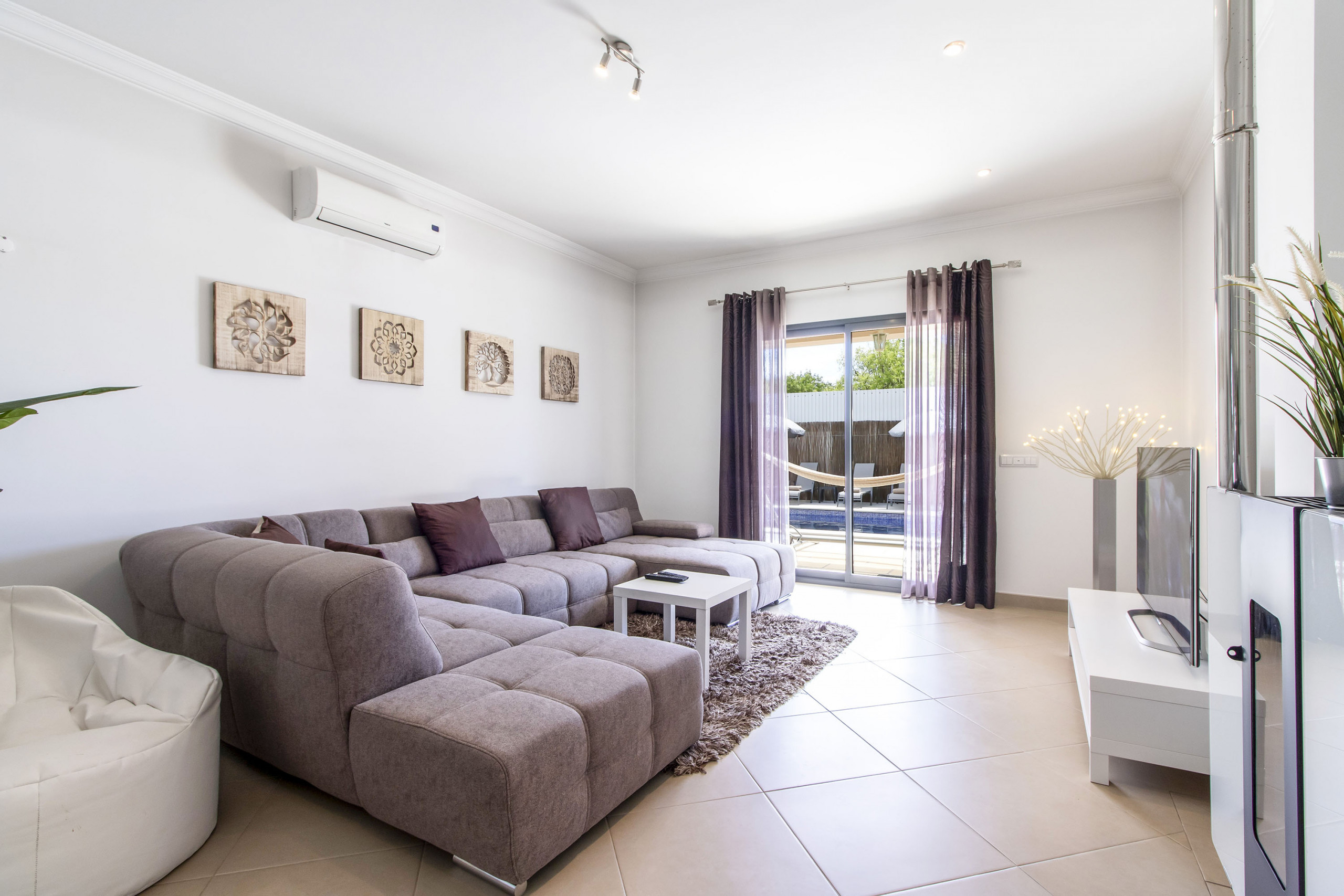 El amplio salón, con una decoración moderna, con una gran mesa para comidas, tiene ventanas correderas que dan acceso al jardín y piscina. El salón está equipado con aire acondicionado, TV de pantalla plana con canales por cable en portugués e inglés, también acceso a Internet.