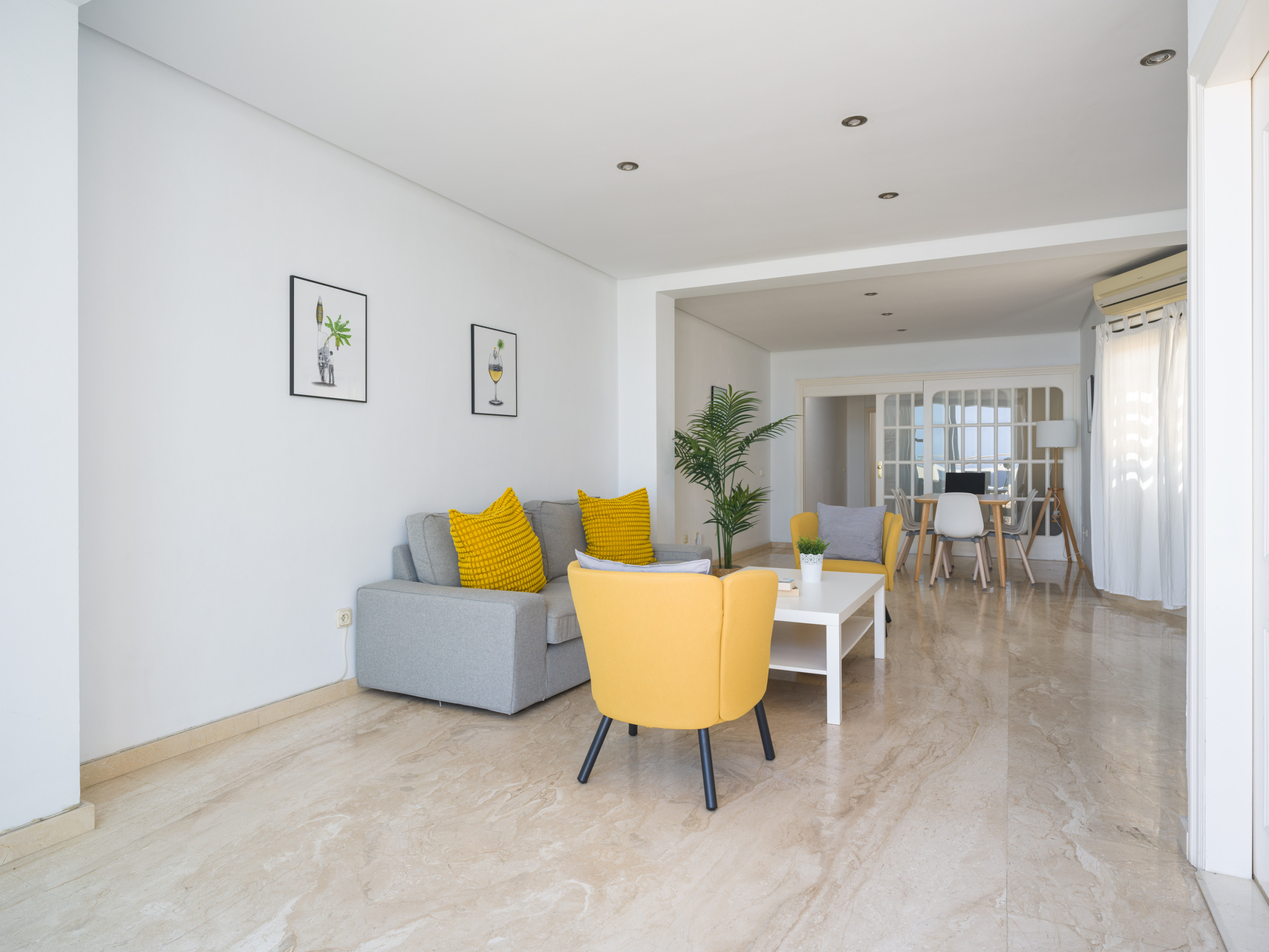 Al entrar al edificio, hay que subir seis peldaños hasta llegar al ascensor, al llegar a la última planta hay 14 peldaños hasta llegar al fabuloso ático. Al entrar, se aprecia una luminosa sala de estar con amplios ventanales que permiten la entrada de luz natural. Los tonos neutros y la decoración contemporánea crean un ambiente acogedor y relajante. El salón comedor dispone de una amplia mesa de comedor con seis cómodas sillas, además de cómodos sofás, un televisor Smart y aire acondicionado, perfecto para relajarse después de un día de explorando la isla.