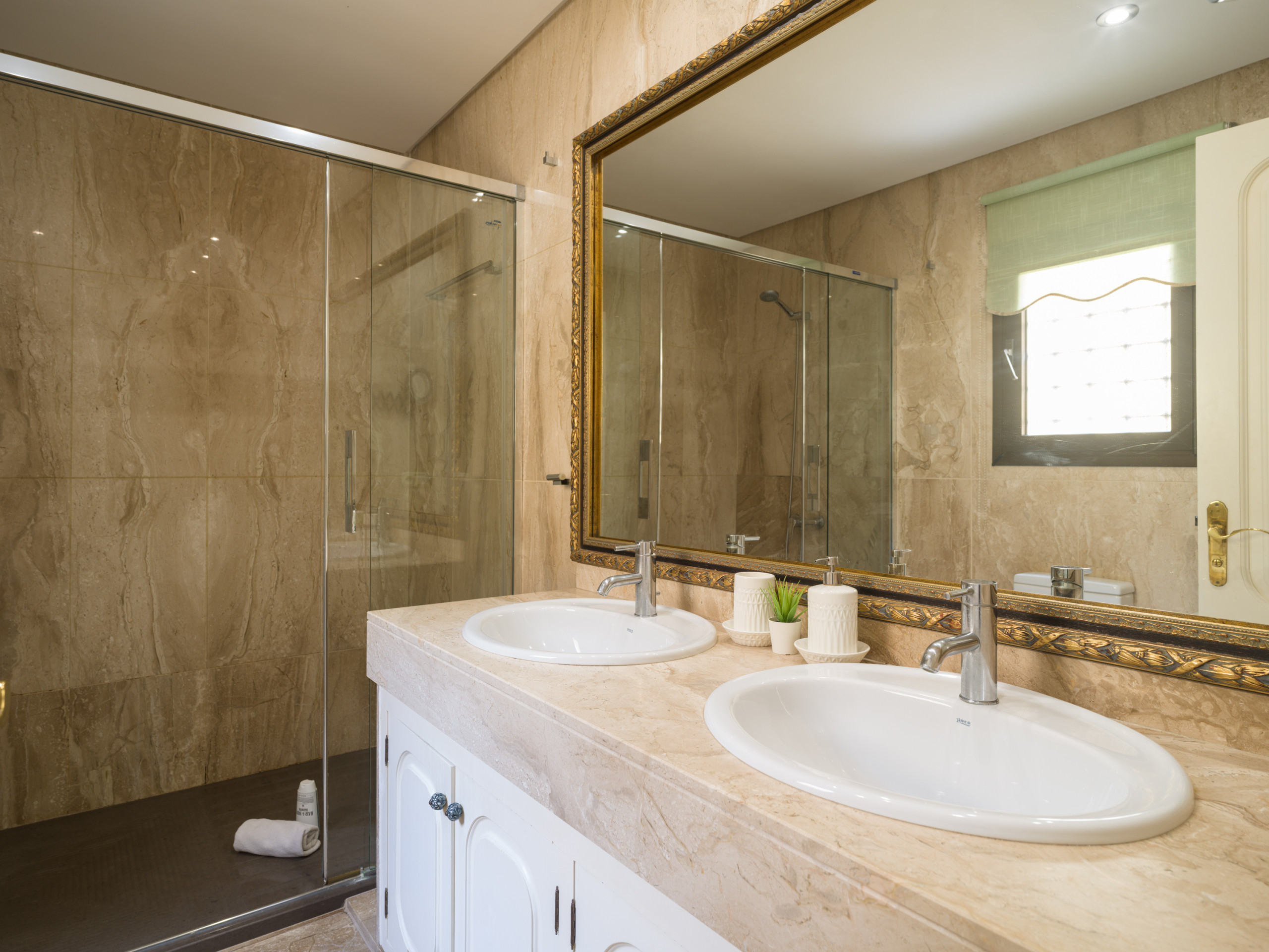 Tiene dos elegantes baños de mármol, equipados con platos de duchas, WC, bidé y doble lavamanos, amplios espejos, secador de pelo y un juego completo de toallas suaves y esponjosas.