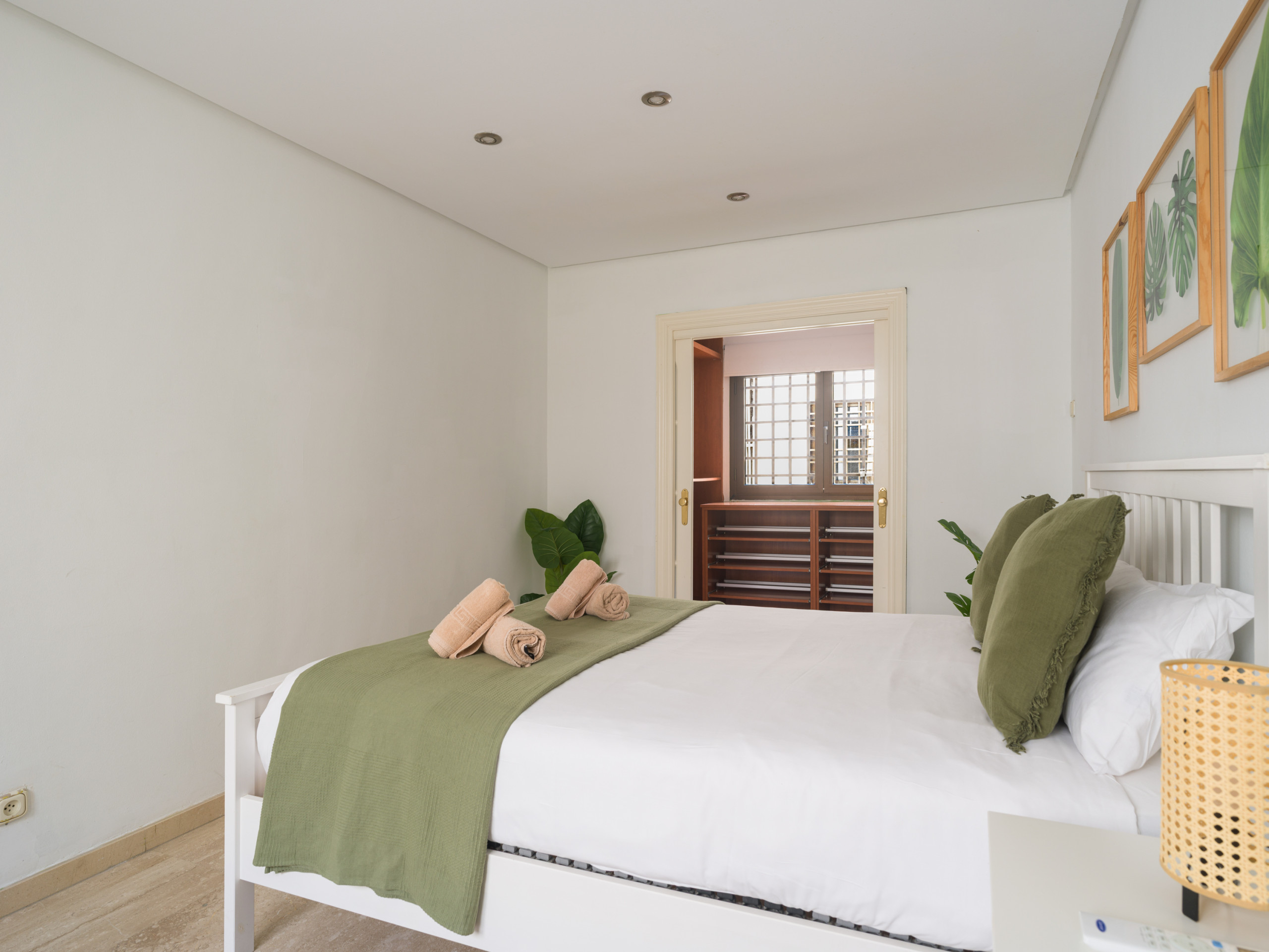 La vivienda cuenta con dos dormitorios con aire acondicionado, ambos presentados con un estilo moderno y cómodo. Las habitaciones están amuebladas una suite con cama doble (1.60 metros de ancho), vestidor y baño y el otro con dos camas individuales (0.9 metros de ancho cada una) con ropa de cama de calidad, asegurando una noche de descanso reparador a los huéspedes. Además, hay armarios empotrados que brindan amplio espacio de almacenamiento.