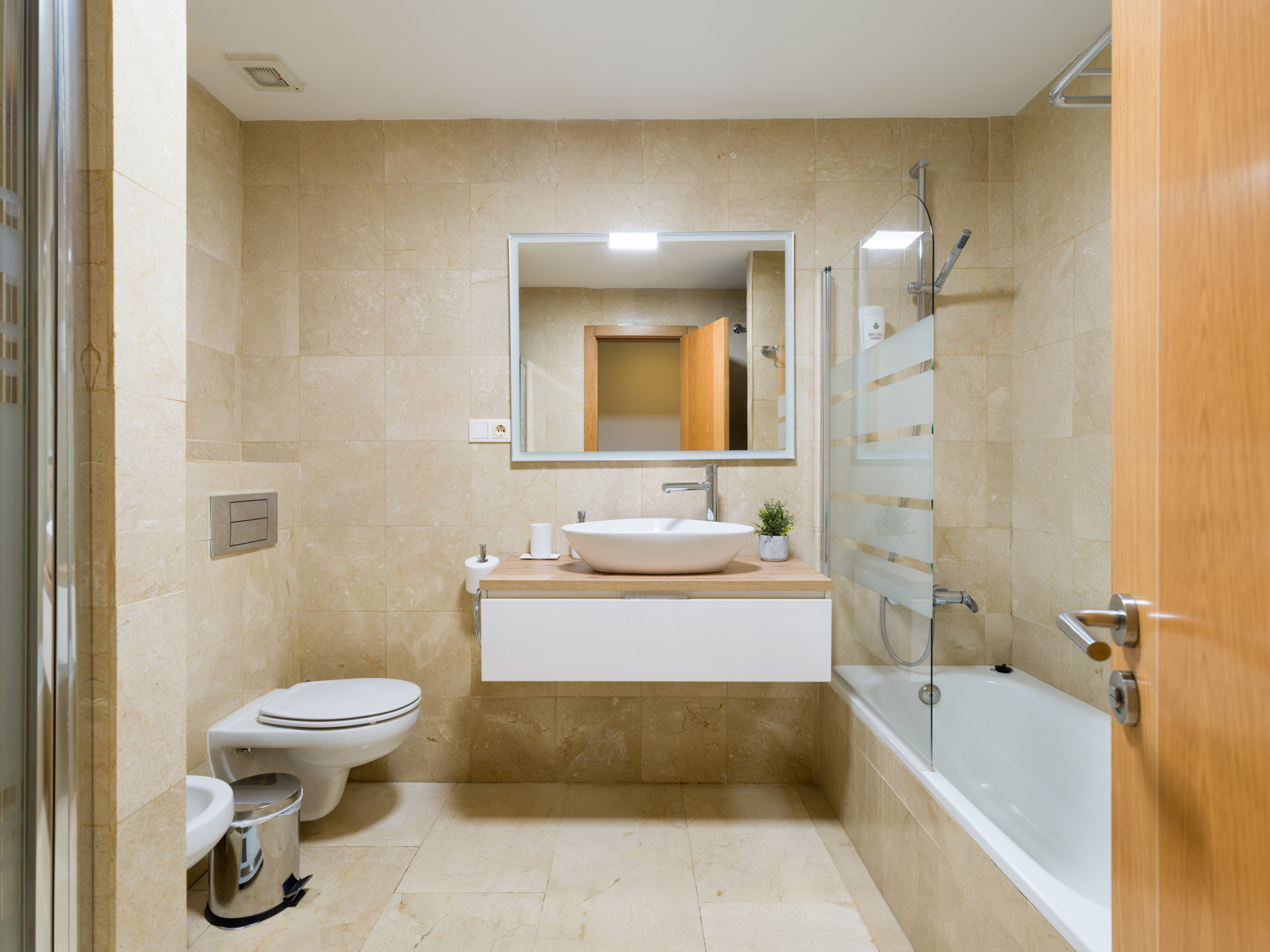 El baño de mármol es de lo más completo, tiene bidé, WC con cisterna de doble descarga, ducha y bañera separadas, ambas con mamparas, espejo con luz integrada, secador de pelo, termo de 30 litros y lavadora.