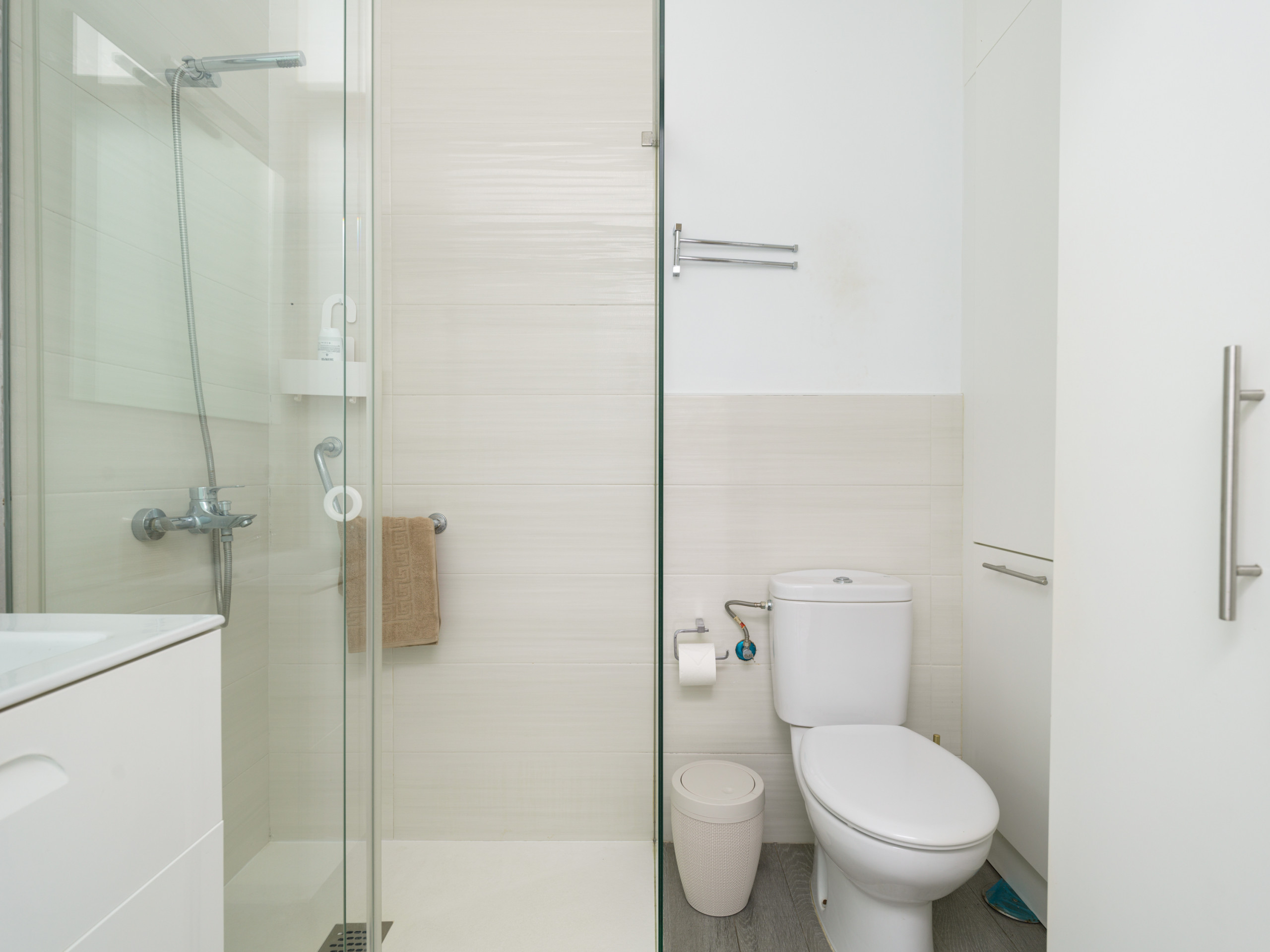 El baño privado con ducha ofrece comodidades esenciales y cuenta con características eco-friendly como inodoro de eficiencia hídrica. El apartamento incluye detalles como TV inteligente, conexión WiFi, plancha, radio y una zona de estar con sofá para máximo confort.