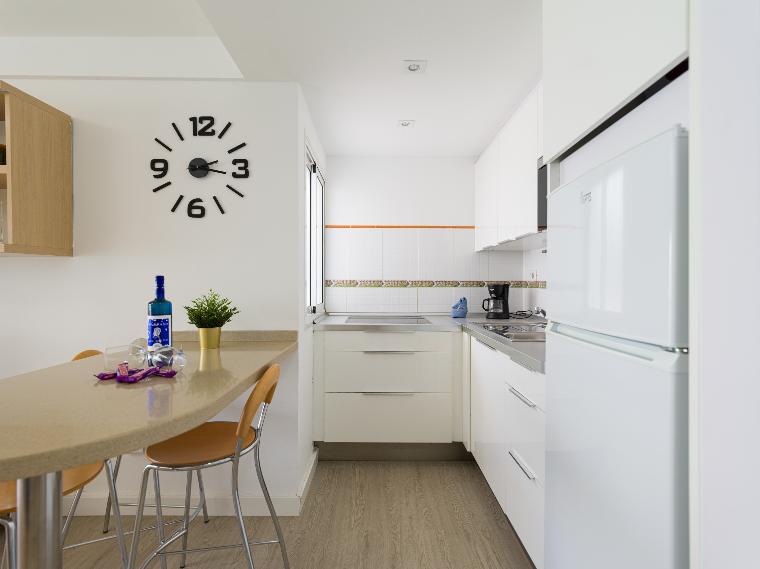 La cocina de estilo americana cuenta con placa vitrocerámica, con nevera, microondas, congelador, lavadora, vajilla/cubertería, utensilios/cocina, cafetera, tostadora, hervidor de agua y exprimidor.