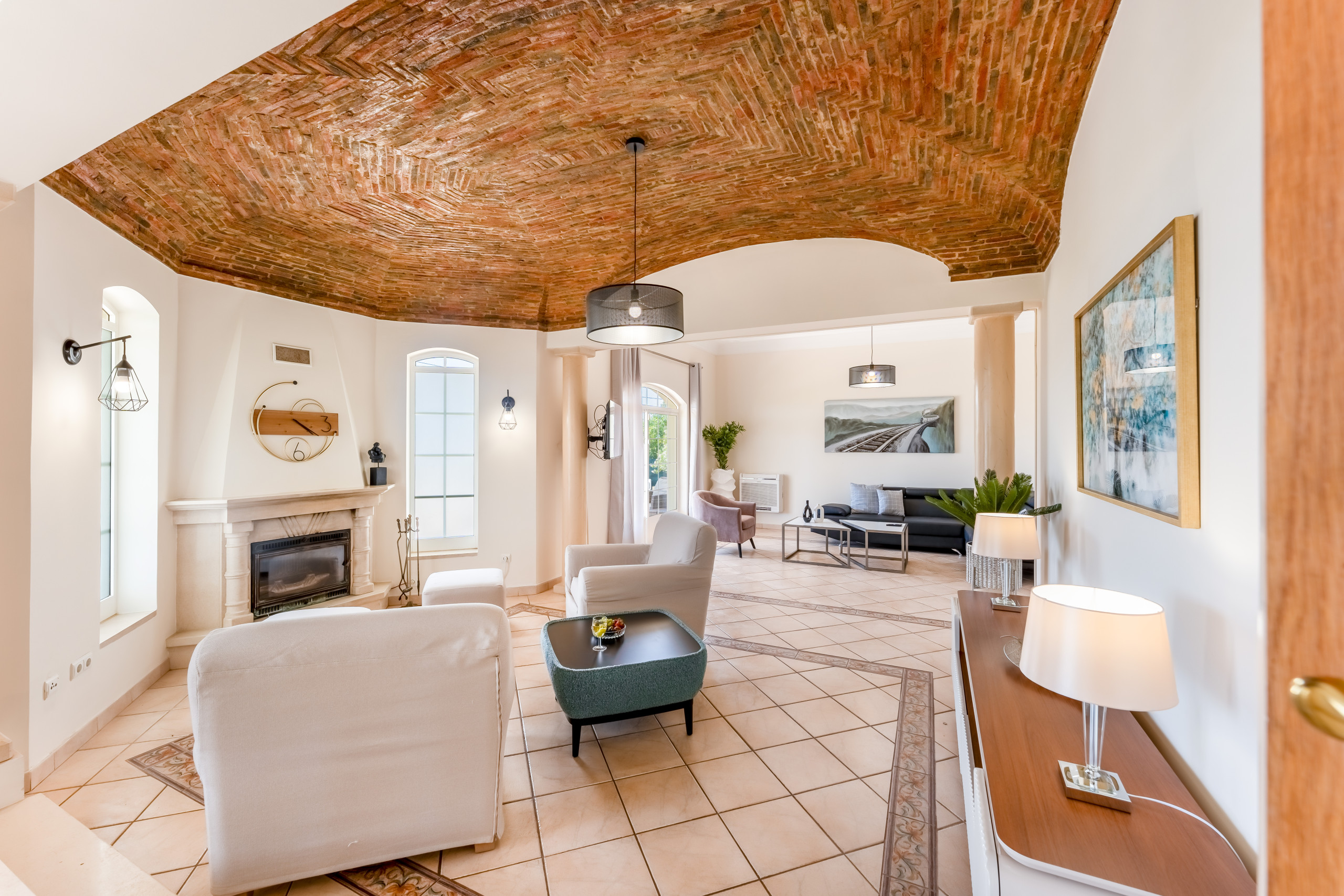 El salón es amplio y tiene 3 zonas separadas, el bar, la zona de estar y la zona de comedor. El área de estar tiene una chimenea, un televisor con canales en inglés (BBC, ITV, etc.) y cobertura Wi-Fi en toda la villa.