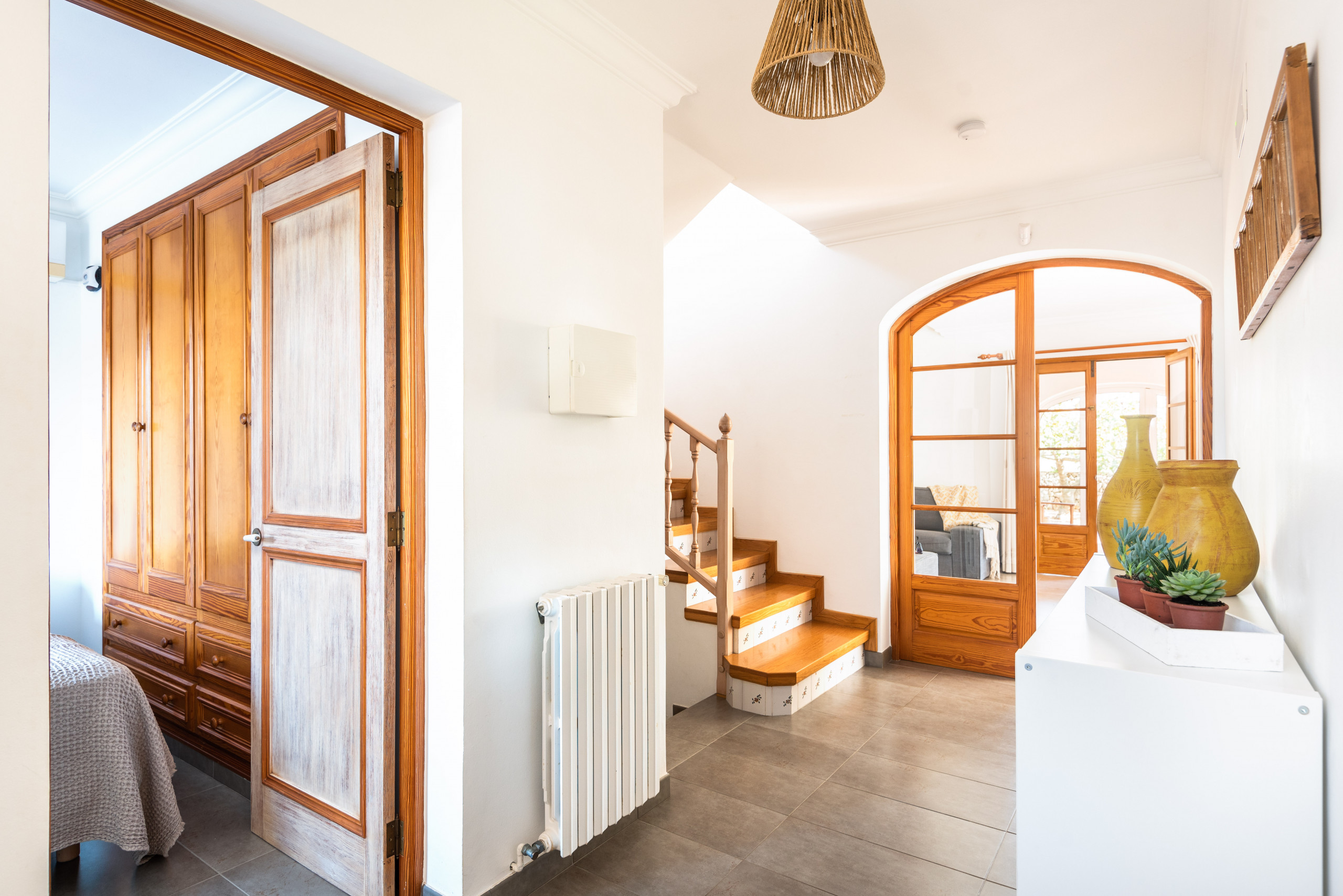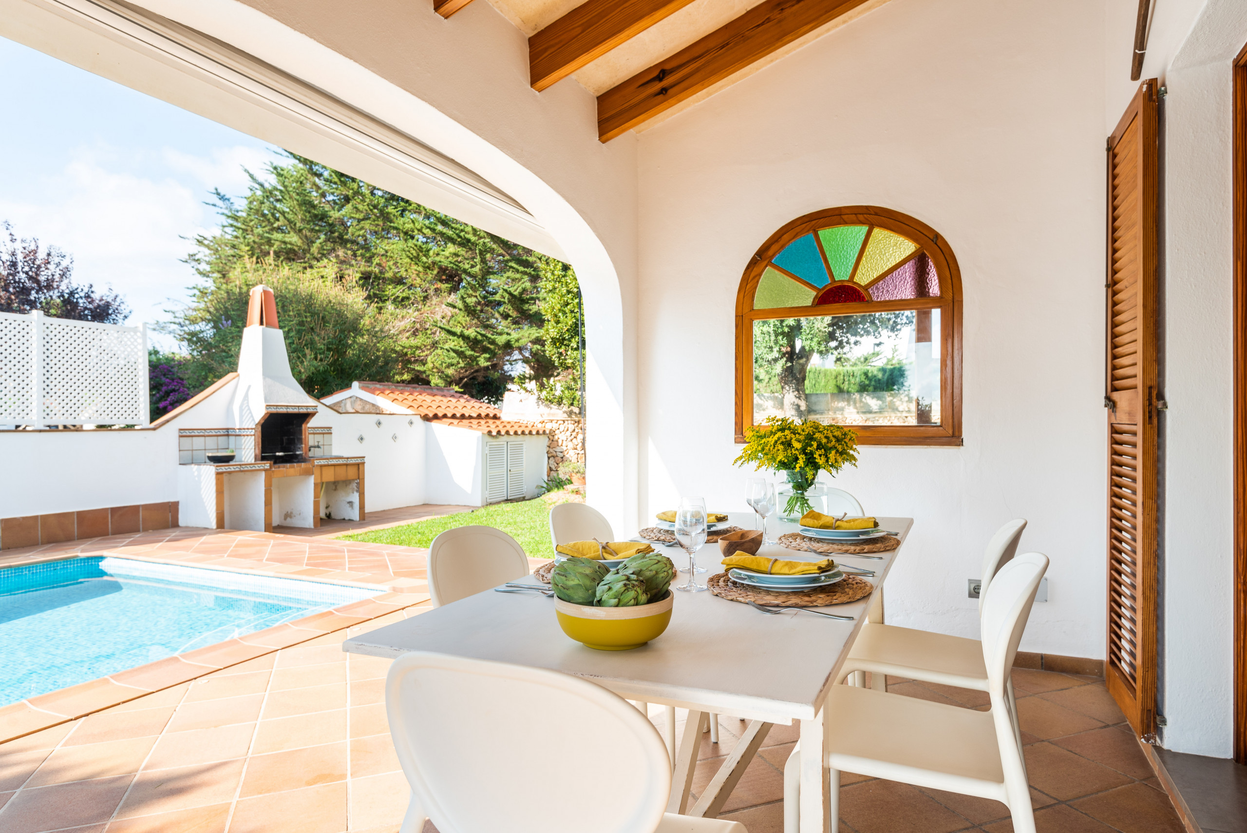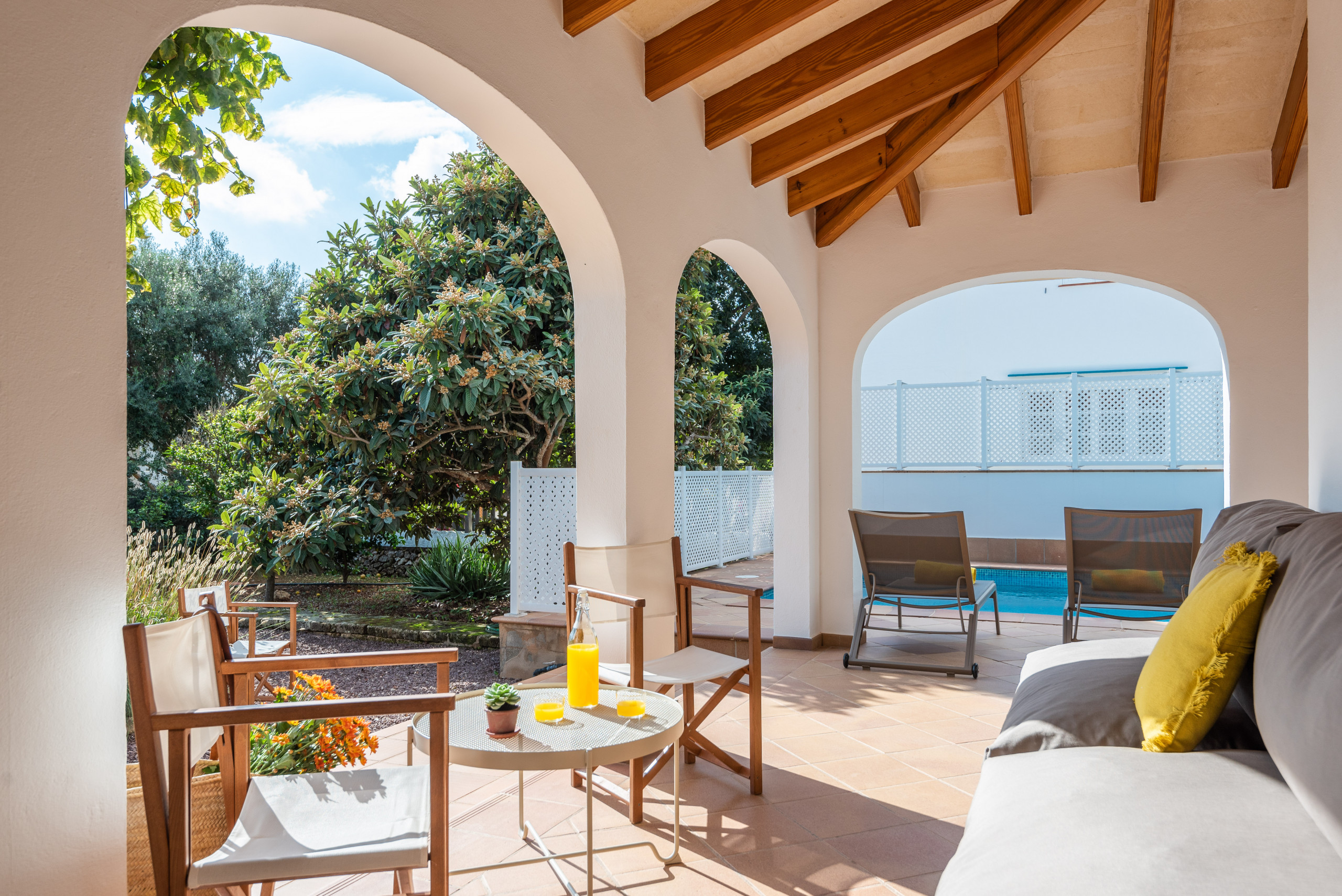 Elena, es un alojamiento especial en Mauter Villas. Elena, disfruta de un gran solar con vegetación natural para que disfrutes de la naturaleza en tu propia villa. Dispone de piscina privada, con protección niños en caso de desearlo. Piscina, rodeada de tumbonas y de una magnífica barbacoa de obra! Interiormente es ideal. Cocina muy completa con cafetera nespresso y mucho más, salón con cómodos sofás , pensado siempre en tu confort, y desde el salón y cocina, salida a gran terraza, con muebles estilo chillout , para poder disfrutar de las tardes de verano. Capacidad para 7 personas, con opción de poder añadir 1 suplemento con coste extra. Ubicada en calle sin salida, mucha tranquilidad, a tan sólo 400 metros de la playa de Arena!