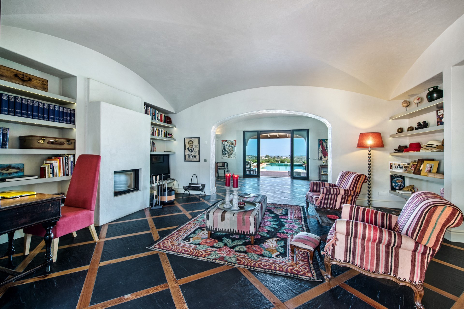 La biblioteca es un espacio privado semiabierto dividido por arcos y tiene una chimenea. La biblioteca también se abre al patio cerrado por un lado y a la terraza del jardín por el otro lado.