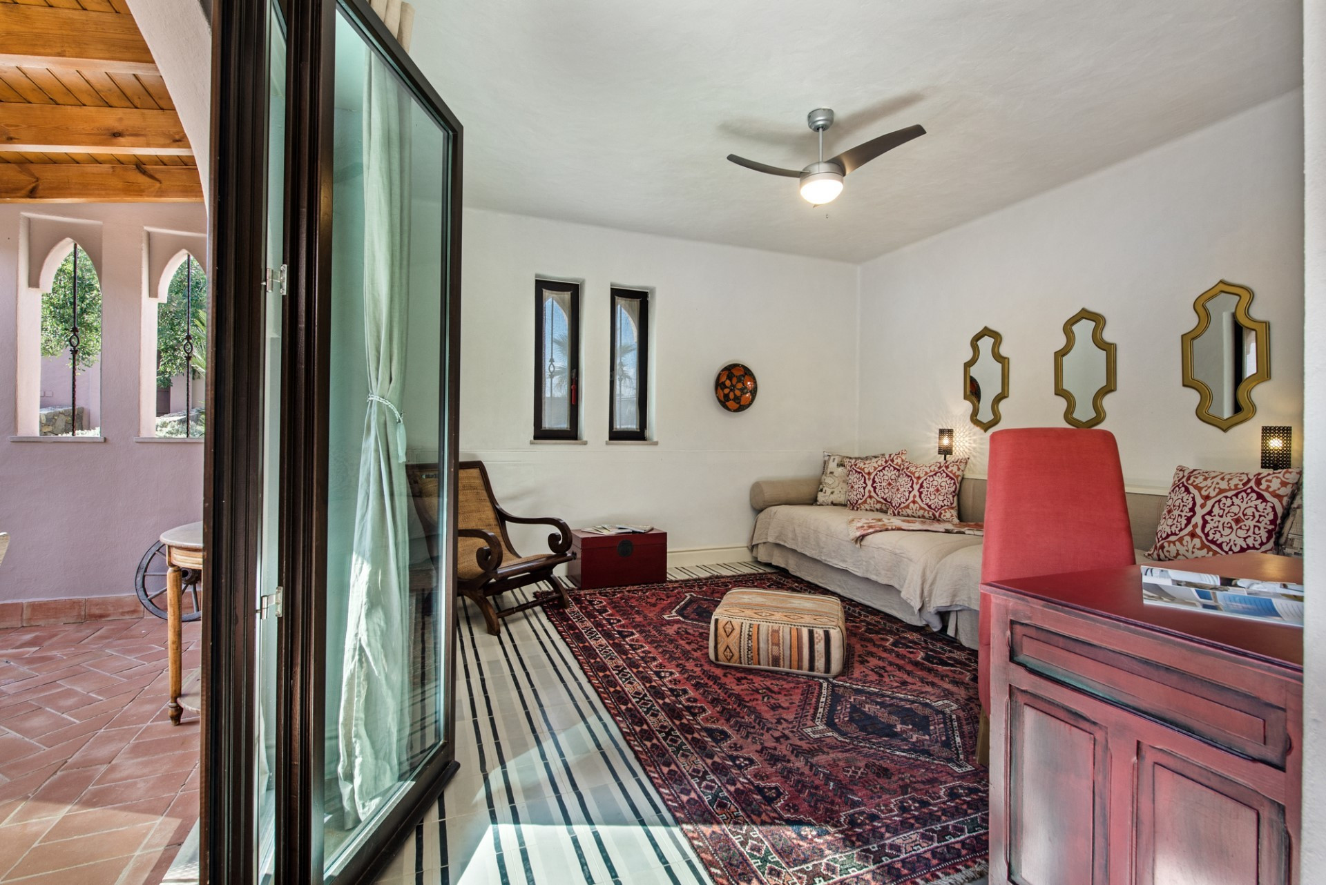 El salón tiene una chimenea de leña de estilo morisco hecha a mano y da acceso a la terraza del jardín delantero.