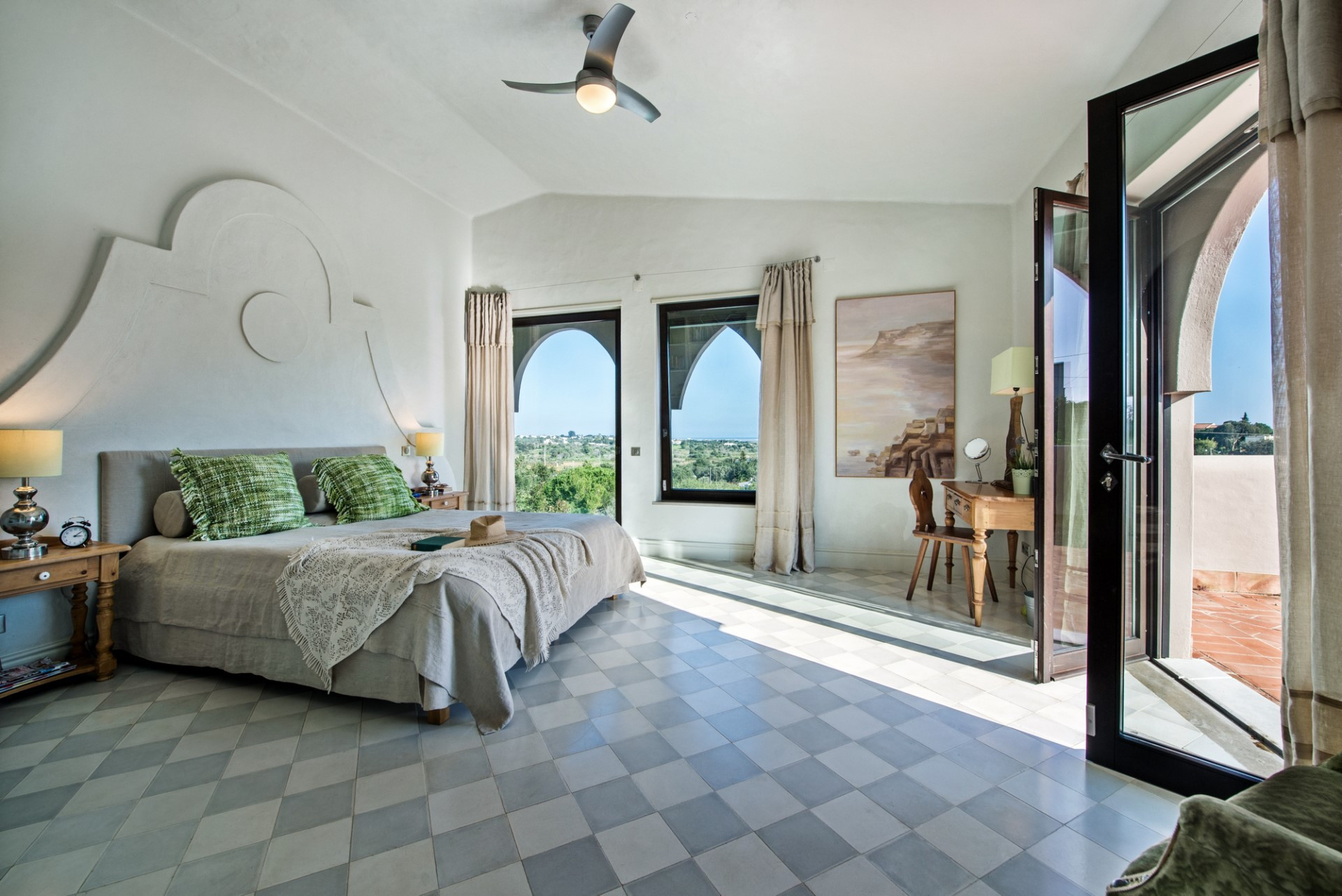 El vestidor conduce a través de un arco a la zona de dormitorio con una cama tamaño king. Desde aquí hay una gran terraza privada con una escalera exterior que conduce al jardín y la piscina.