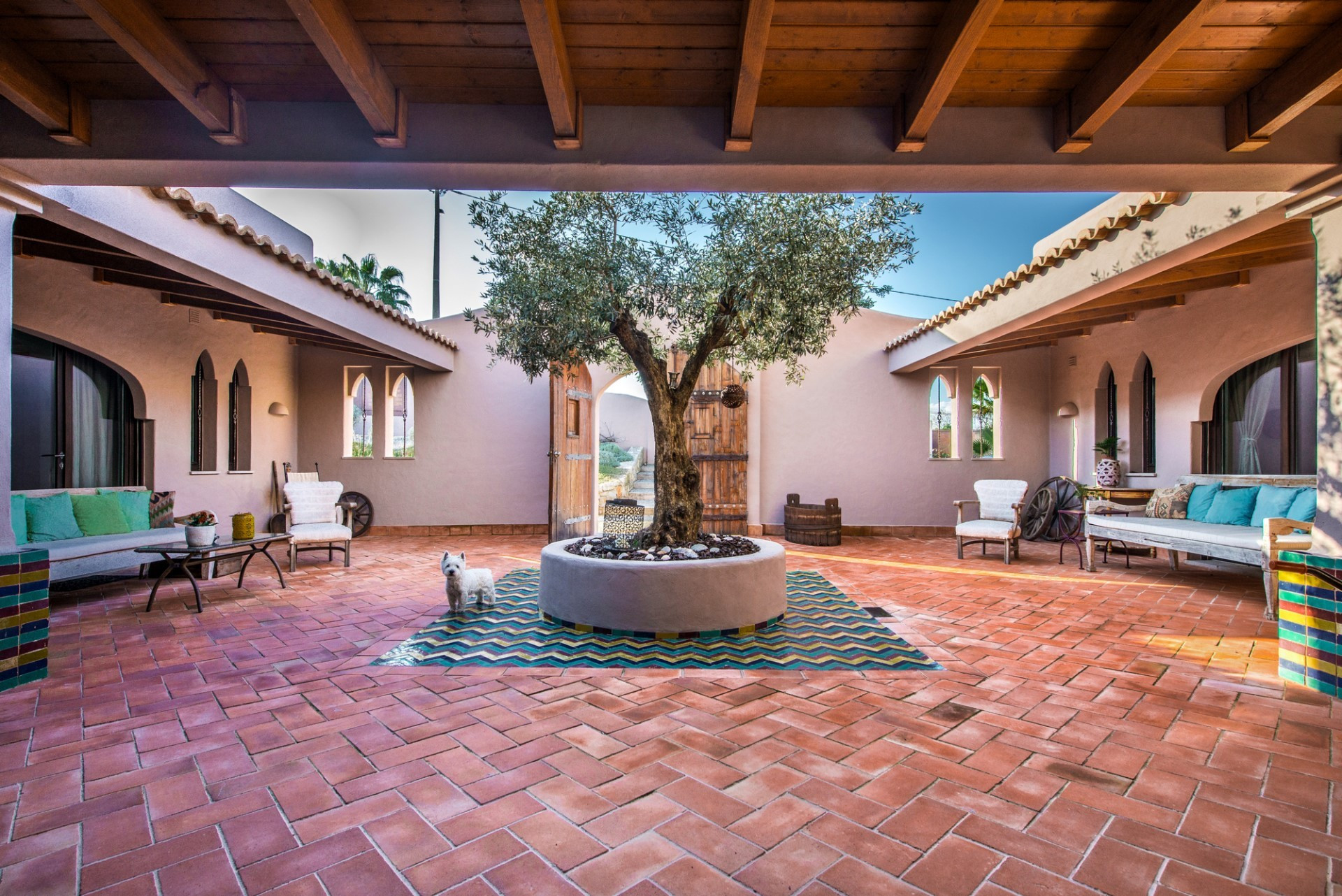 El patio cerrado de estilo morisco es la entrada a la casa y tiene una zona exterior con un olivo en el centro.
