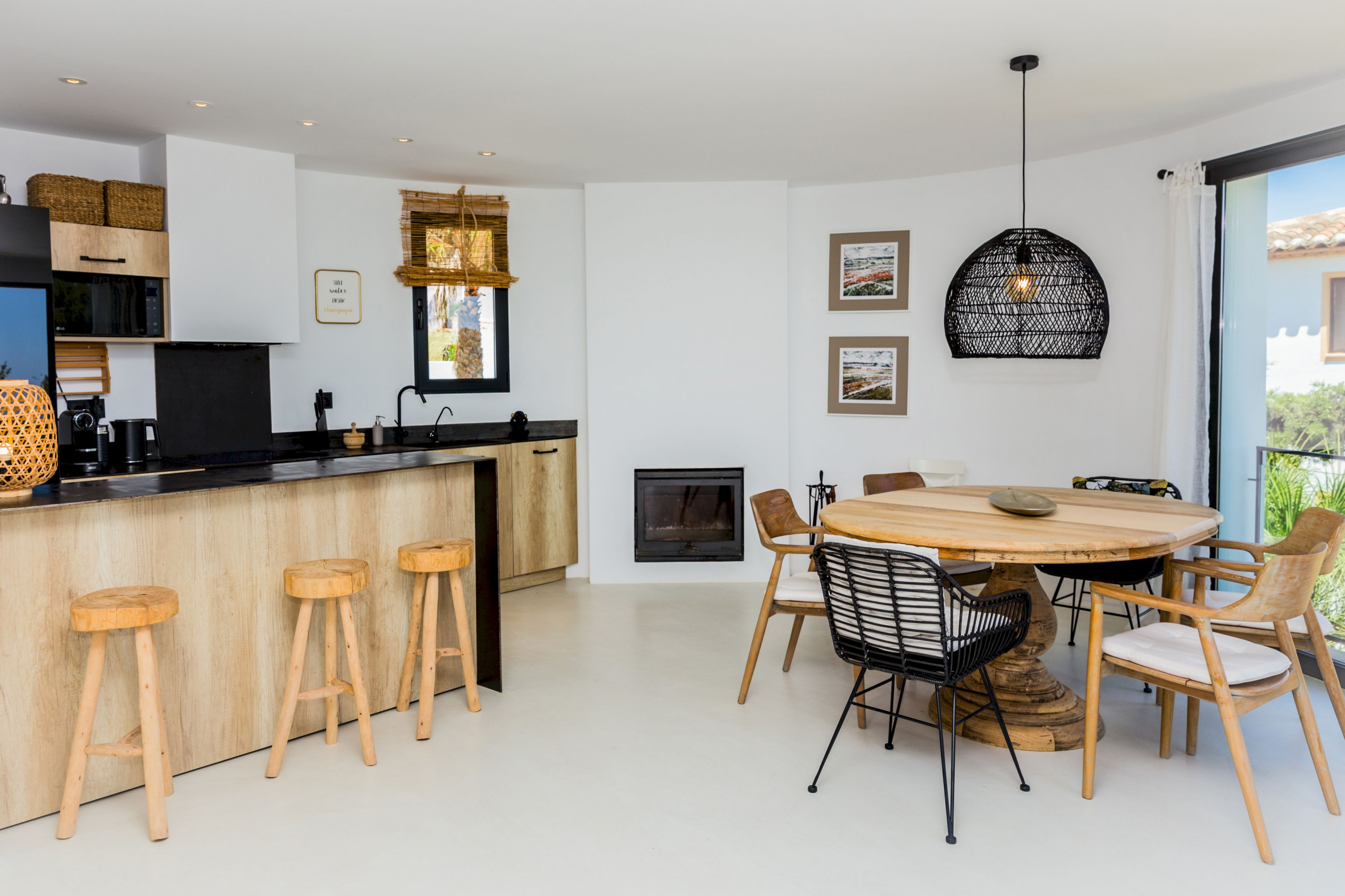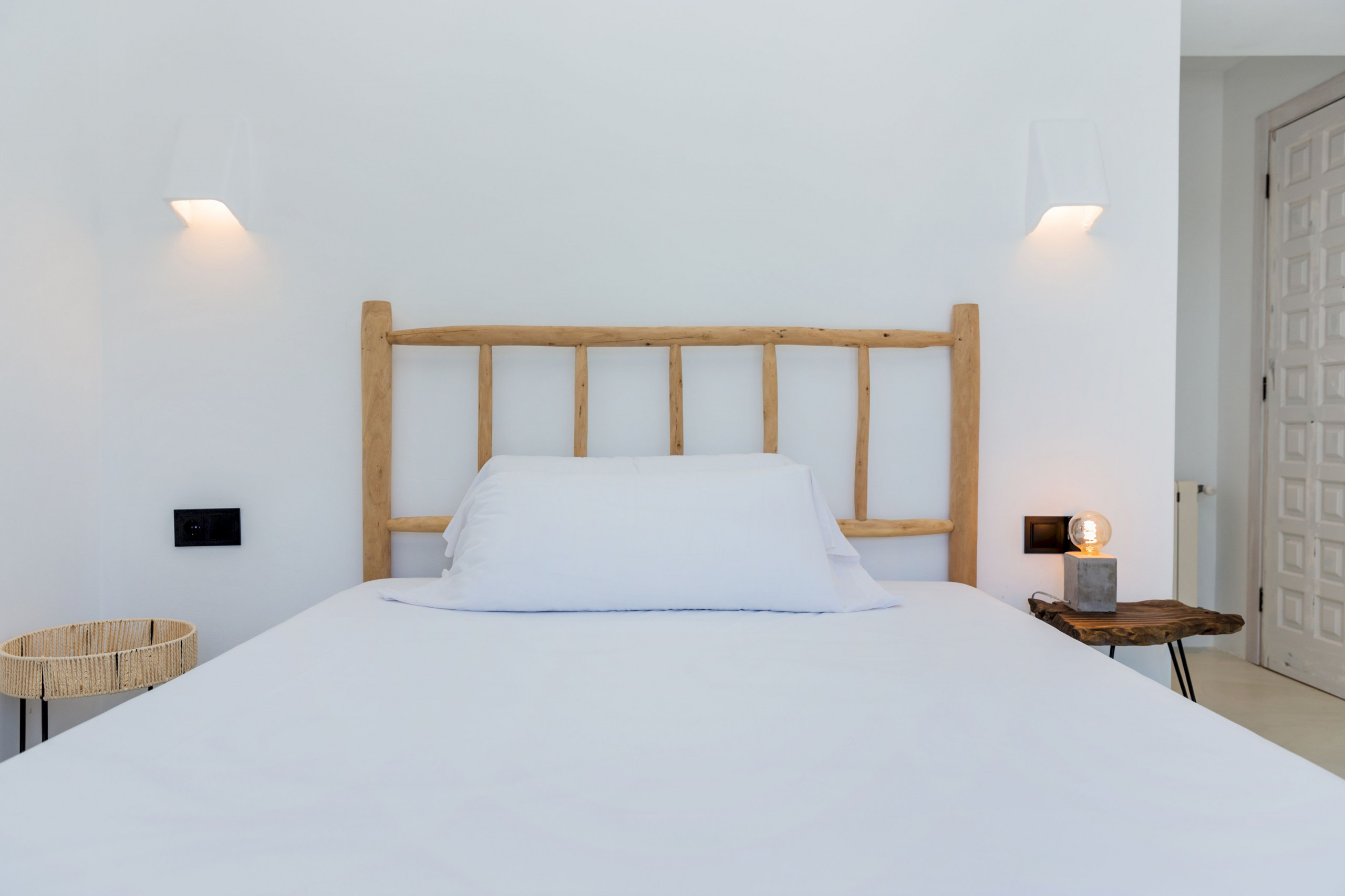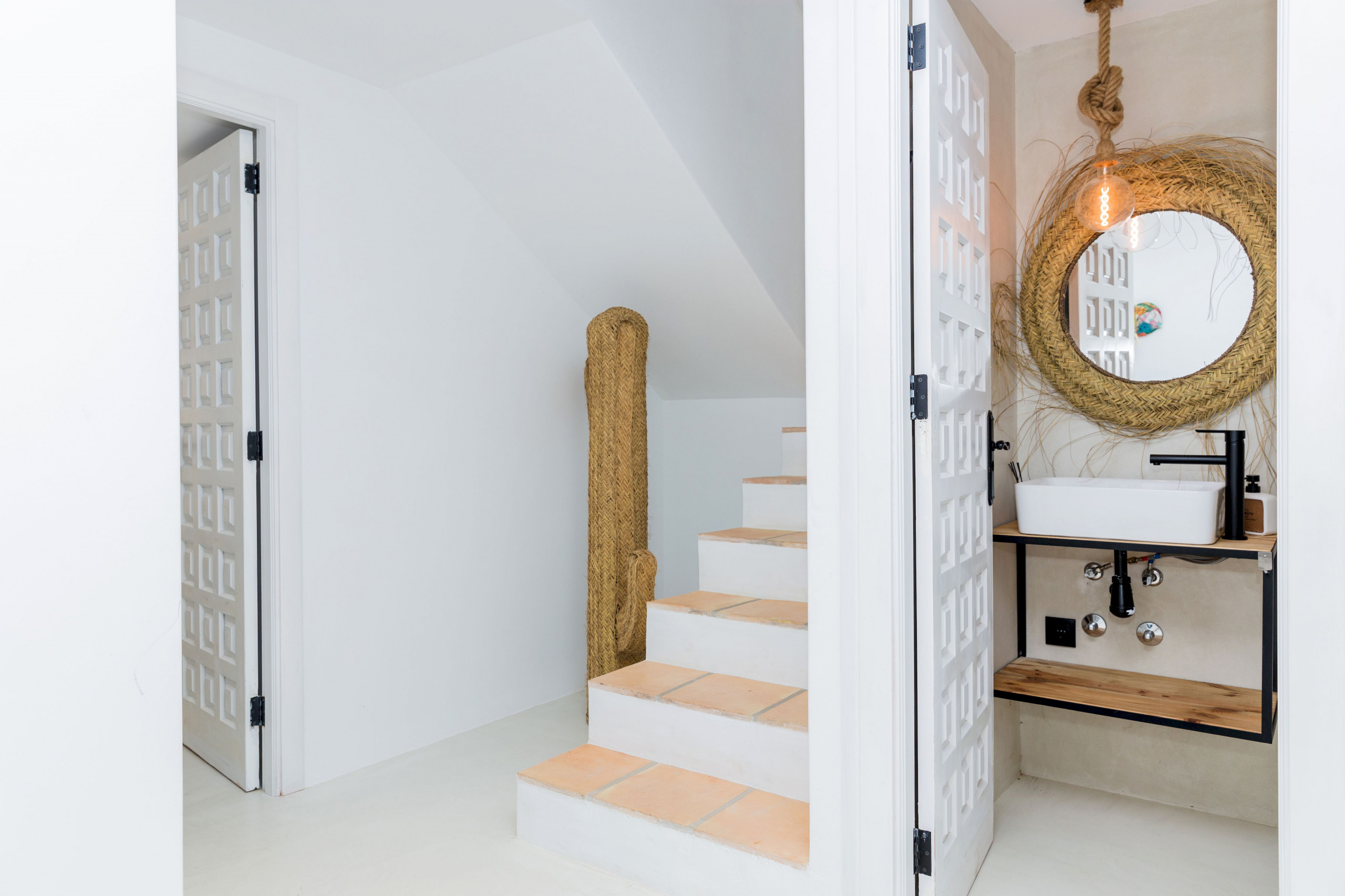 En la planta principal, a la que se accede directamente desde la calle, la villa ofrece un luminoso salón con un amplio sofá modular para relajarse, aire acondicionado, Smart TV y WiFi gratis. Los grandes ventanales del salón dan salida a una estupenda terraza con hamaca, sillas y vistas al mar, desde la que se sube al maravilloso solárium con una zona chill out con cama balinesa e increíbles vistas. Junto al salón, el espacio abierto da lugar a una elegante mesa de comedor de madera y la cocina con barra americana, que está totalmente equipada con inducción, microondas, horno, lavavajillas, menaje completo y utensilios de cocina. En esta misma planta hay uno de los aseos y una habitación de matrimonio con baño en suite. El segundo aseo y los otros tres dormitorios, cada uno con su baño en suite, se encuentran en la planta inferior. Todos los dormitorios cuentan con camas de matrimonio tamaño queen, baño en suite y aire acondicionado.