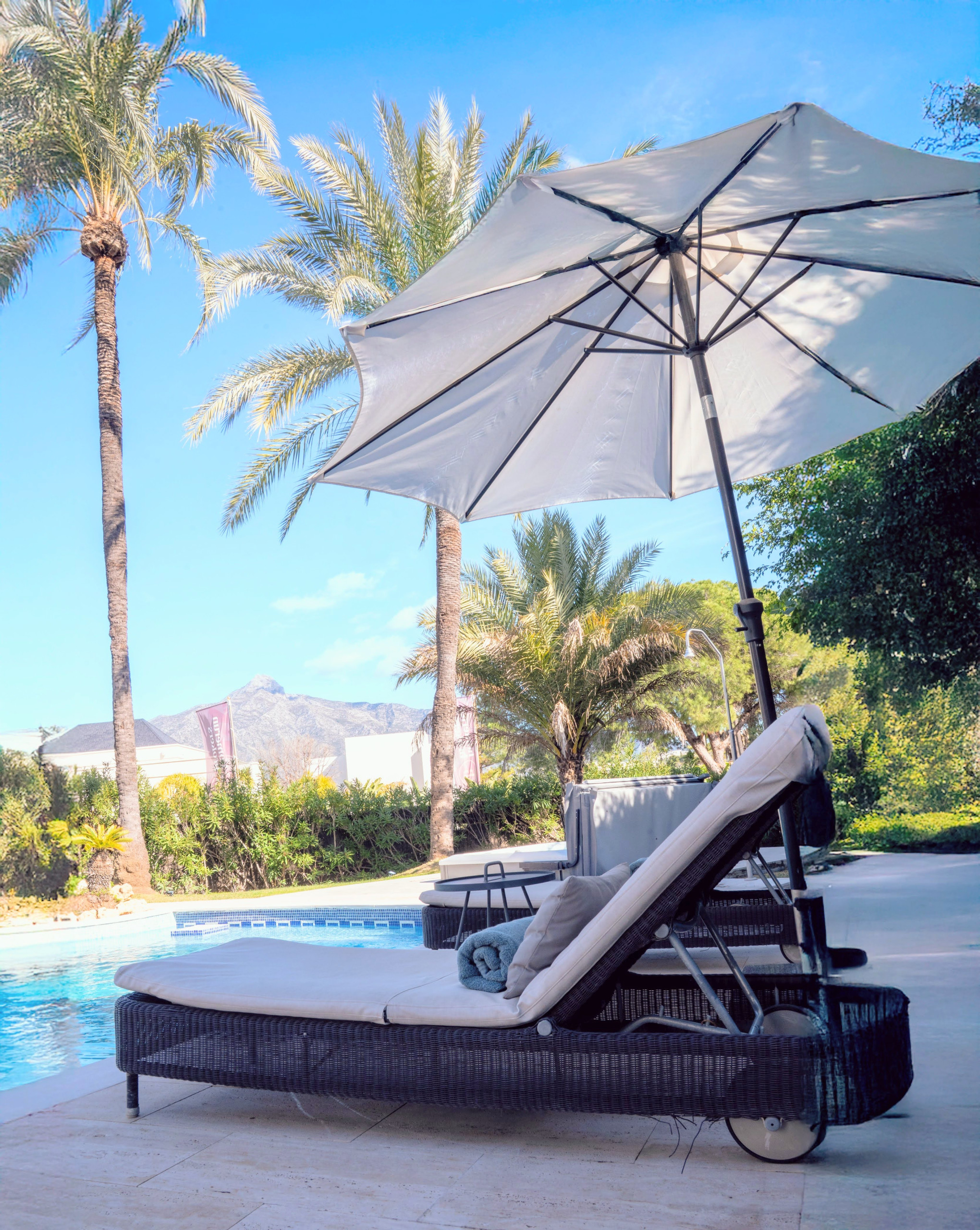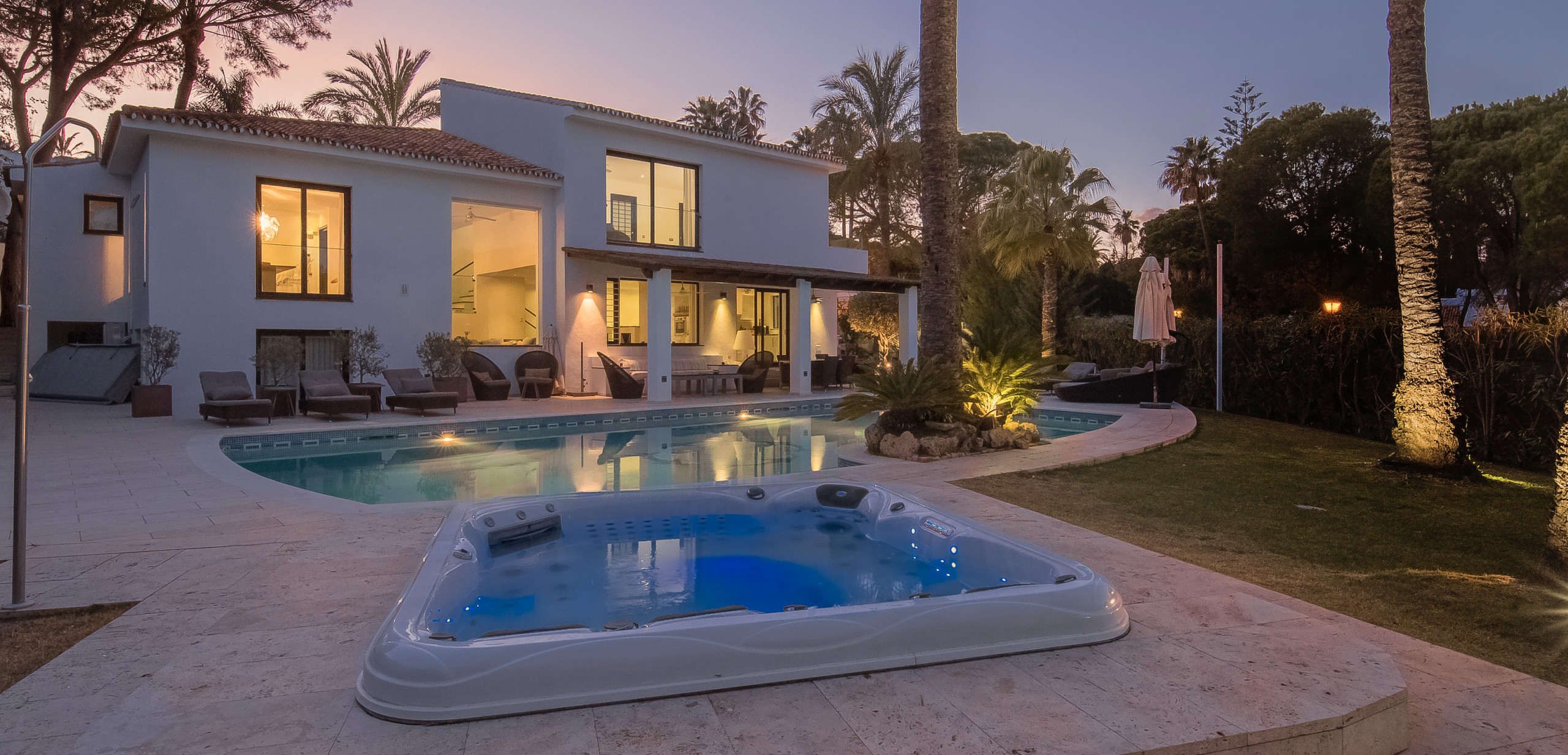 La villa cuenta con una gran piscina que se puede calentar en los meses de invierno, así como un jacuzzi, tumbonas, sombrillas y cómodos muebles de exterior.
