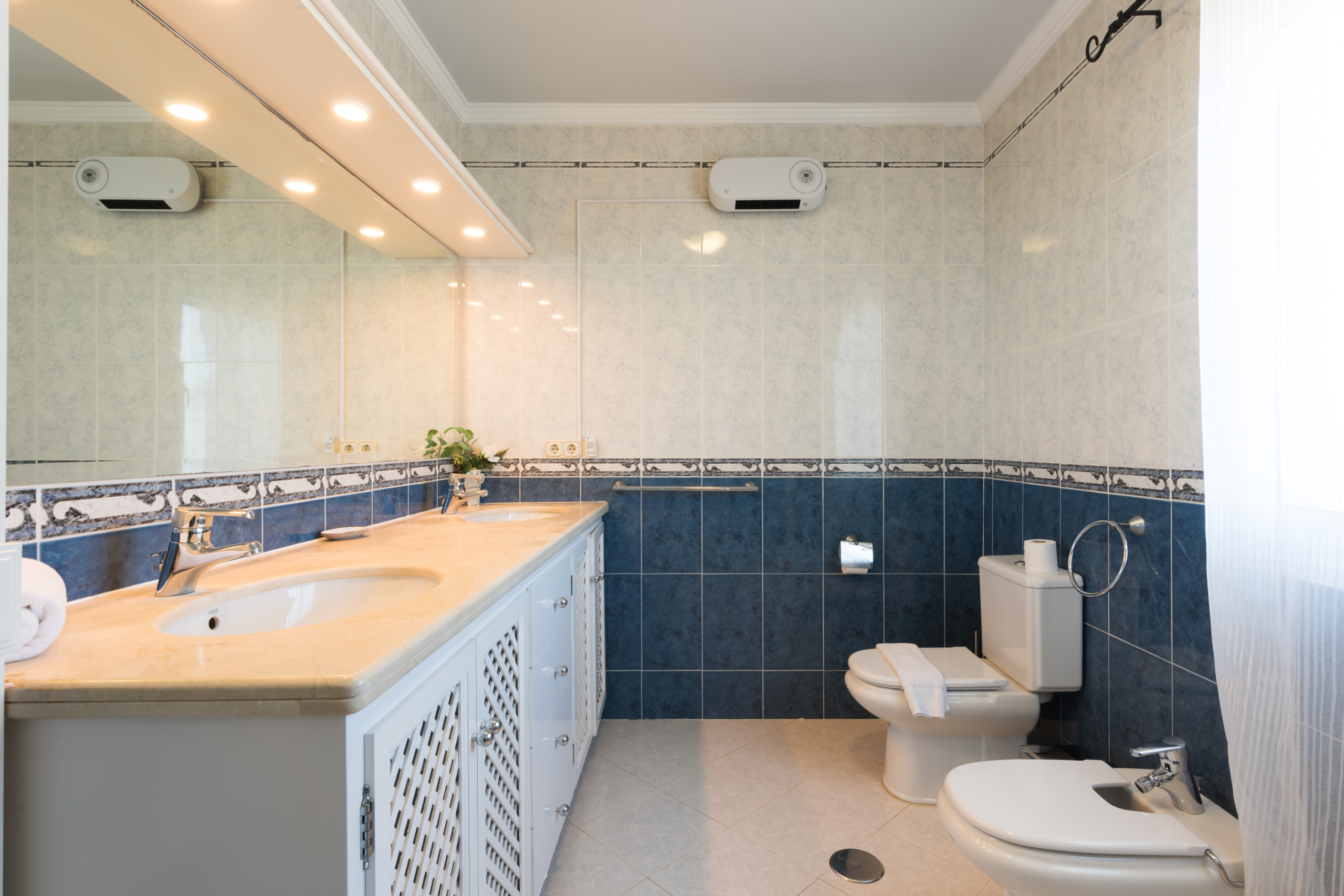 Dormitorio principal: Cama doble, armario, aire acondicionado, baño en suite con ducha