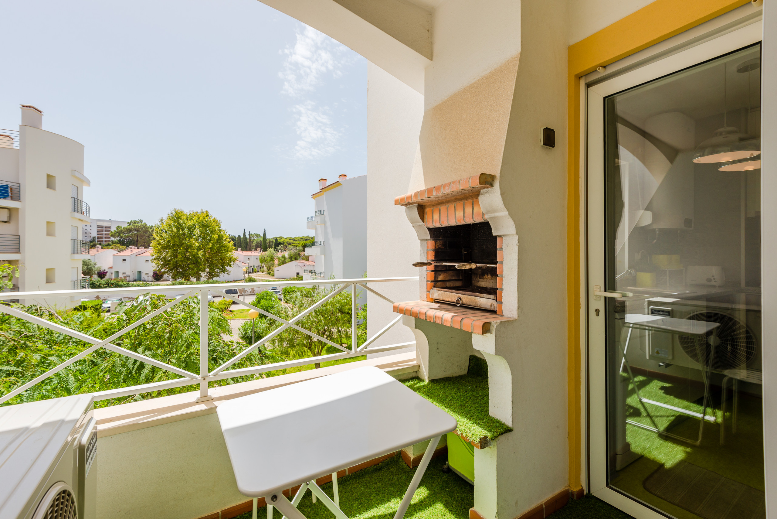 L'appartement offre une vue sur le jardin. Il y a à la fois un coin salon et un coin repas avec balcon, sièges extérieurs et barbecue.