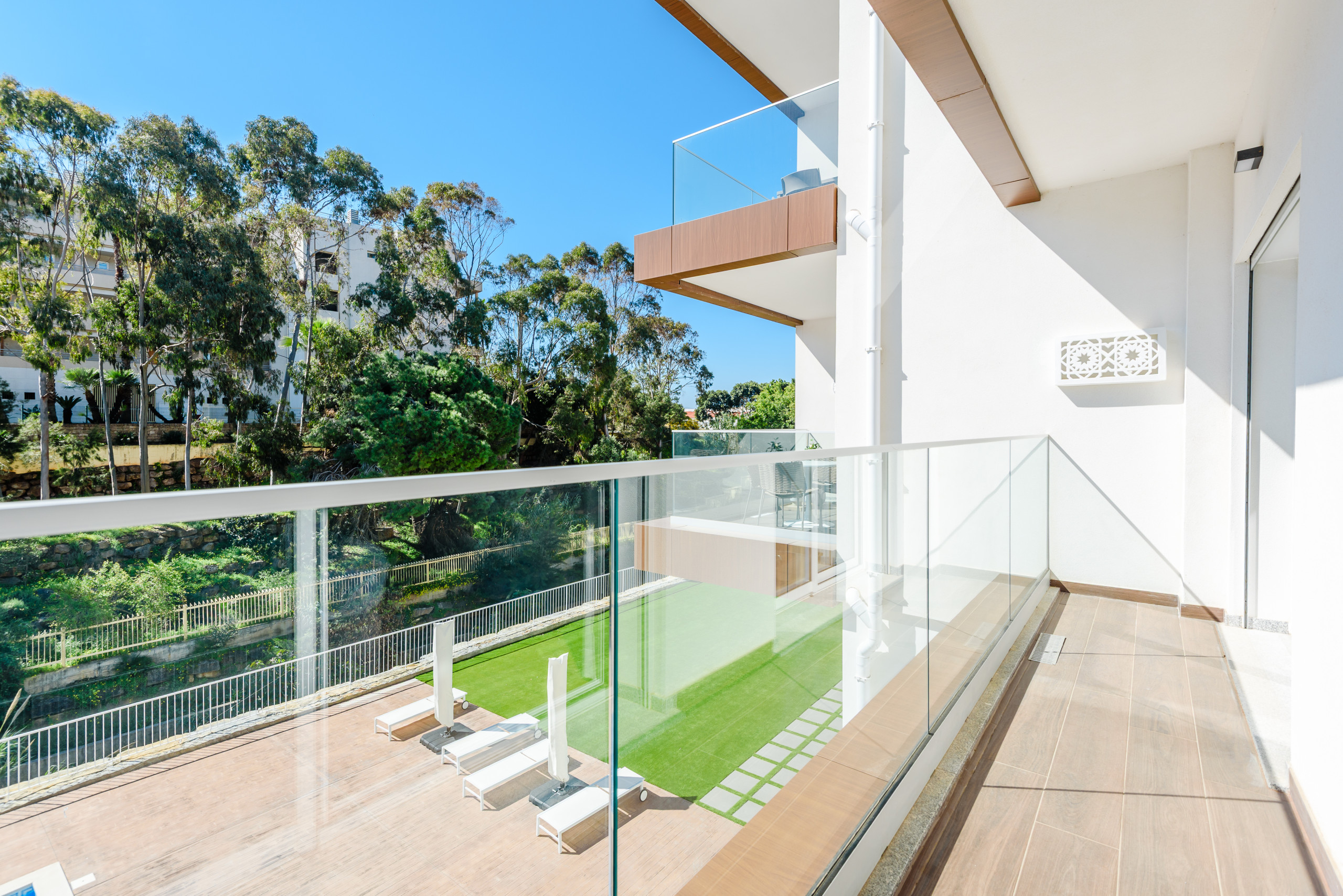 L'une des caractéristiques marquantes est le cadre paisible. La piscine est située un niveau en dessous de l'appartement, garantissant à la fois l'intimité et le calme, sans visibilité directe sur la propriété. Les invités ont également accès à une terrasse sur le toit, où l'on peut profiter d'une vue sur l'océan.