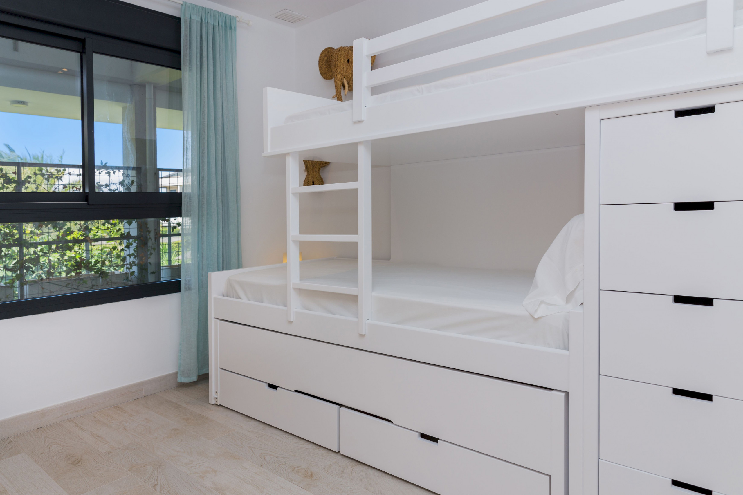 El apartamento es precioso en conjunto, la terraza un lujo, el equipamiento de todo lo necesario tanto en cocina como en las habitaciones, Tiene dos baños. La decoración de 10. Dispone de cuentos, juegos de mesa, plancha y tabla, etc. Está en una finca muy bonita, tranquila y con todas las comodidades. Horario de piscina muy amplio. El trato de Andrés especialmente, también de Almudena, que estuvieron pendientes de cualquier particularidad.