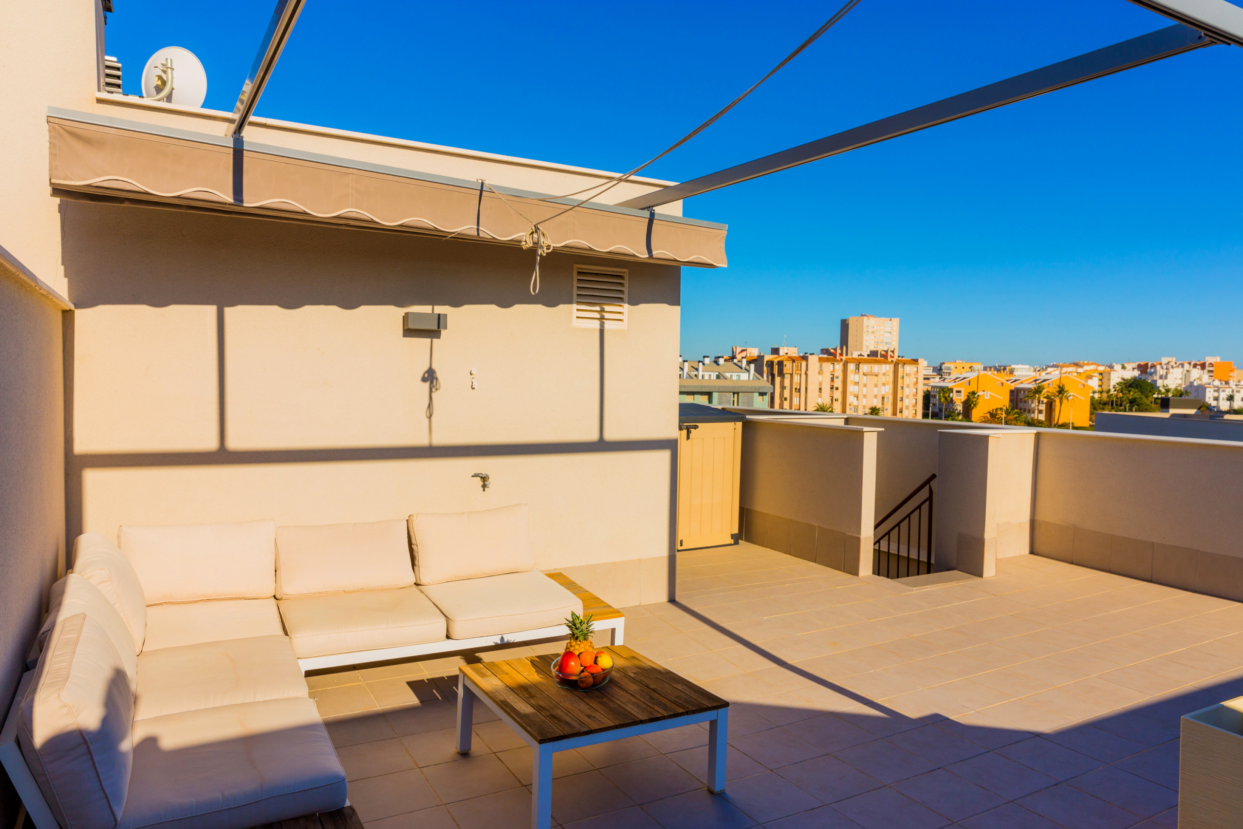 L'appartement propose également une cuisine américaine très moderne et entièrement équipée avec réfrigérateur, micro-ondes, four, congélateur, lave-linge, lave-vaisselle, vaisselle et couverts, ustensiles de cuisine, cafetière, grille-pain, bouilloire, presse-agrumes et assiettes et bols. Le salon, décoré avec goût, dispose d'une table à manger et d'un canapé confortable, d'une TV satellite à écran plat, du WiFi gratuit et de portes doubles s'ouvrant sur une merveilleuse terrasse extérieure avec un grand auvent, une table pour manger et une zone de détente. Toutes les pièces sont équipées de la climatisation pour rafraîchir les chambres et permettre de se détendre pendant ces journées d'été chaudes. De plus, en montant quelques escaliers, on accède à un incroyable toit-terrasse avec des canapés et une vue dégagée pour profiter pleinement de l'été. Dans les parties communes de la résidence se trouve un jardin avec une grande piscine et une zone peu profonde pour les enfants.