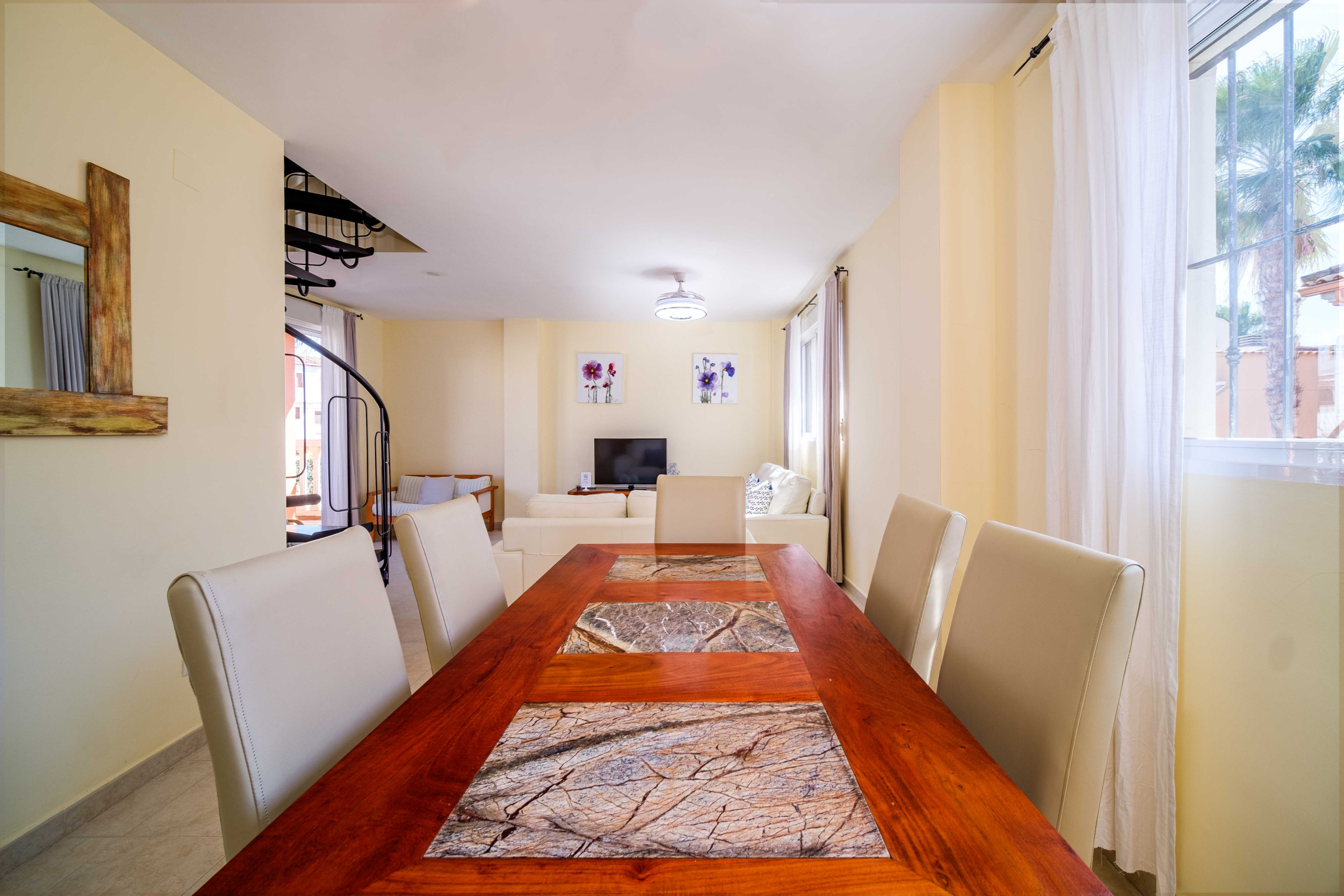 Au niveau principal où l'ensemble du logement est distribué, se trouve le grand salon-salle à manger avec des canapés confortables, une Smart TV, une grande table en bois avec des chaises, le WiFi gratuit et de grandes fenêtres qui s'ouvrent sur une belle terrasse couverte avec une table de salle à manger extérieure. La cuisine indépendante, avec également une sortie sur la terrasse, est entièrement équipée avec une plaque vitrocéramique, un réfrigérateur, un micro-ondes, un four, un congélateur, un lave-linge, un lave-vaisselle, de la vaisselle et des couverts, des ustensiles de cuisine, une cafetière, un grille-pain, un bouilloire, un presse-agrumes et des assiettes et bols. De plus, l'appartement propose trois belles chambres, dont une avec deux lits individuels côte à côte et une salle de bain attenante avec baignoire. Les deux autres chambres ont deux lits individuels chacune et sont situées à côté d'une autre salle de bain complète avec douche. Toutes les pièces disposent de la climatisation et du chauffage par conduits avec accès à la terrasse. Depuis le salon, on accède par un escalier en colimaçon au solarium offrant de magnifiques vues sur la montagne.