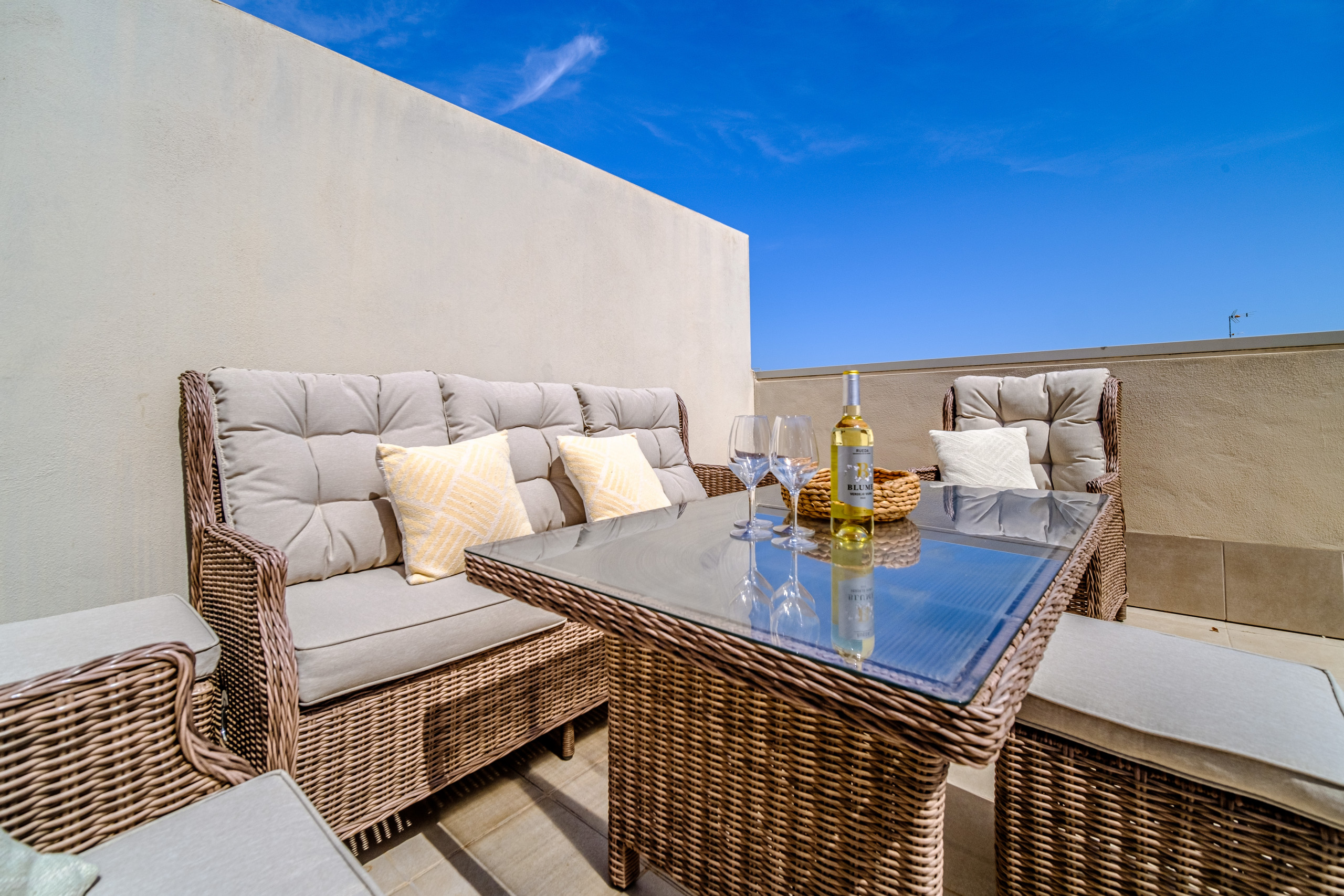 À l'étage supérieur, se trouve la troisième chambre avec un autre lit Queen Size et une salle de bain supplémentaire avec douche. En outre, à cet étage, vous profiterez d'une grande terrasse avec une table et des chaises d'extérieur, une zone de barbecue et des canapés confortables pour vous détendre.