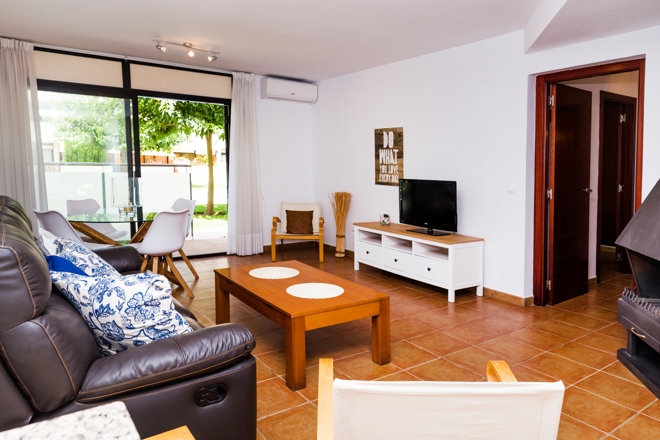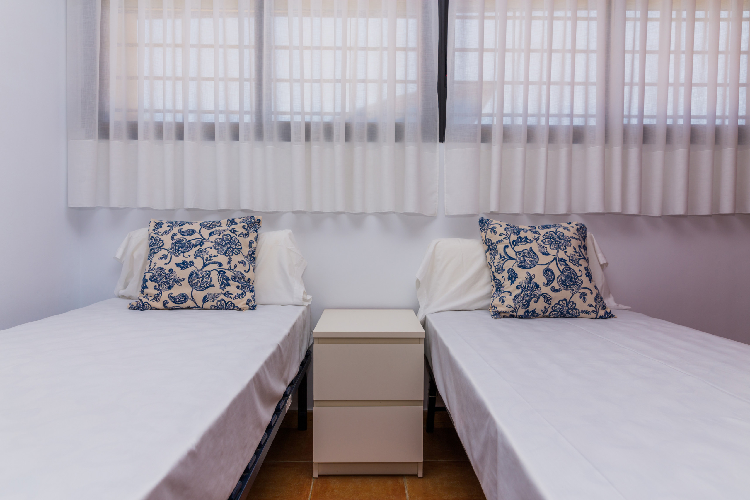 L'appartement, réparti sur un seul niveau, offre une cuisine indépendante entièrement équipée avec réfrigérateur, micro-ondes, four, congélateur, lave-vaisselle, vaisselle et couverts, ustensiles de cuisine, cafetière, grille-pain, bouilloire, presse-agrumes et assiettes et bols. Le salon confortable dispose d'une table à manger en verre, d'un grand canapé, d'une TV à écran plat, du WiFi gratuit et de portes doubles qui s'ouvrent sur une petite terrasse avec un accès direct au jardin et à la piscine. De plus, le logement comprend une salle de bain avec douche, une belle chambre principale avec deux lits simples côte à côte et une deuxième chambre avec deux lits simples séparés. Le salon et la chambre principale sont équipés de la climatisation.