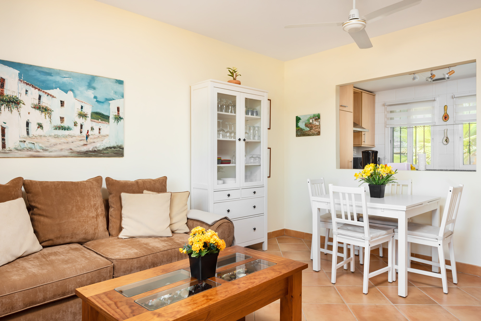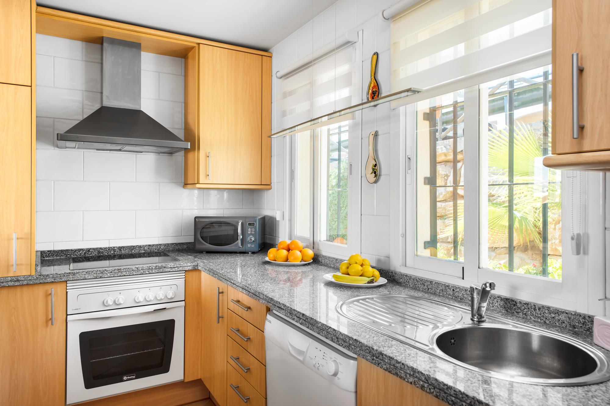 The kitchen is equipped with all the basic things and have oven, microwave, dishwasher, coffee machine, etc. Next to the kitchen you have the living room which contains a dining area and a cosy sofa area where there is TV with lots of different channels (Scandinavian, UK, German, etc.). There is direct access to the terrace which has garden furniture and sunbeds. From this terrace there is access to a large roof terrace and here you can enjoy meals at all times of the day while enjoying the beautiful view to the nearby mountains and Mediterranean Sea.