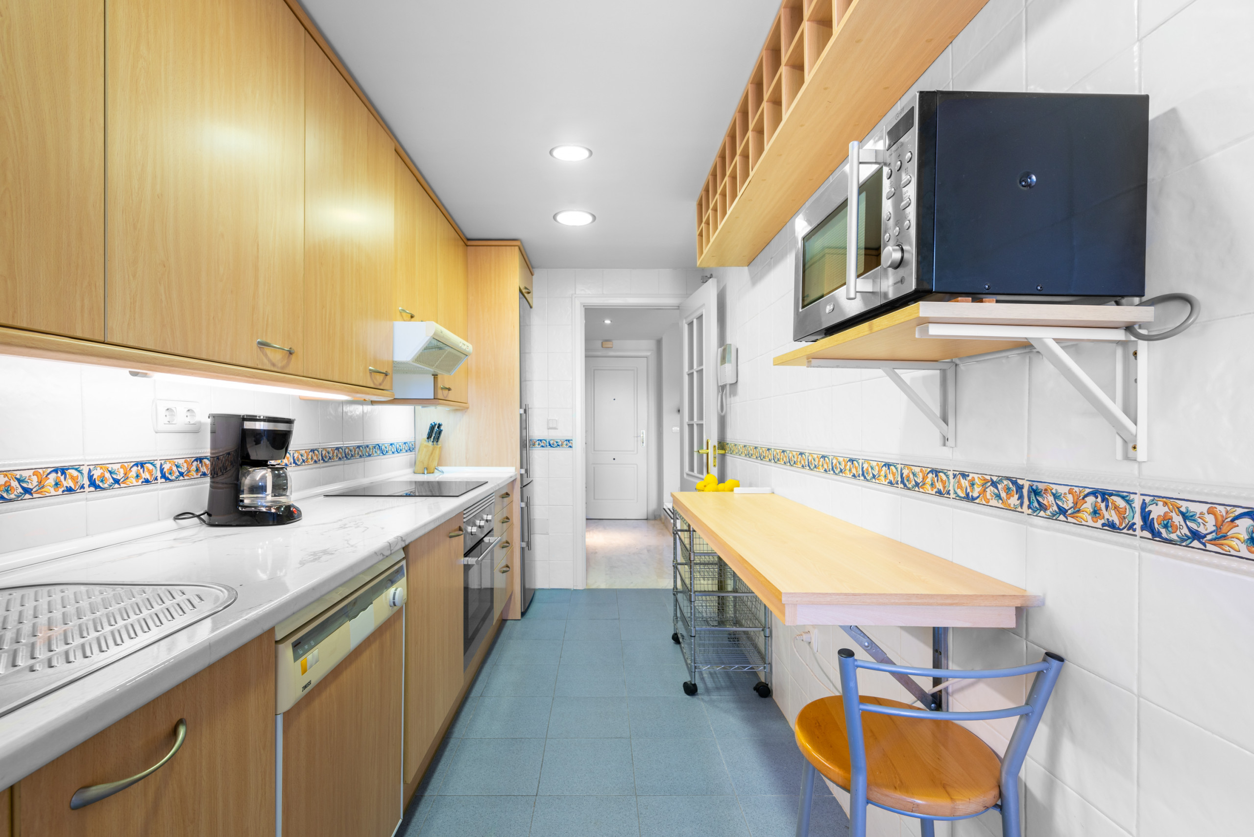 The ground floor contains a spacious open living room with sofa seating for 6 people. Through the living room a large sunny balcony and seating for four people. Perfect for an evening barbecue or light lunch in the sun. Just off the living room is a fully equipped kitchen which includes a dishwasher, washing machine, microwave oven etc.