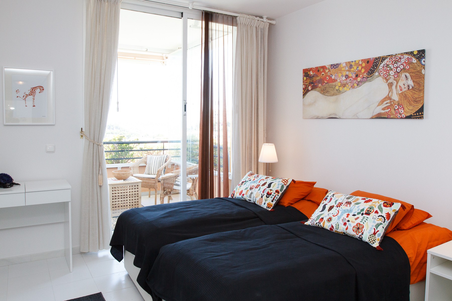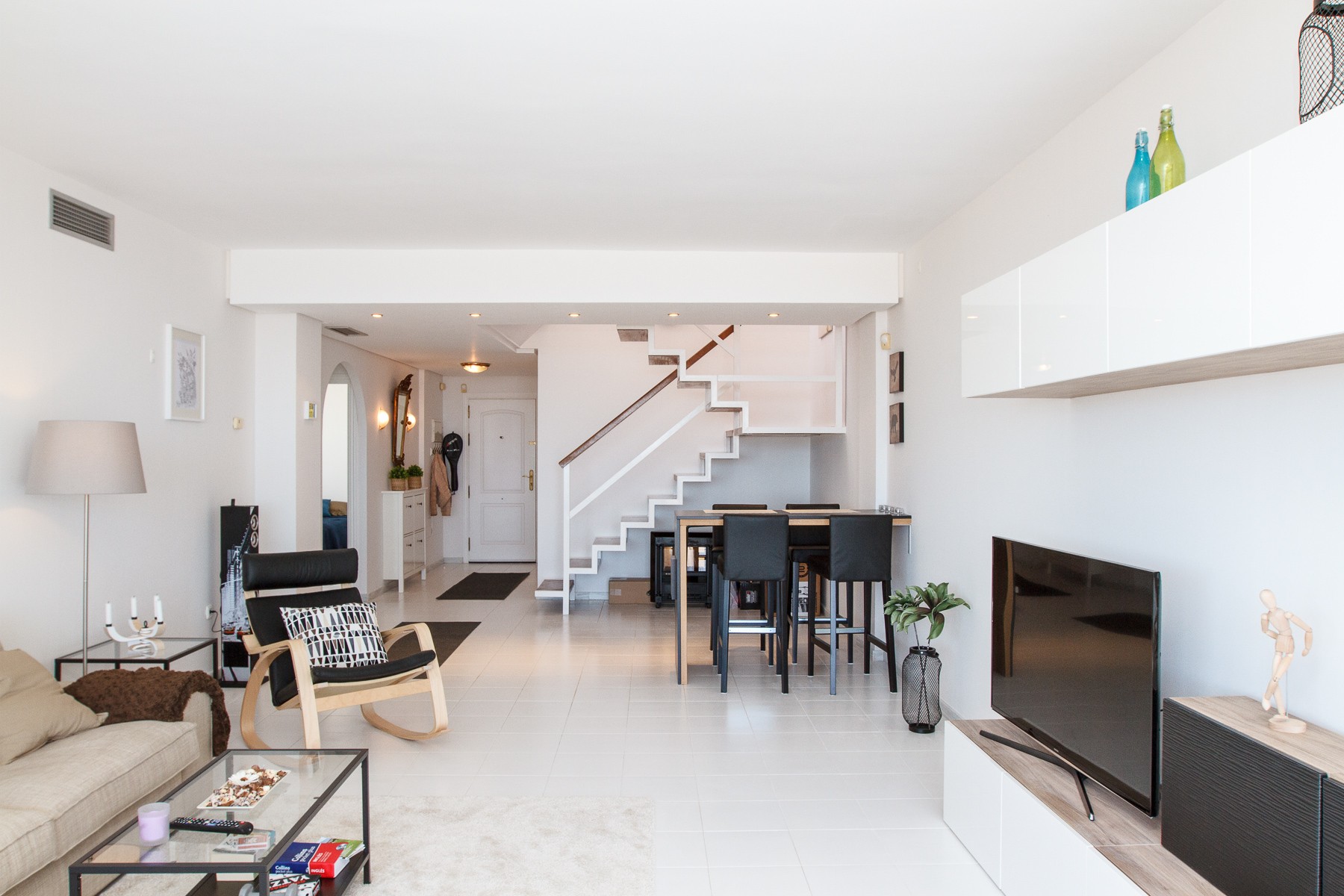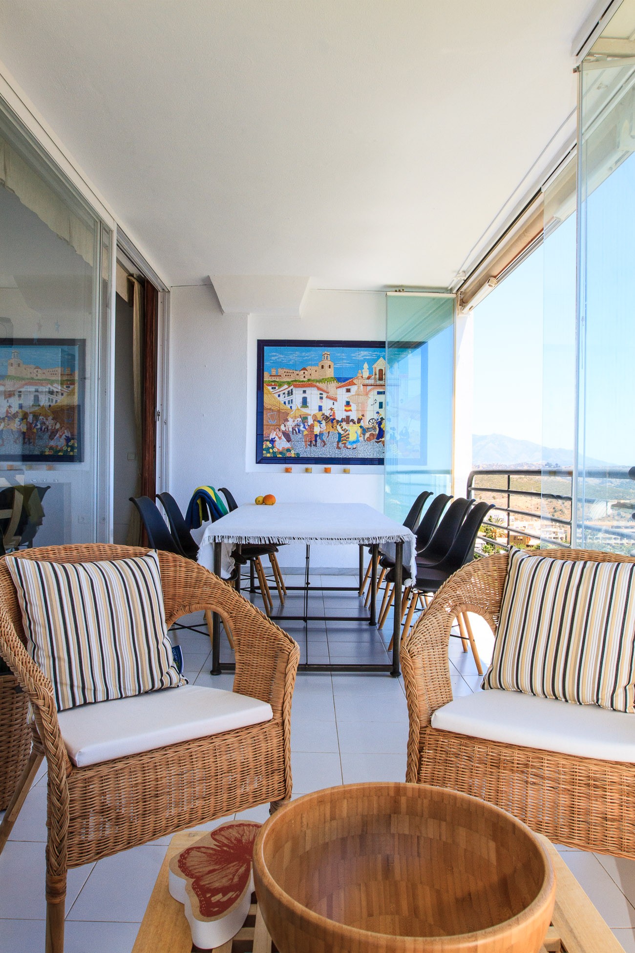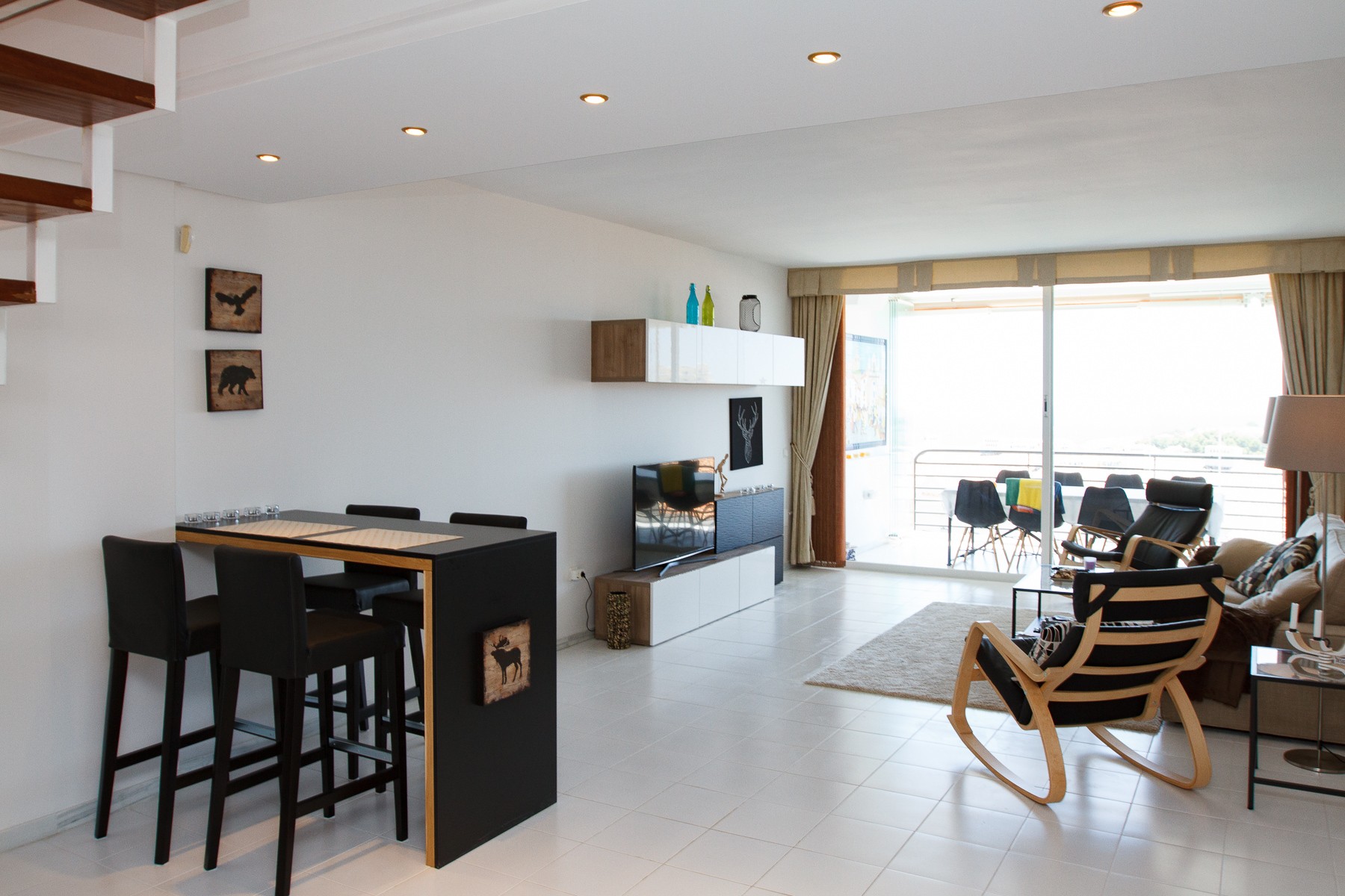 Nice entrance with direct access to bright and beautifully furnished living room with comfortable sofa, flat screen TV, Wifi and air conditioning. There is direct access to the south-facing terrace and the large floor-to-ceiling sliding glass doors provide both a fantastic light in the living room and a truly unique view of the golf course and the Mediterranean.