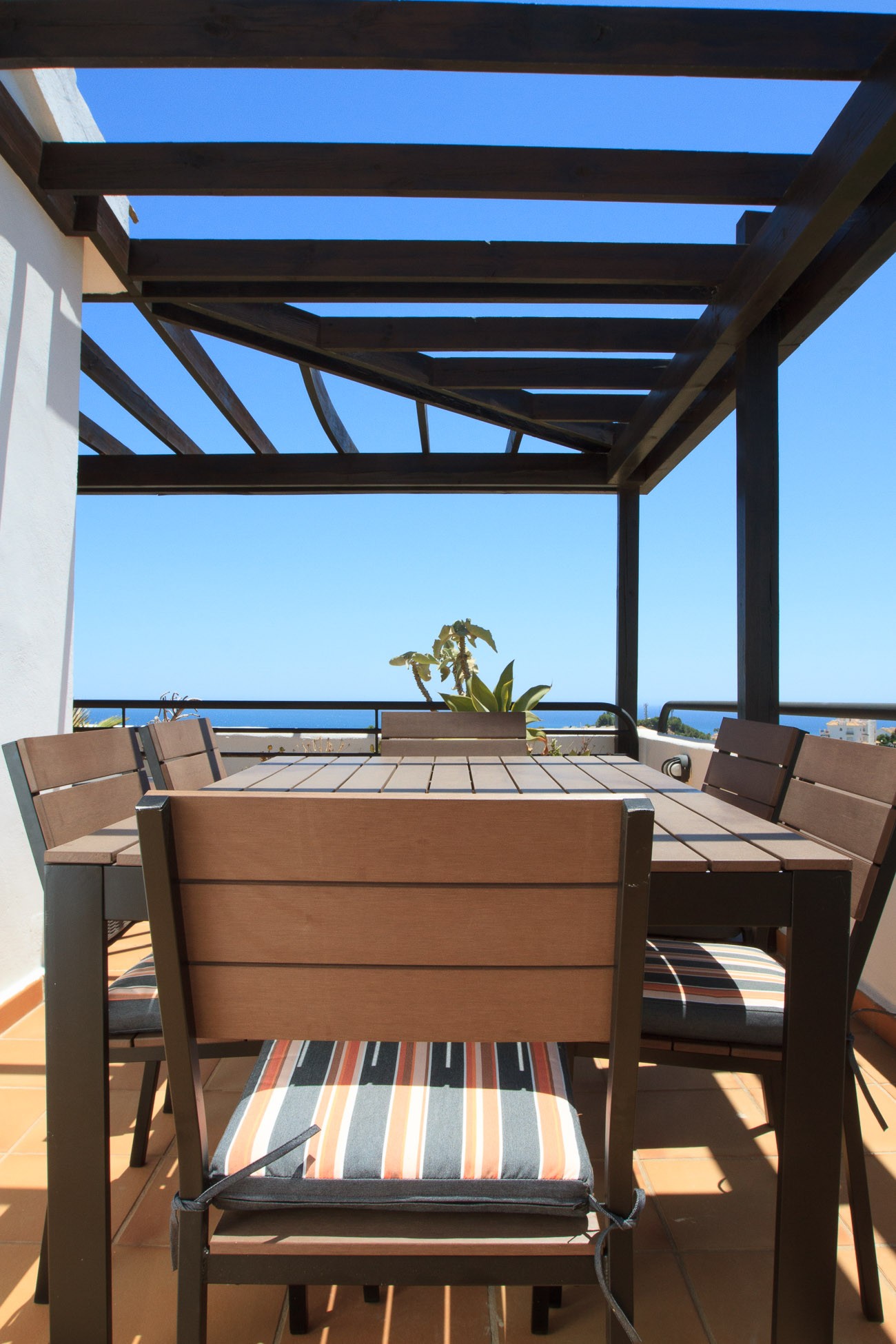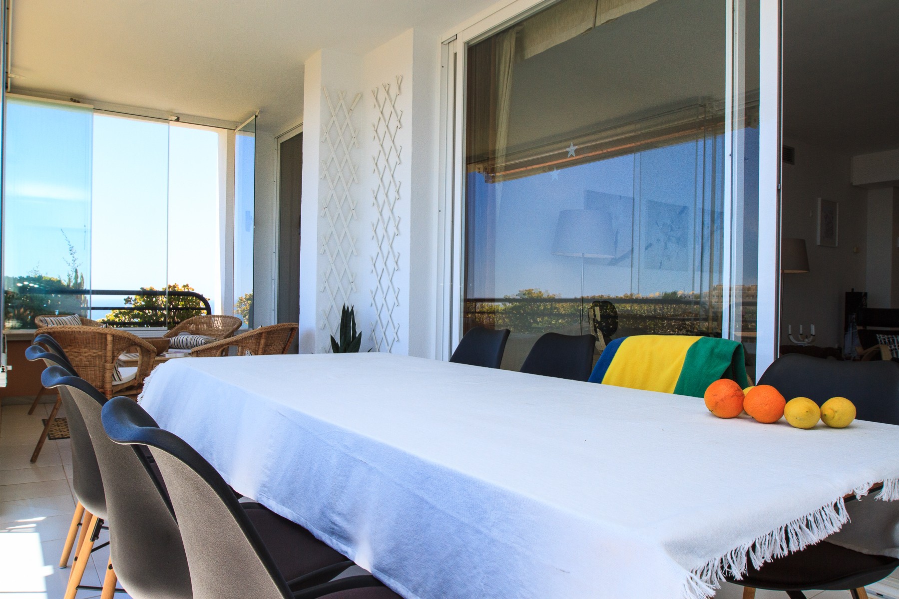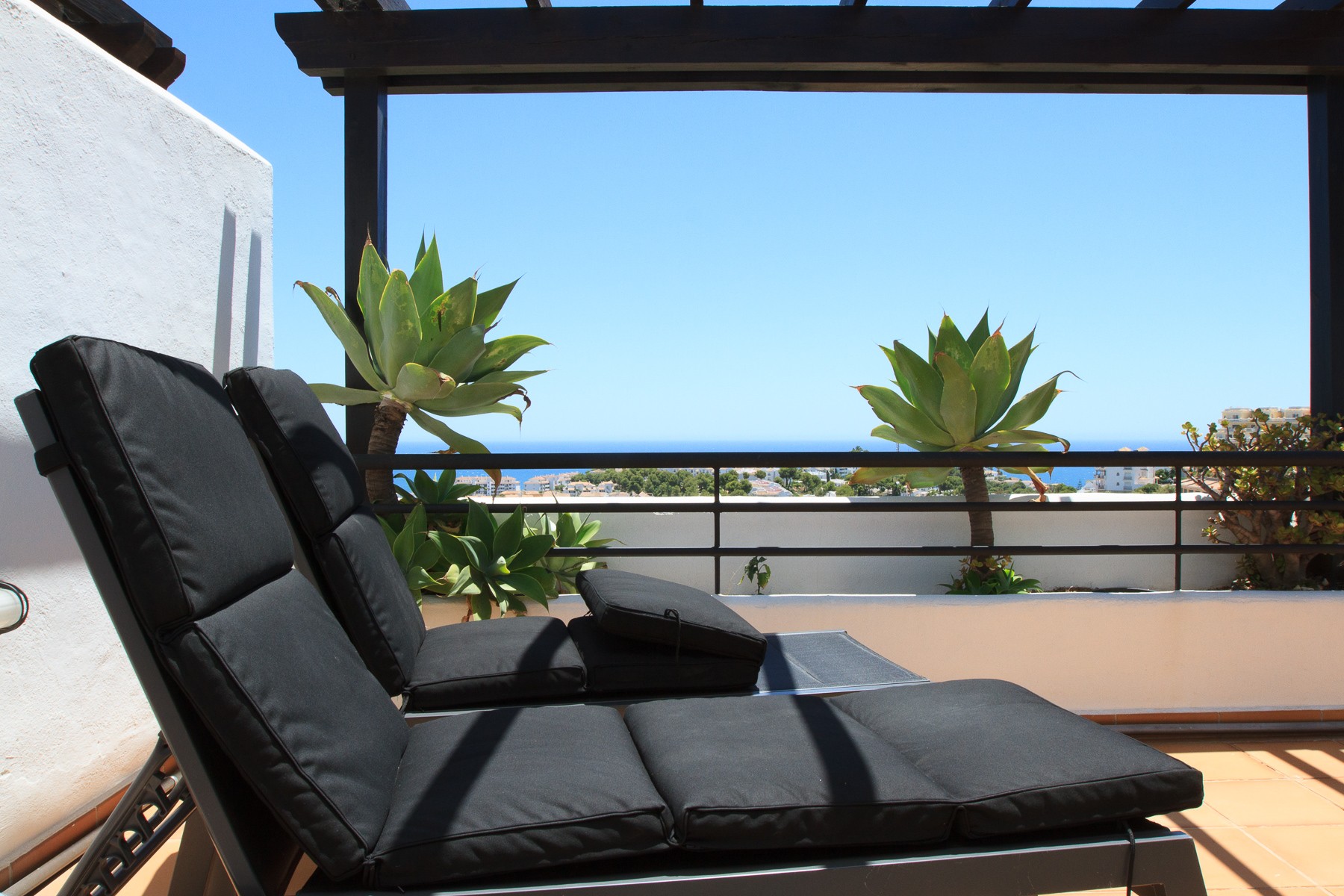 The terrace is very spacious with over 100m2 and divided into several sections. Just outside the bedroom you will find some sun loungers from which you can enjoy the sun almost all day. Dining table, charcoal grill and parasol and an outdoor lounge arrangement
