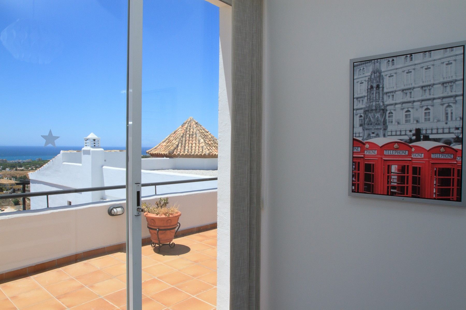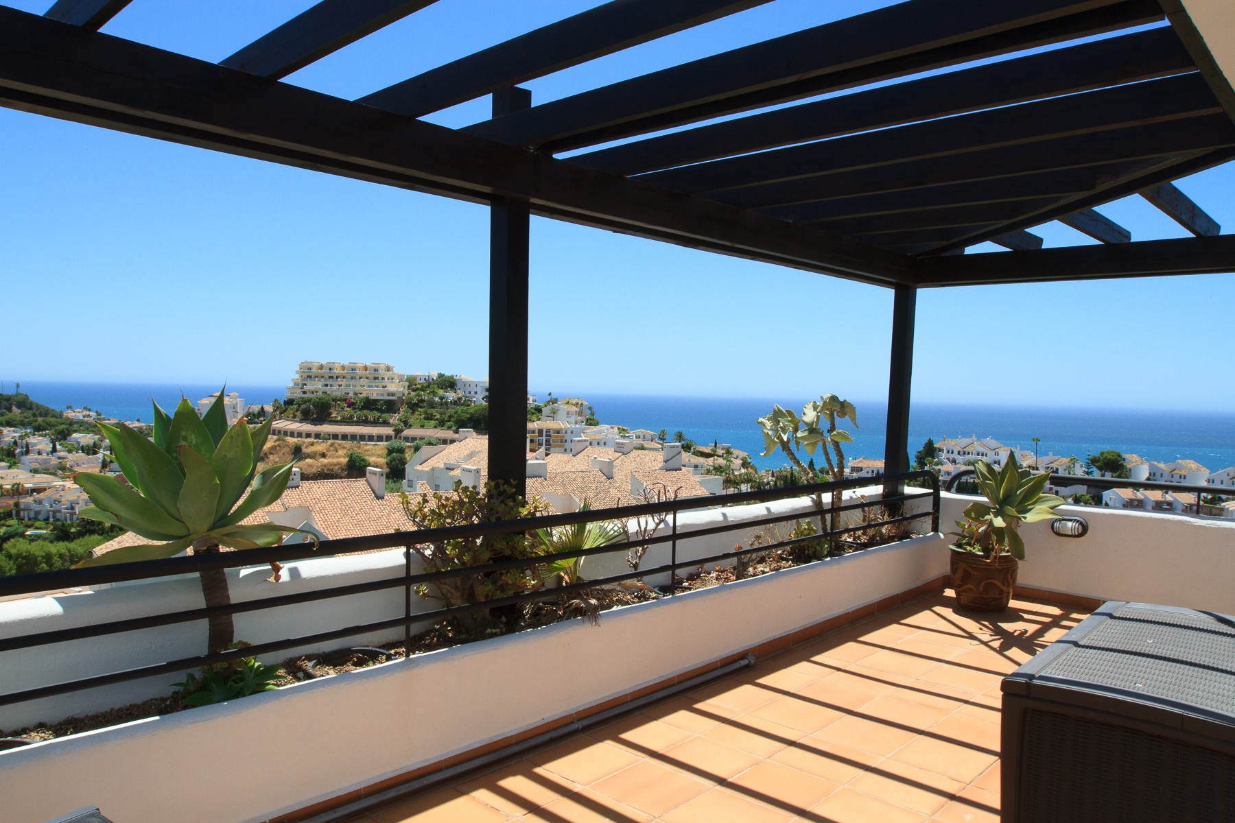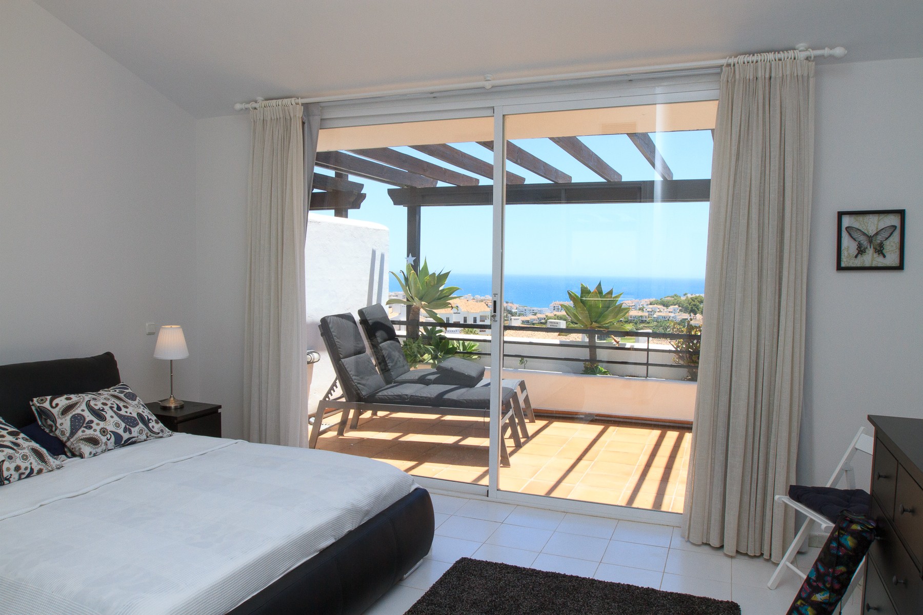 The upper floor contains; a spacious Master Bedroom with double bed, wardrobe, air conditioning, bathroom en-suite with tub. Direct access to the penthouse terrace with amazing views to the golf course, the mountains and the Mediterranean.