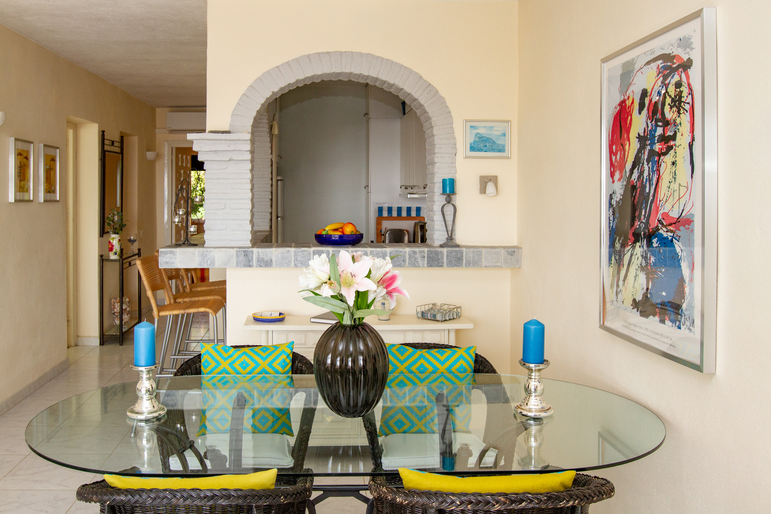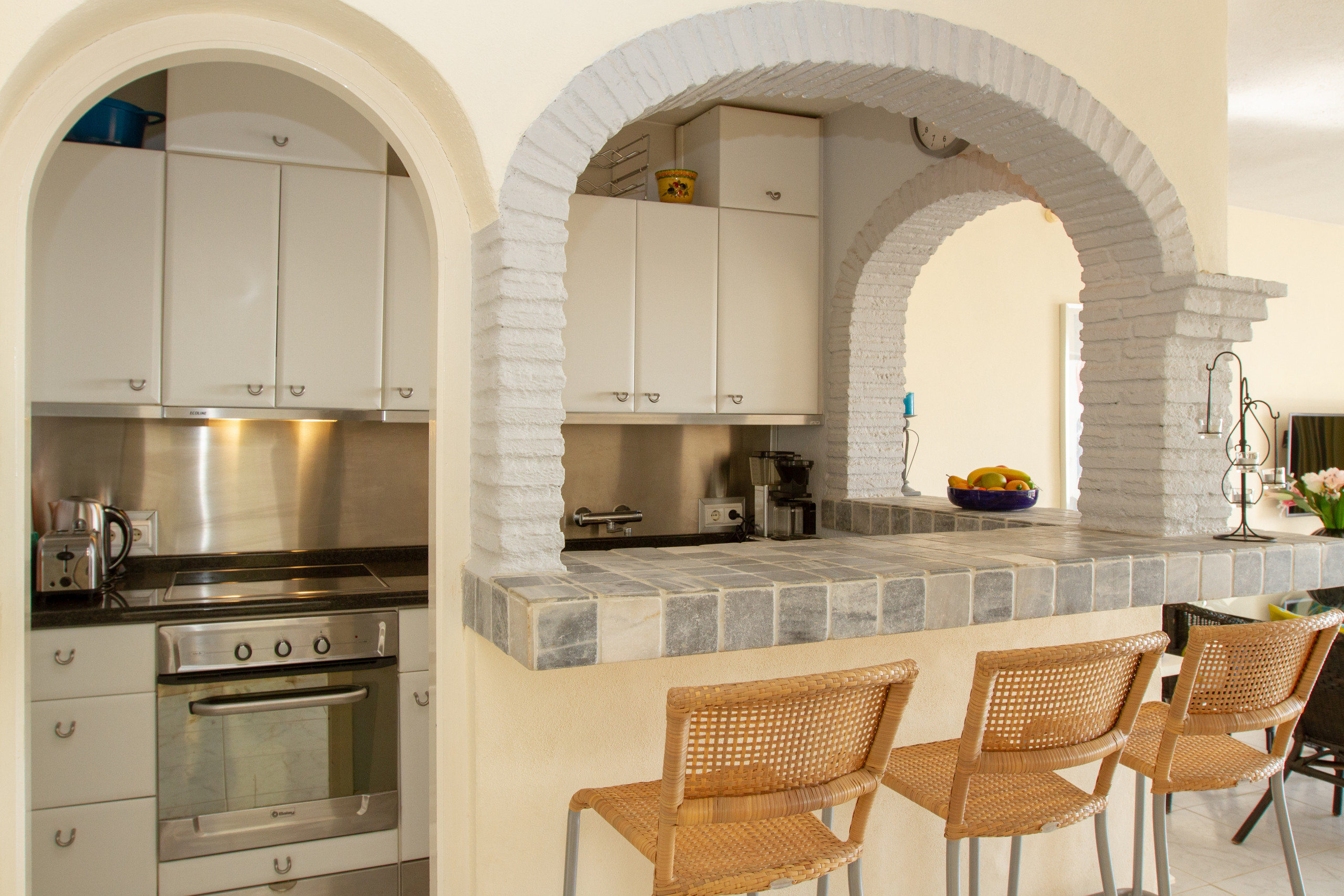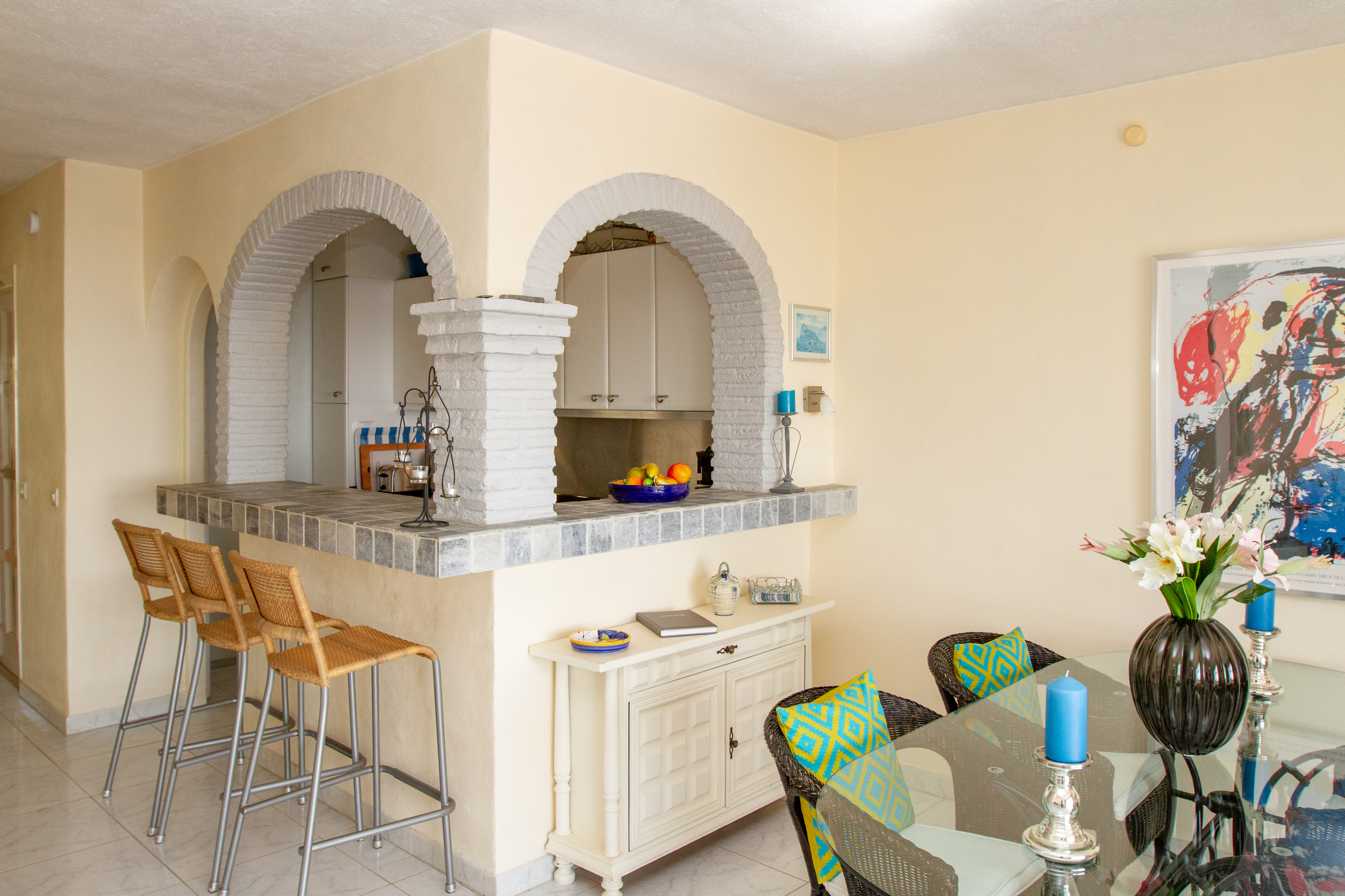 The kitchen is fully equipped with refrigerator, freezer, oven, etc. Next to the kitchen you have the living room which contains a dining area and a cosy sofa area, where you will find a TV with lots of different TV channels such as English, French, German, Russian, Scandinavian, etc.. From the living room there is direct access to the terrace where there is a beautiful view to the Mediterranean Sea. The terrace contains garden furniture where you can enjoy a meal.