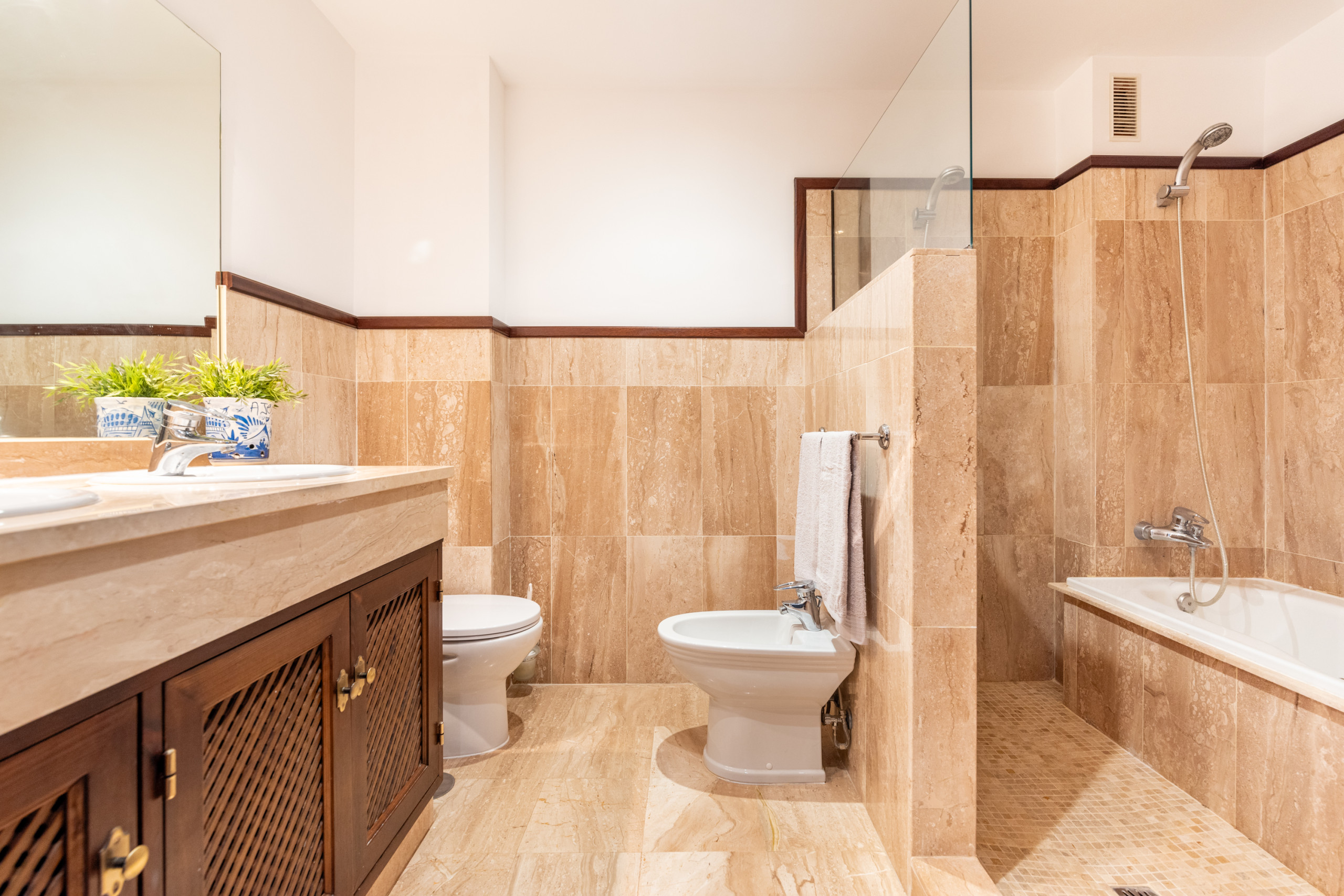 This apartment has 2 complete bathrooms, one in the main bedroom with a bathtub and a second bathroom with a shower.