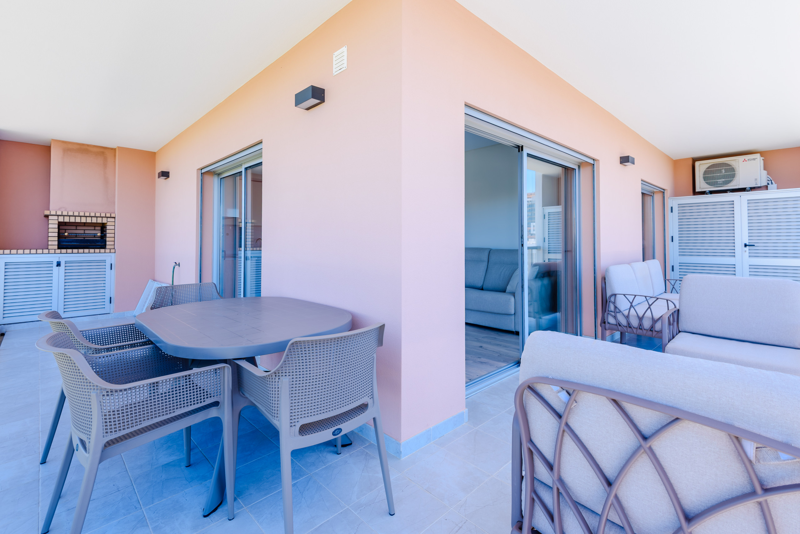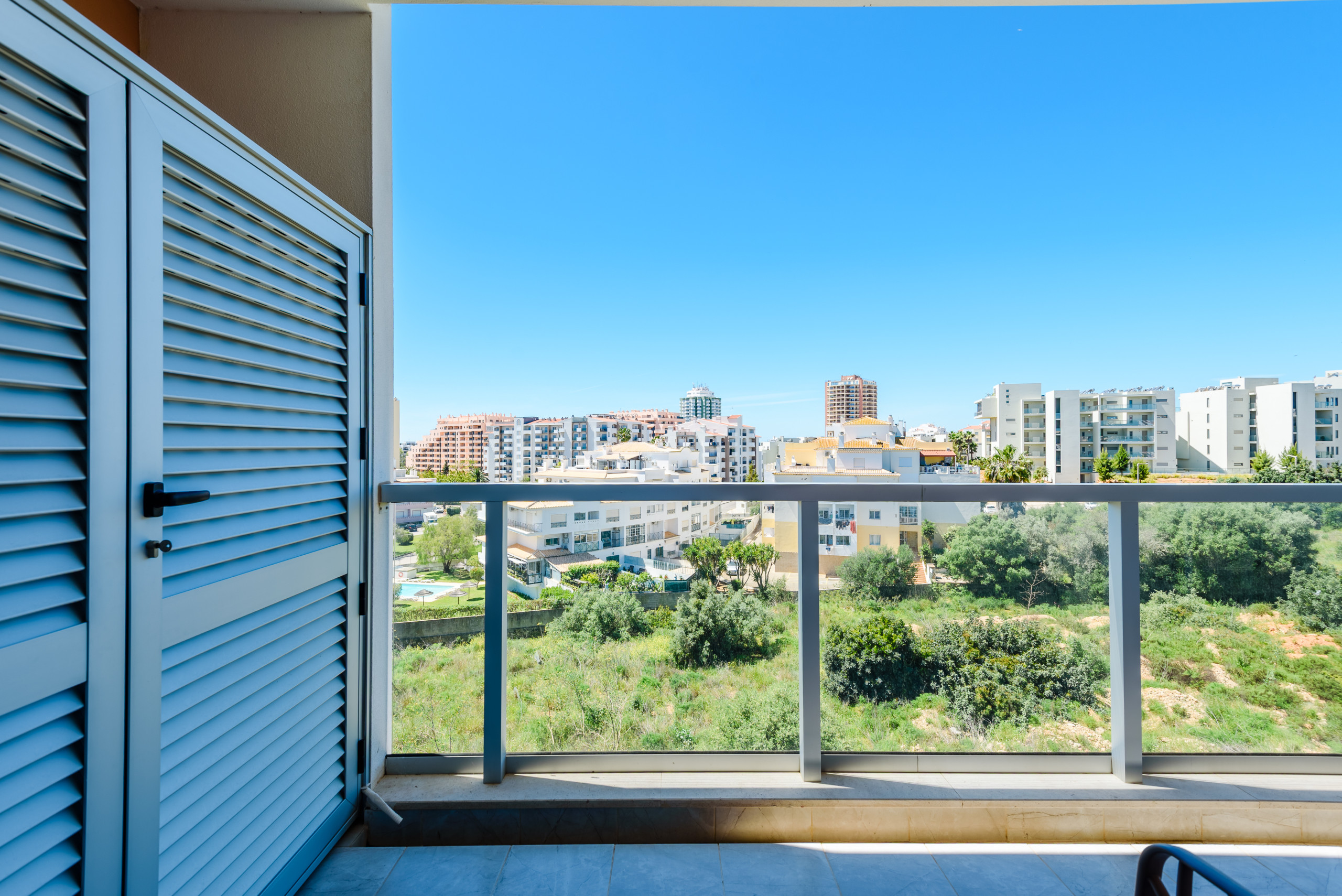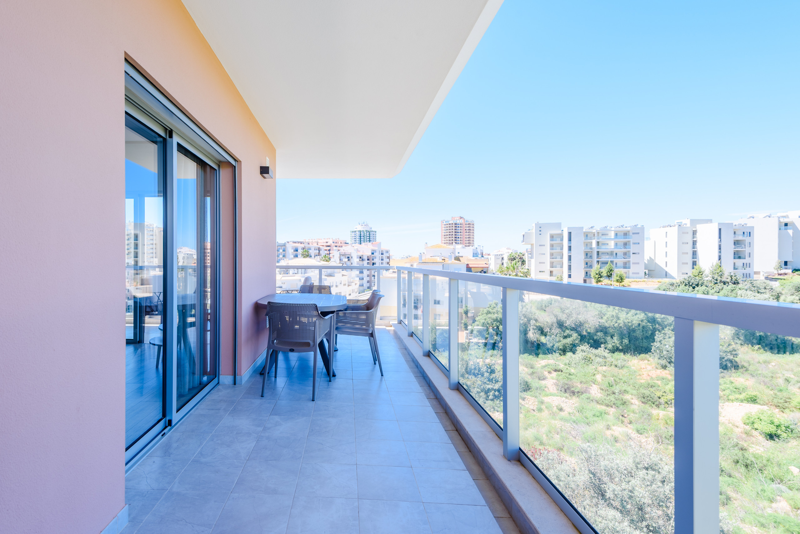 L'appartement dispose d'un balcon enveloppant avec salle à manger extérieure et barbecue, parfait pour profiter des soirées de l'Algarve. De là, vous pouvez apercevoir des vues partielles sur la mer à travers les bâtiments environnants, ajoutant une touche de charme côtier.