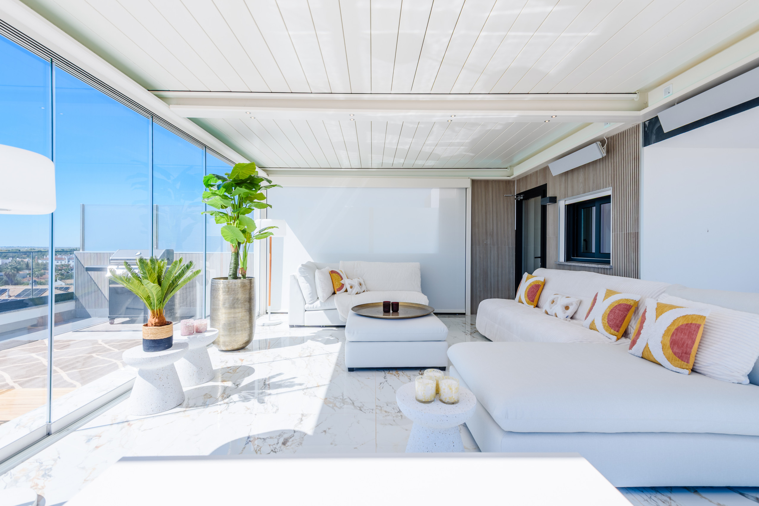 Un point fort réel de la propriété est la terrasse sur le toit privative et spacieuse, accessible directement depuis l'appartement. Couvrant toute l'empreinte du penthouse, cet espace exclusif profite du soleil toute la journée et offre une vue lointaine sur l'océan. Elle est conçue à la fois pour la détente et le divertissement, avec une pergola bioclimatique, une zone de repas extérieure, un barbecue et un sauna, créant une expérience de bien-être et de style de vie unique.