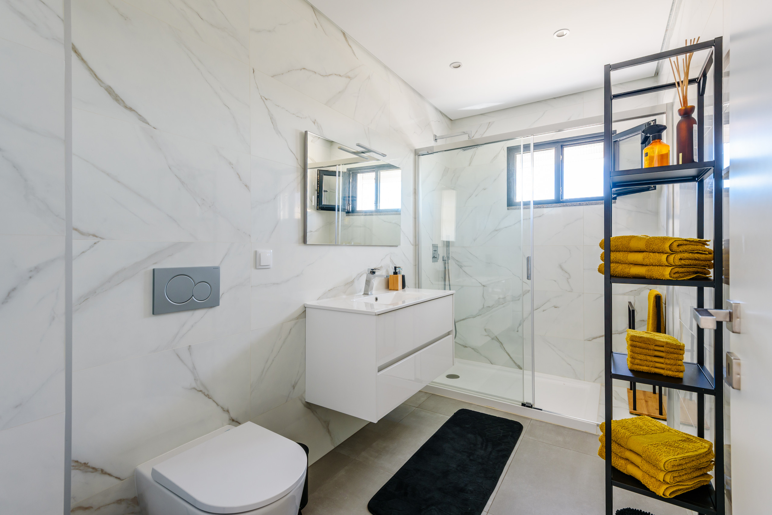 Il y a deux chambres spacieuses, toutes deux équipées de lits king-size. La chambre principale bénéficie d'une salle de bain attenante, tandis qu'une deuxième salle de bain moderne dessert la chambre d'amis. Les deux salles de bain sont pourvues de douches à l'italienne.