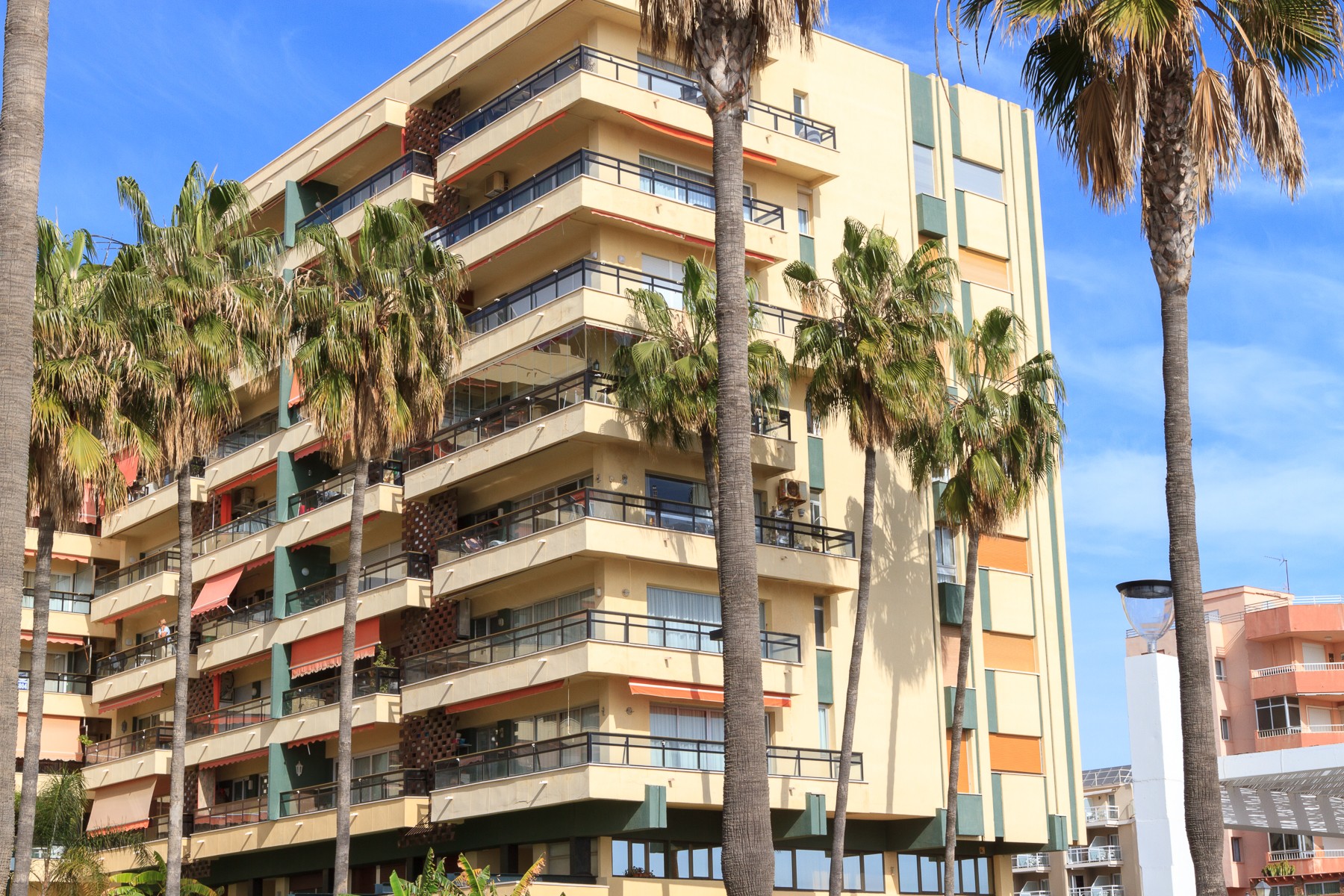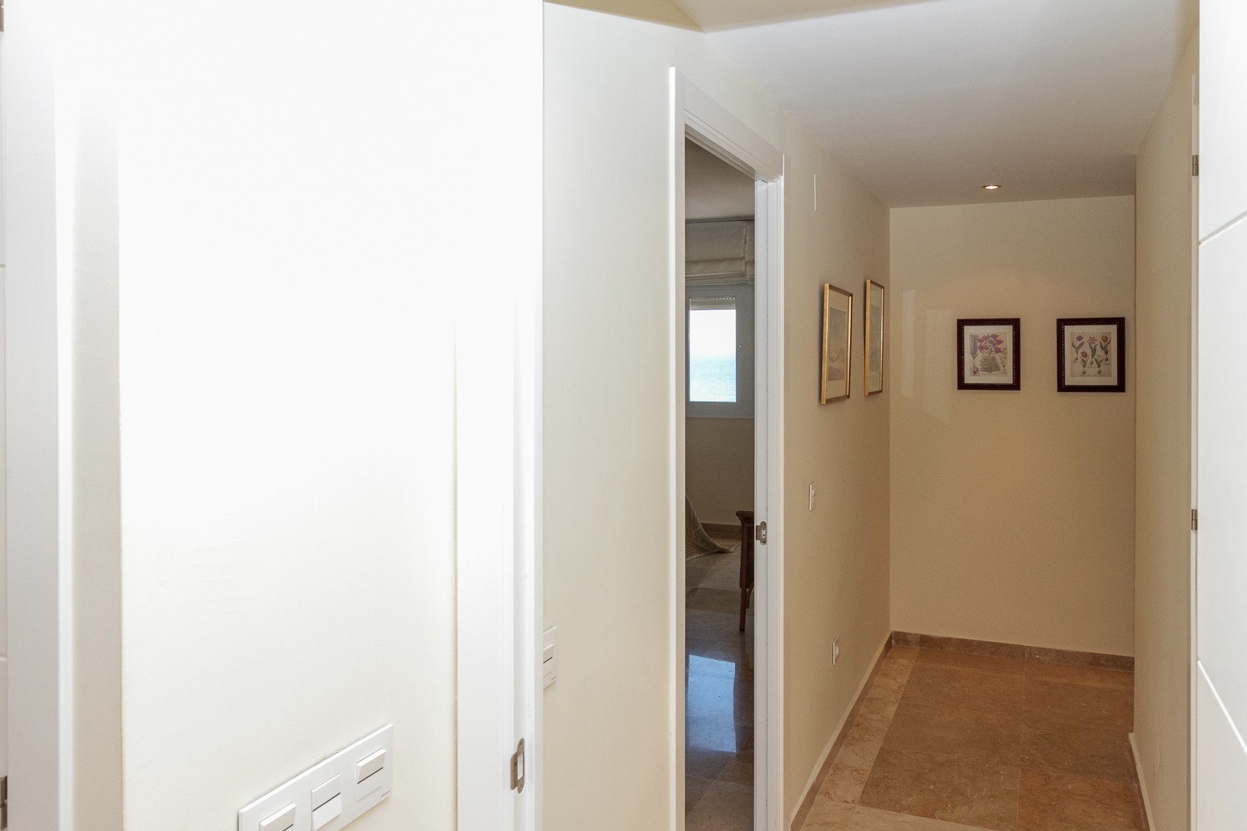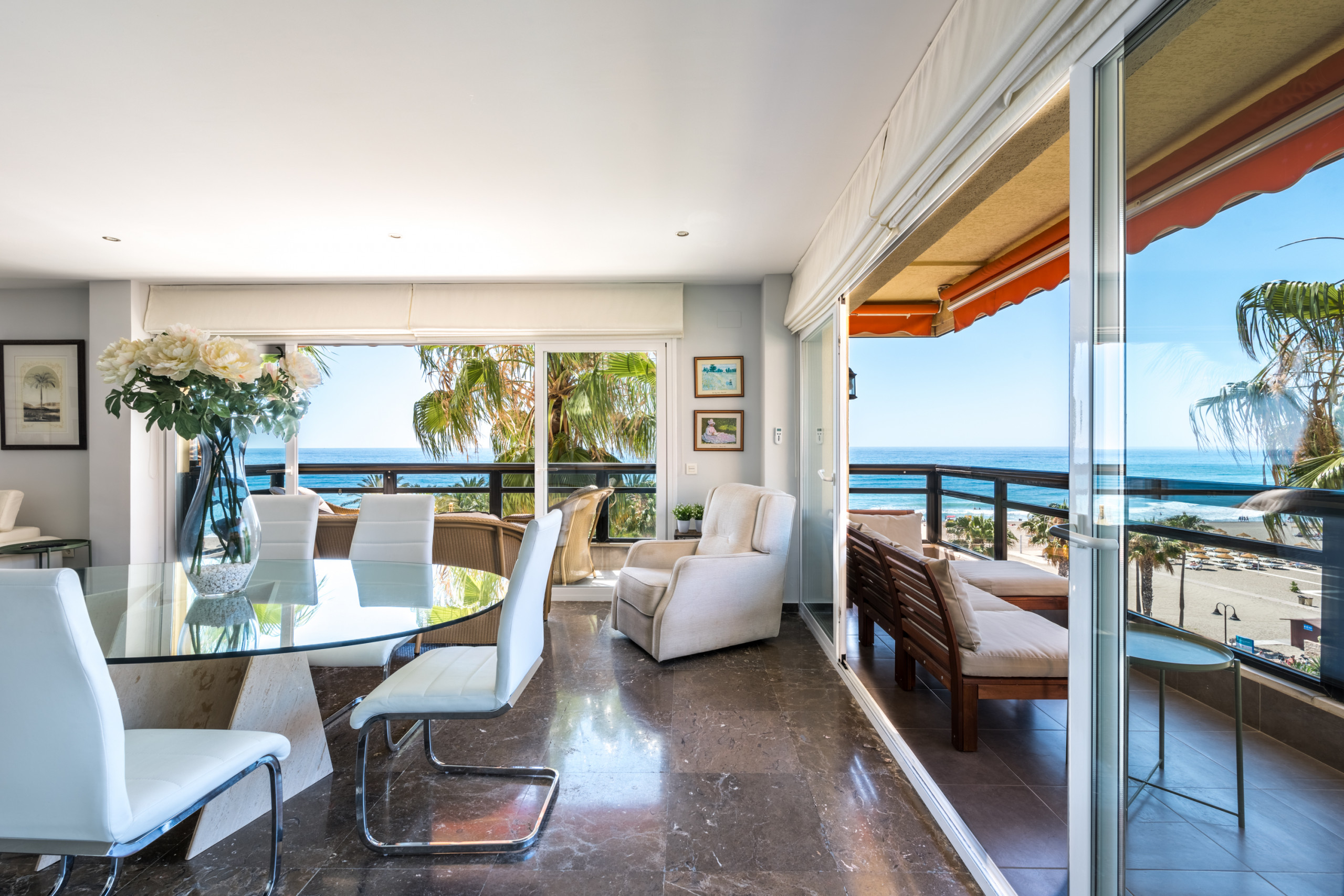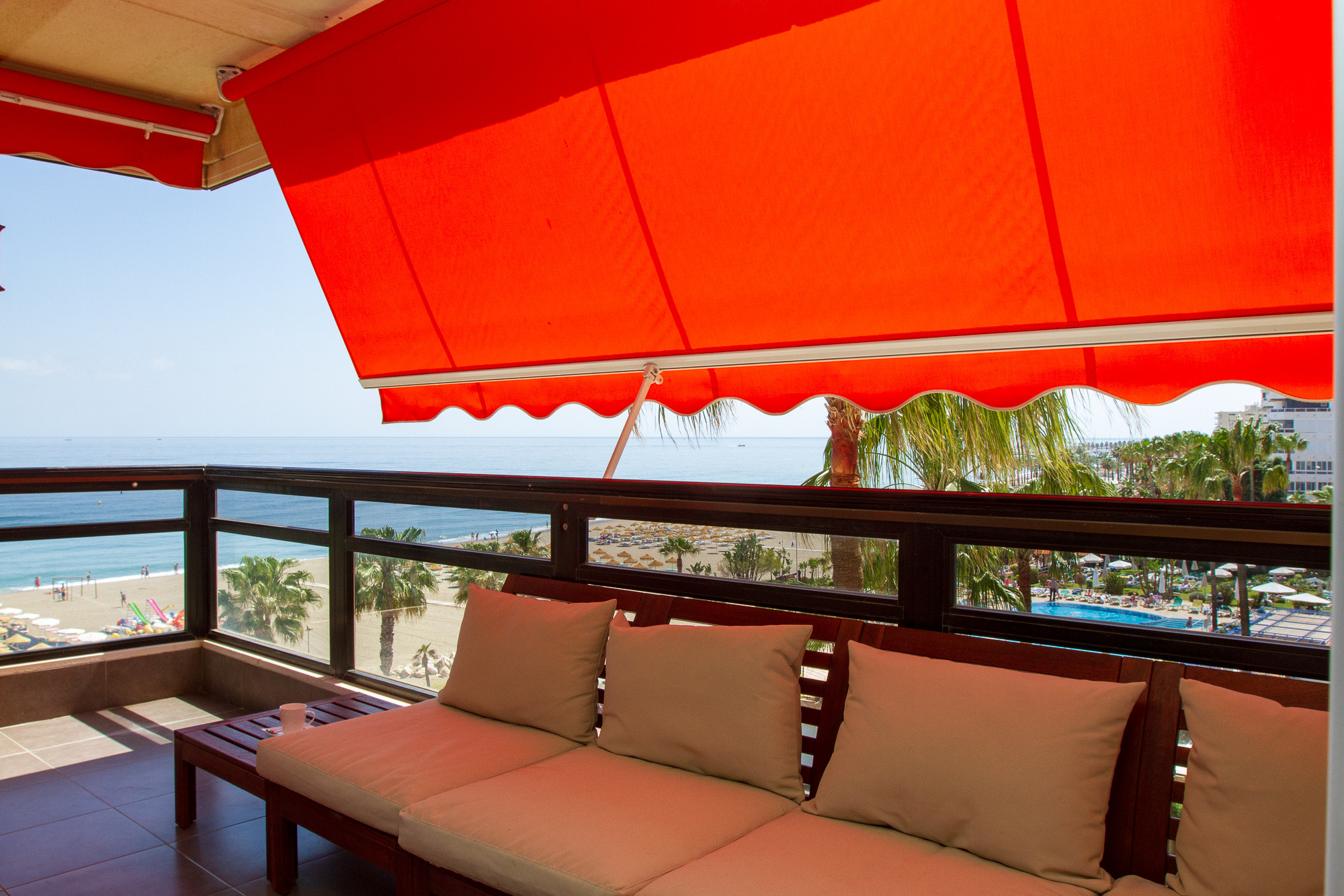 The apartment is on the 4th floor and there is of course an elevator. It is a corner apartment, which means that there is a possibility of the sun on one of the terraces throughout the day. You can start with a nice morning coffee on the east-facing terrace, which belongs to one bedroom and has a view of both the beach and to Malaga. The corner terrace is south-west facing and superbly furnished with chairs, tables and awnings.
