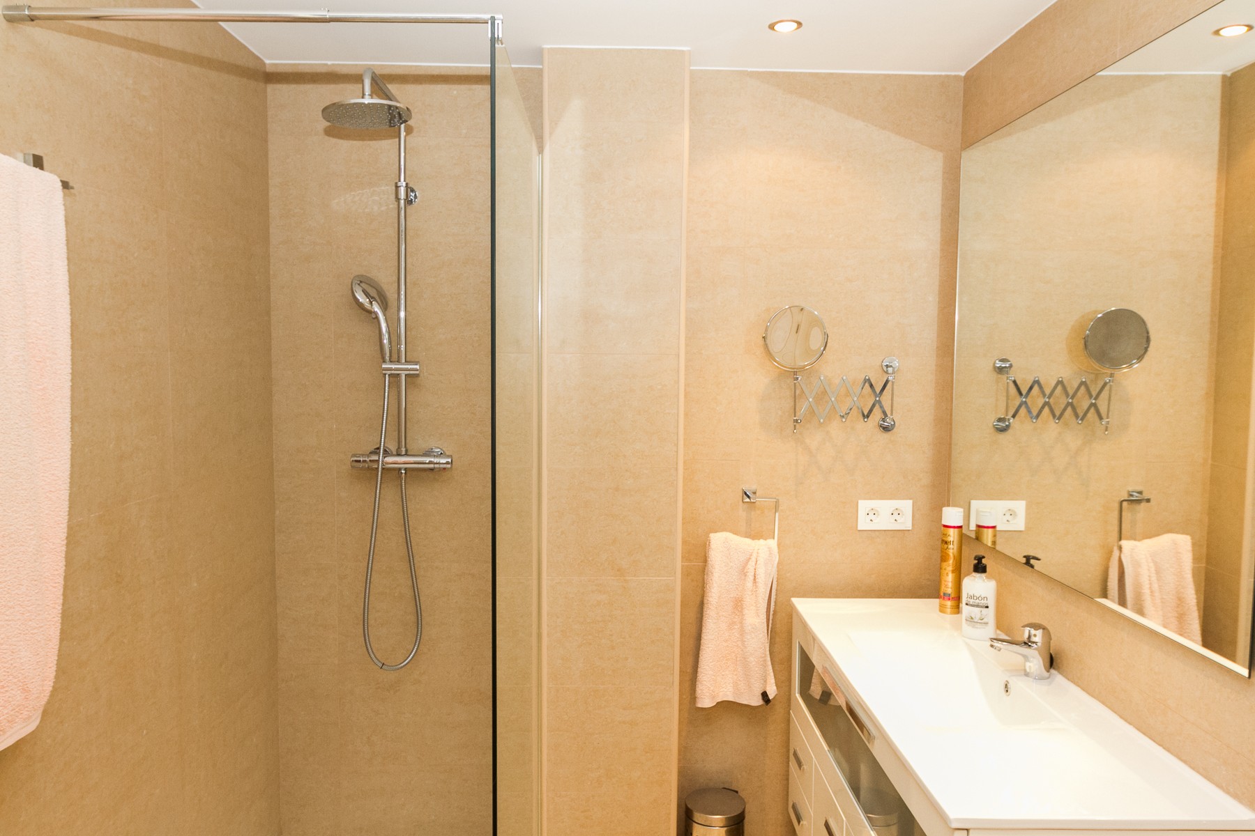 The interior is really nice and the whole apartment is beautiful furnished with quality furniture. The central room in the apartment is the open kitchen / dining area with direct access to the terrace. The kitchen is fully equipped including dishwasher, oven and a built-in deep fryer if you even want to try to make some of the delicious deep fried calamares. There is a small larder attached to the kitchen which includes a washing machine.