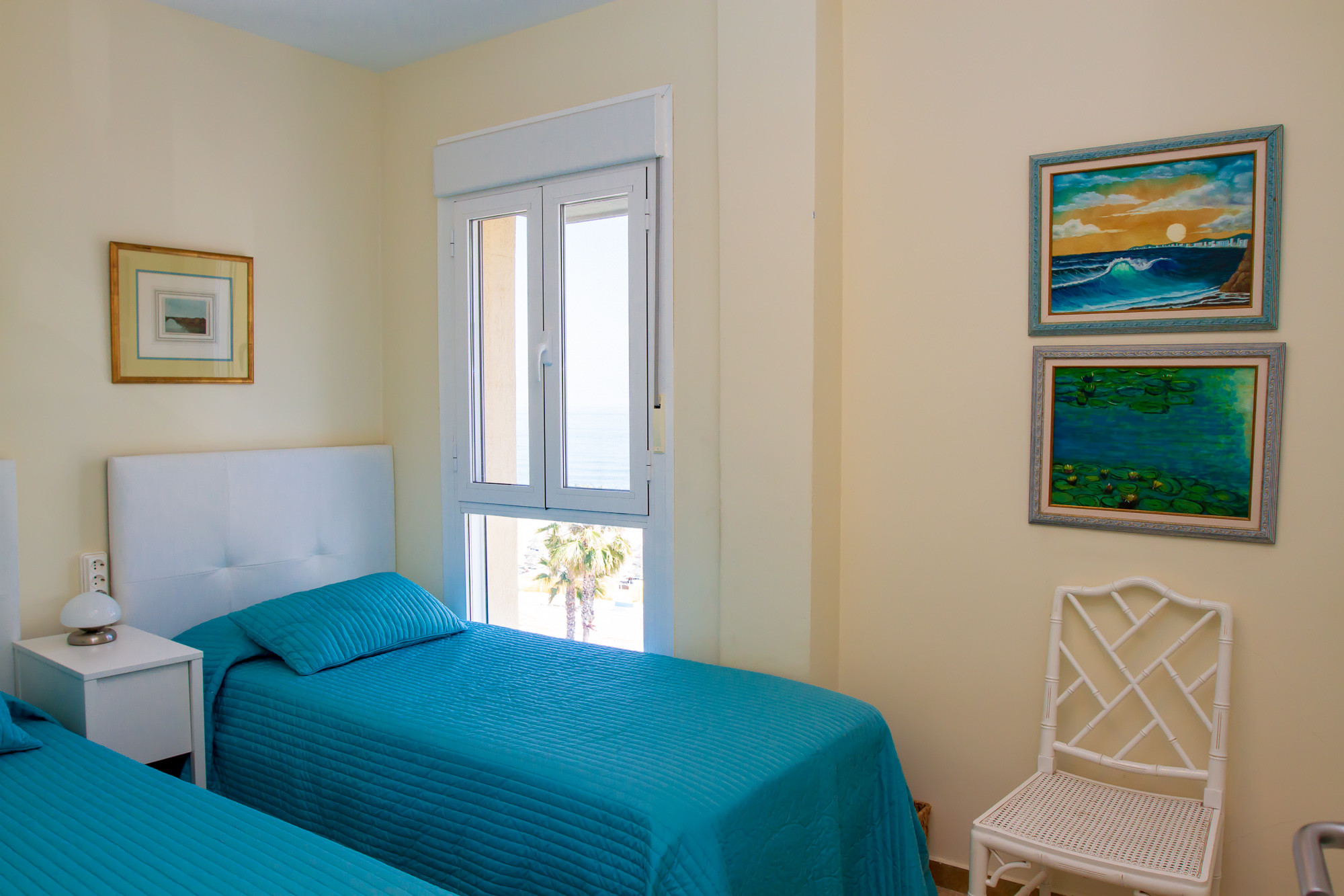 2 single beds, wardrobe, air-conditioning. Accessible bathroom with shower. View of the sea.