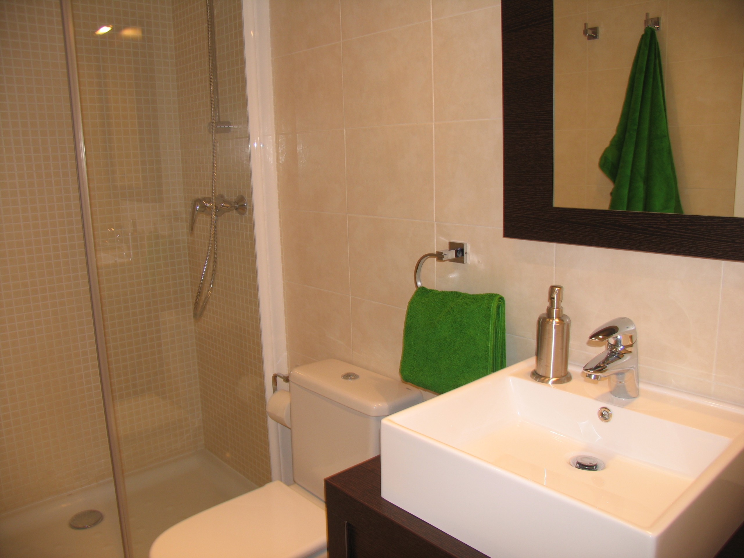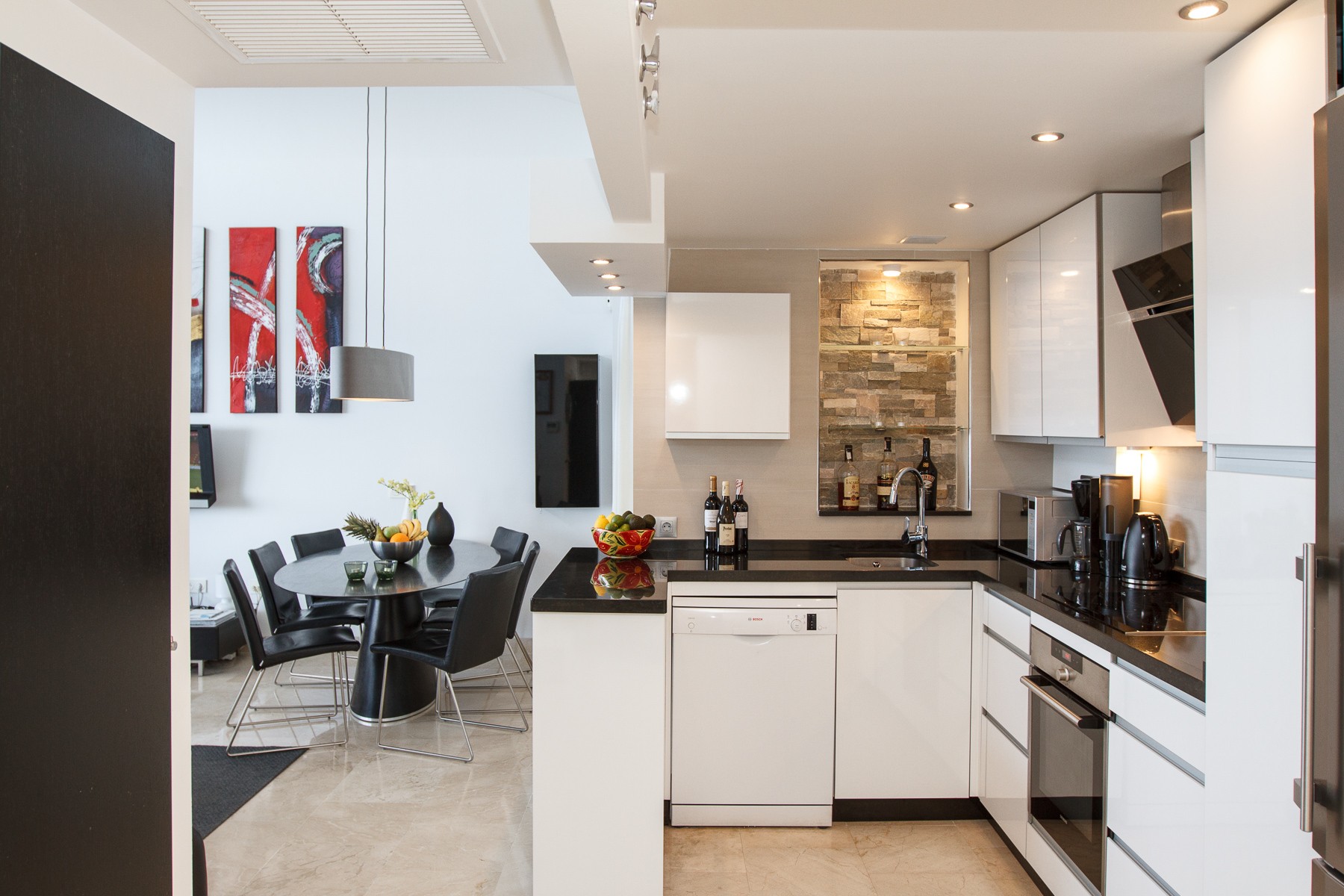 There is a nice living room with high ceilings and extra windows for nice and pleasant light. Comfortable sofa area with sofa bed for 2 extra beds and this gives a total of up to 8 sleeps.The fully equipped kitchen is in open plan with the living room and dining room. The lounge area includes flat screen, satellite TV, DVD, free wireless internet access and centrally controlled air conditioning. The whole apartment is modern and well equipped for an extra comfortable stay.