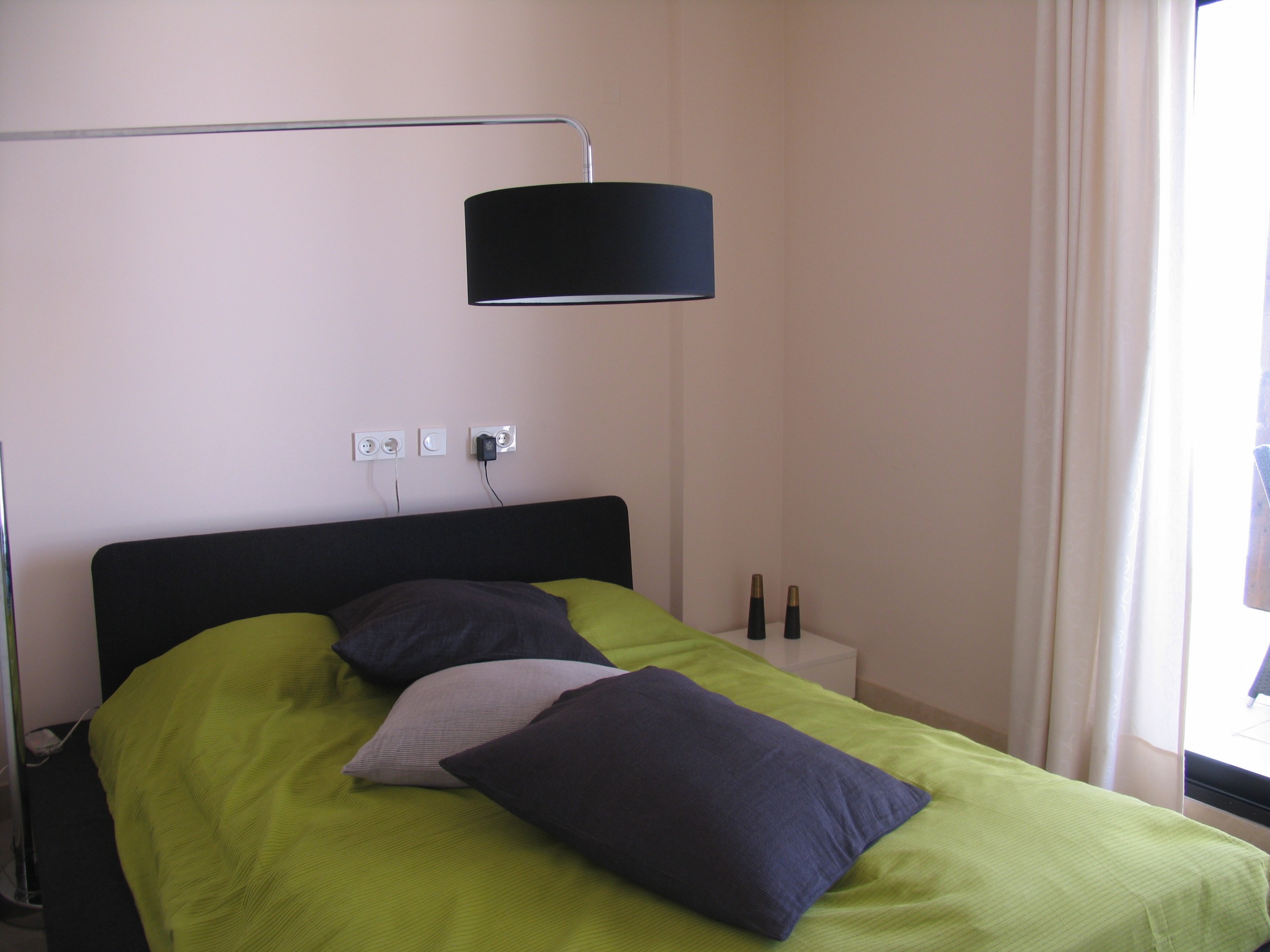 There are 2 bedrooms one of which is the master bedroom with TV and bath en suite. Both bedrooms contain a double bed, wardrobe, air conditioning and access to the terrace. There is a nice living room with high ceilings and extra windows for nice and pleasant light. There is also an extra room, which is separated from the living room by a curtain (no door). This room contains a bunk bed with 2 extra beds and dresser.