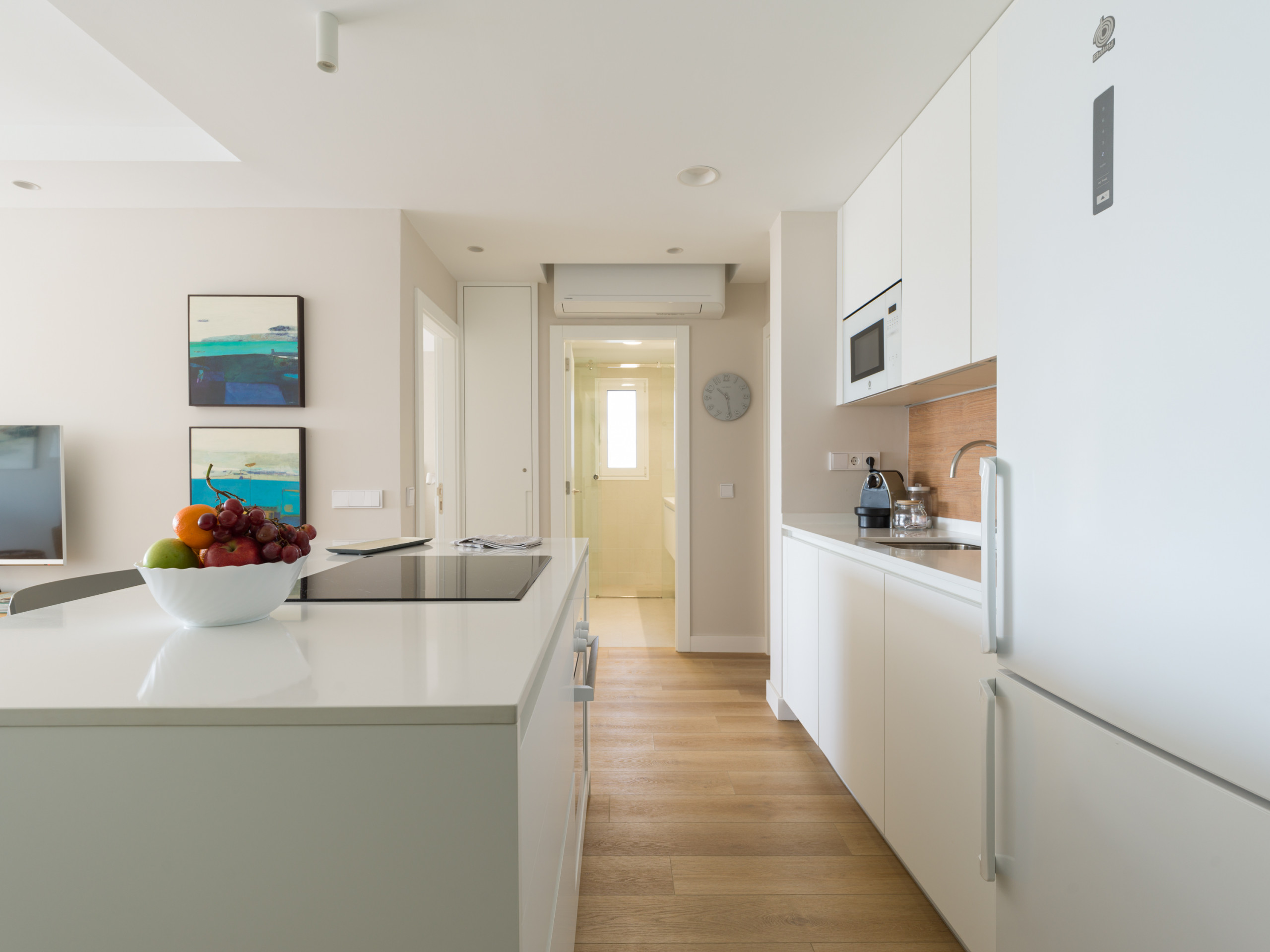 Cuisine américaine avec îlot, entièrement équipée avec plaque à induction, réfrigérateur, micro-ondes, four, congélateur, lave-linge, lave-vaisselle, vaisselle, ustensiles de cuisine, cafetière, grille-pain, bouilloire et presse-agrumes.