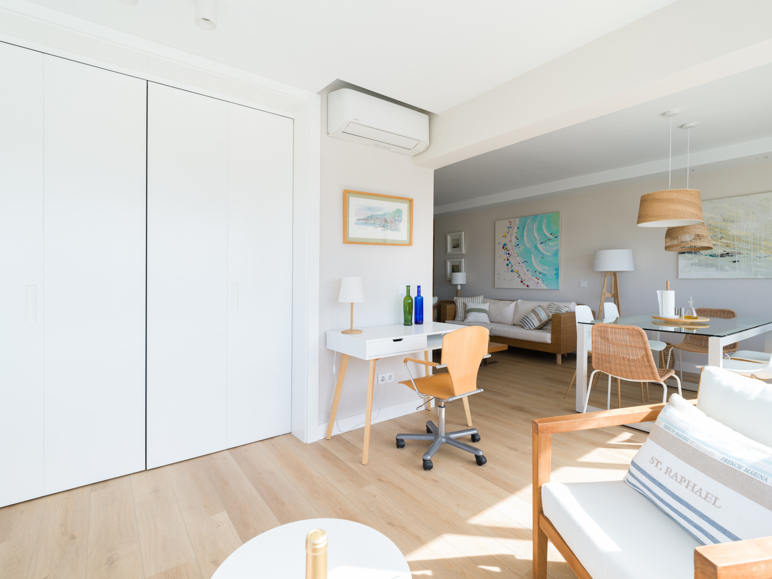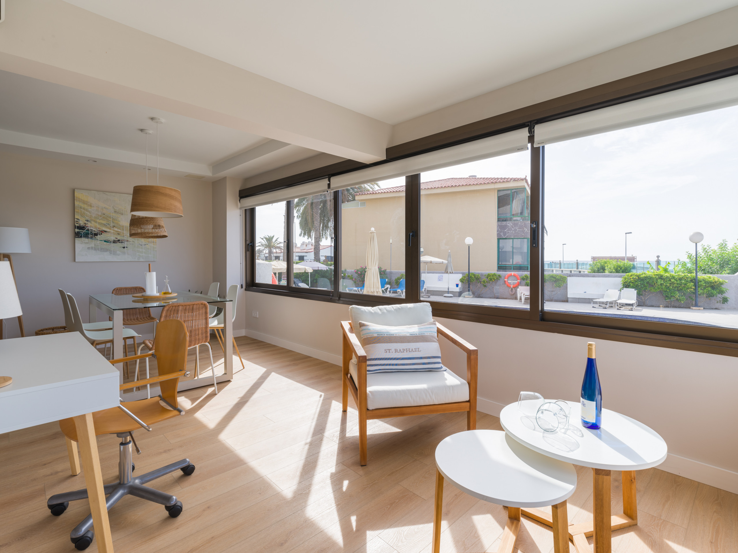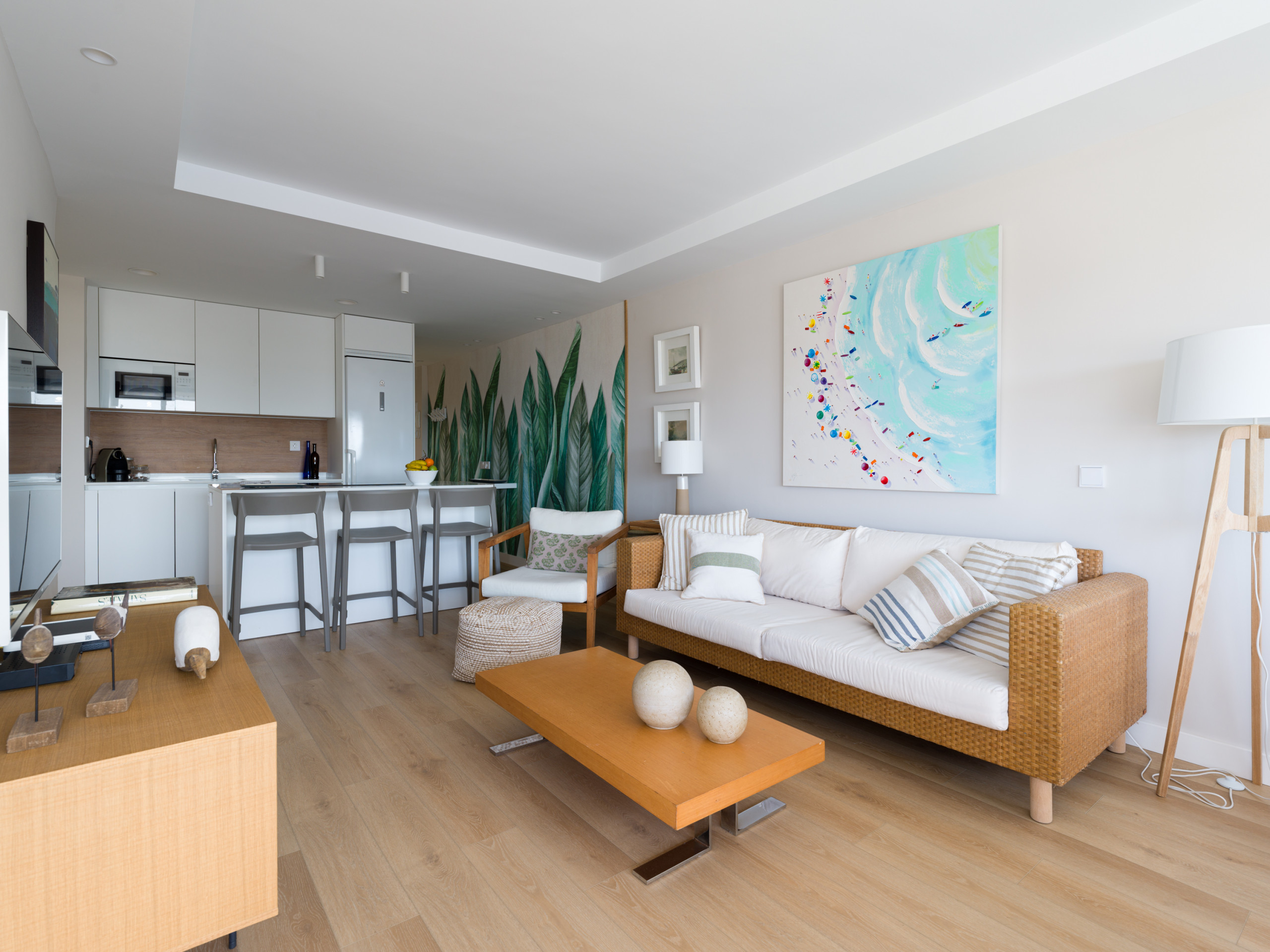 Logement de 85 m², avec une décoration exquise, un salon spacieux avec de grandes fenêtres donnant sur une piscine commune tranquille et la mer en arrière-plan.