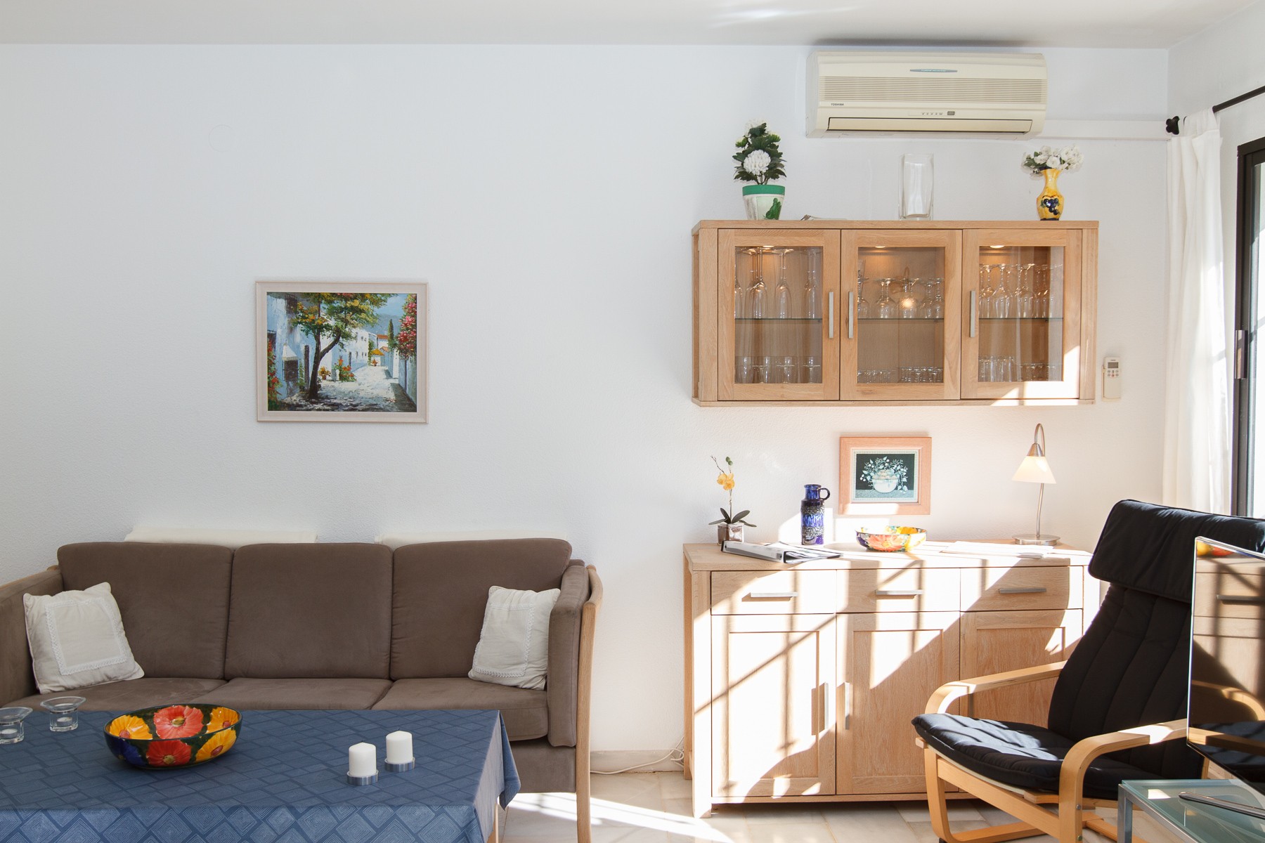 Small hall, fully equipped kitchen with oven, microwave and dishwasher. Toilet with shower. Bright living room with a comfortable sofa corner, TV, High speed Wi-Fi. Dining table. There is direct access to furnished terrace with table and chairs, umbrellas, barbecue and garden bench.