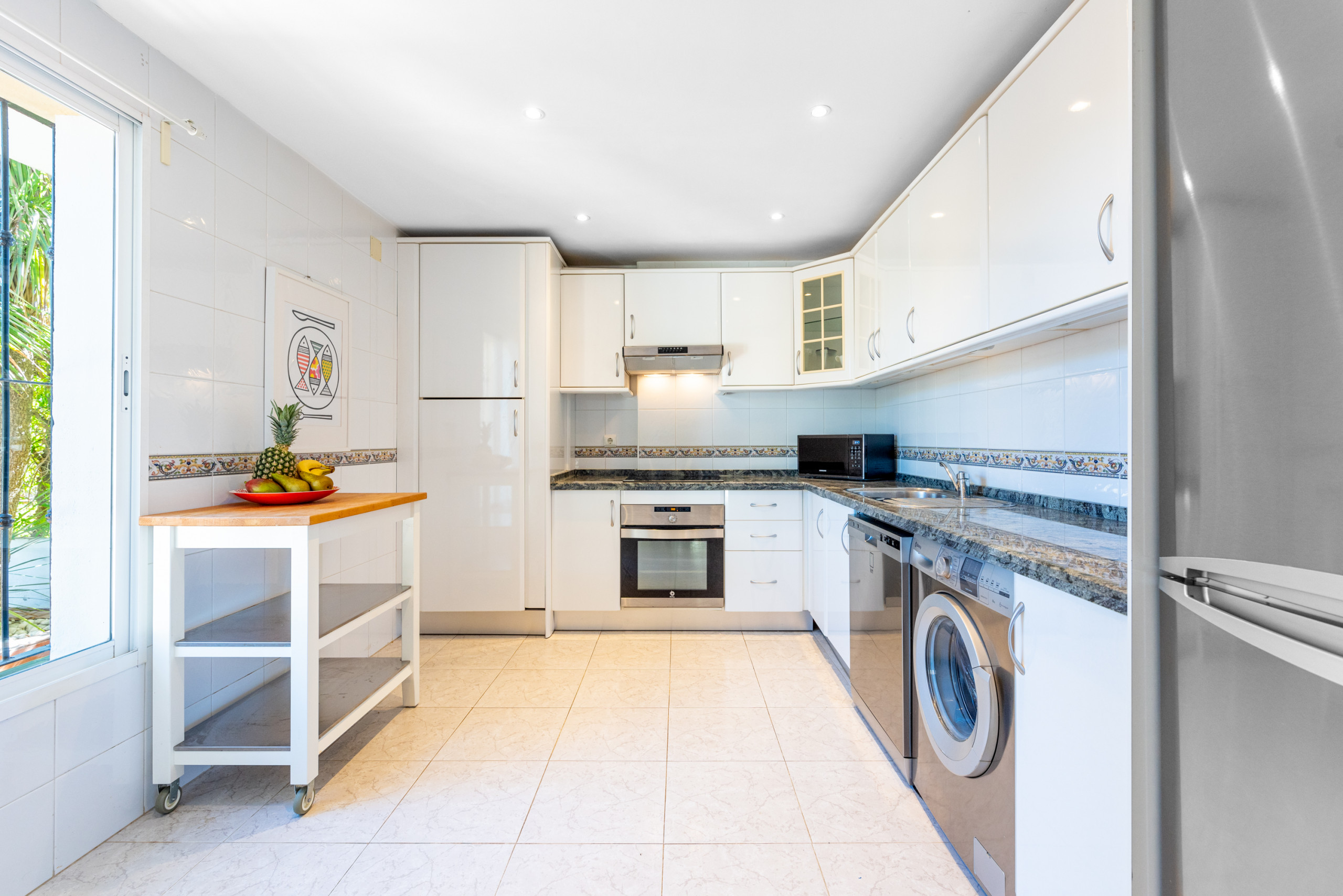 Back at the property, the separated kitchen is located at the entrance, and it is fully equipped with all the amenities needed for a family holidays like dishwasher, laundry machine, oven, microwave…