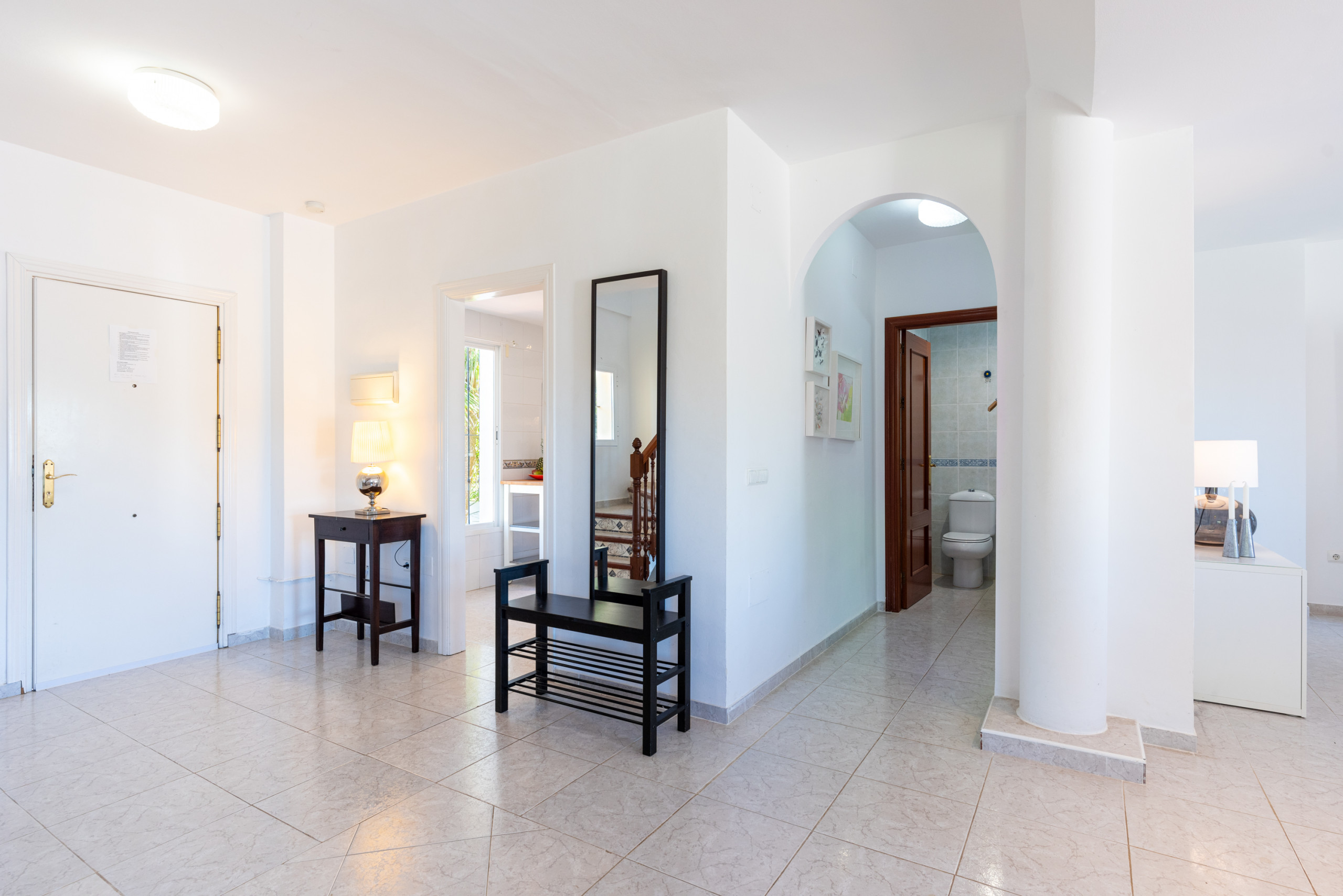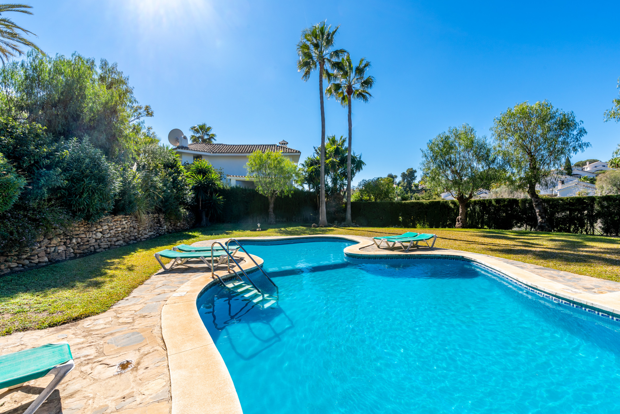 Once you enter in this lovely home, you will find a small reception space that leads to the great living room. In this exclusive living room, you will enjoy a dining area with seating for up to 6 people, and two comfortable sofas where you and your family can watch tv. From the living room you can access the terrace which is furnished with 2 sofas and an outdoor table. Following his terrace you will access the private swimming pool, a perfect place to relax and enjoy the sunny days of Malaga. There are 3 outdoor chairs and 6 sun loungers available.