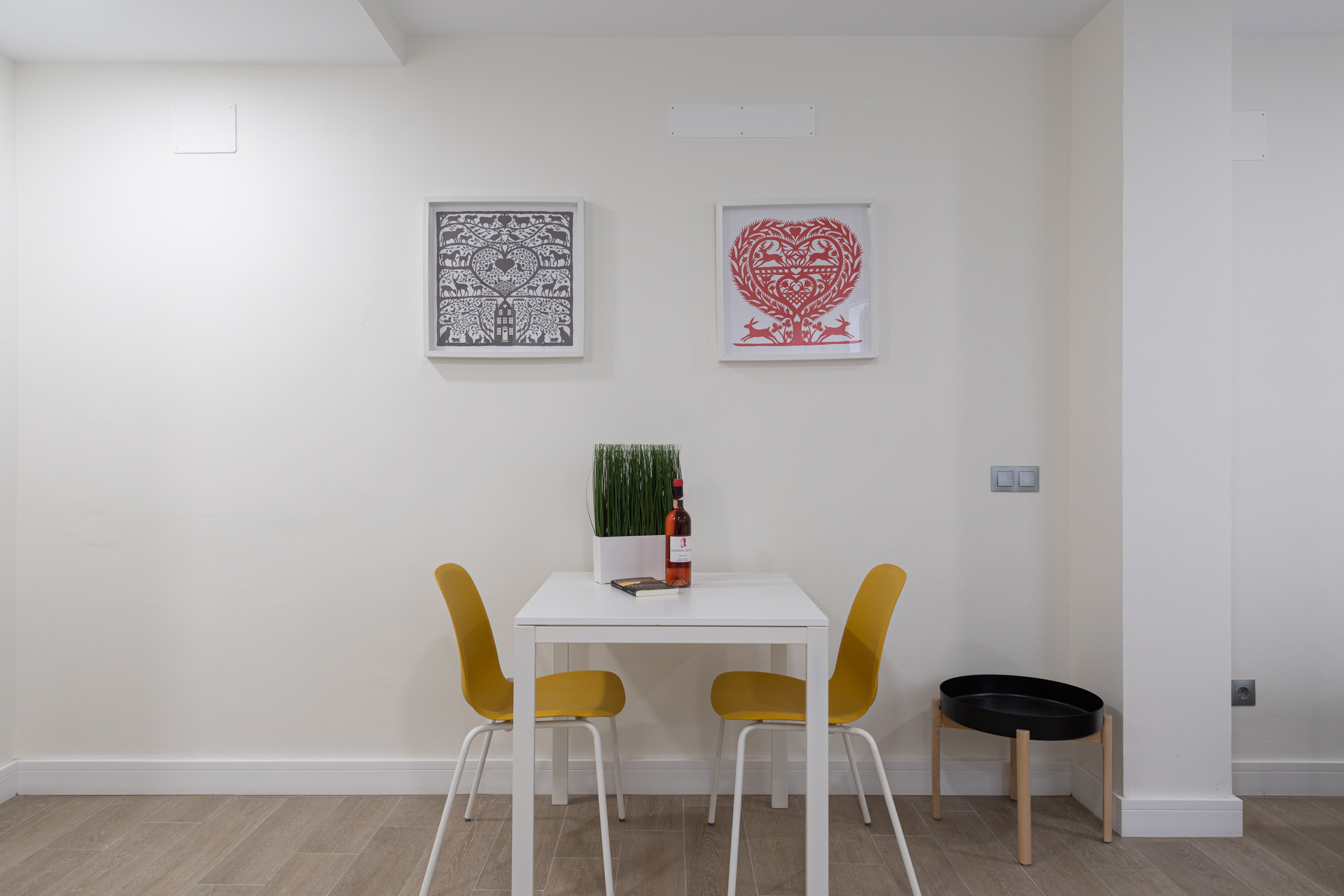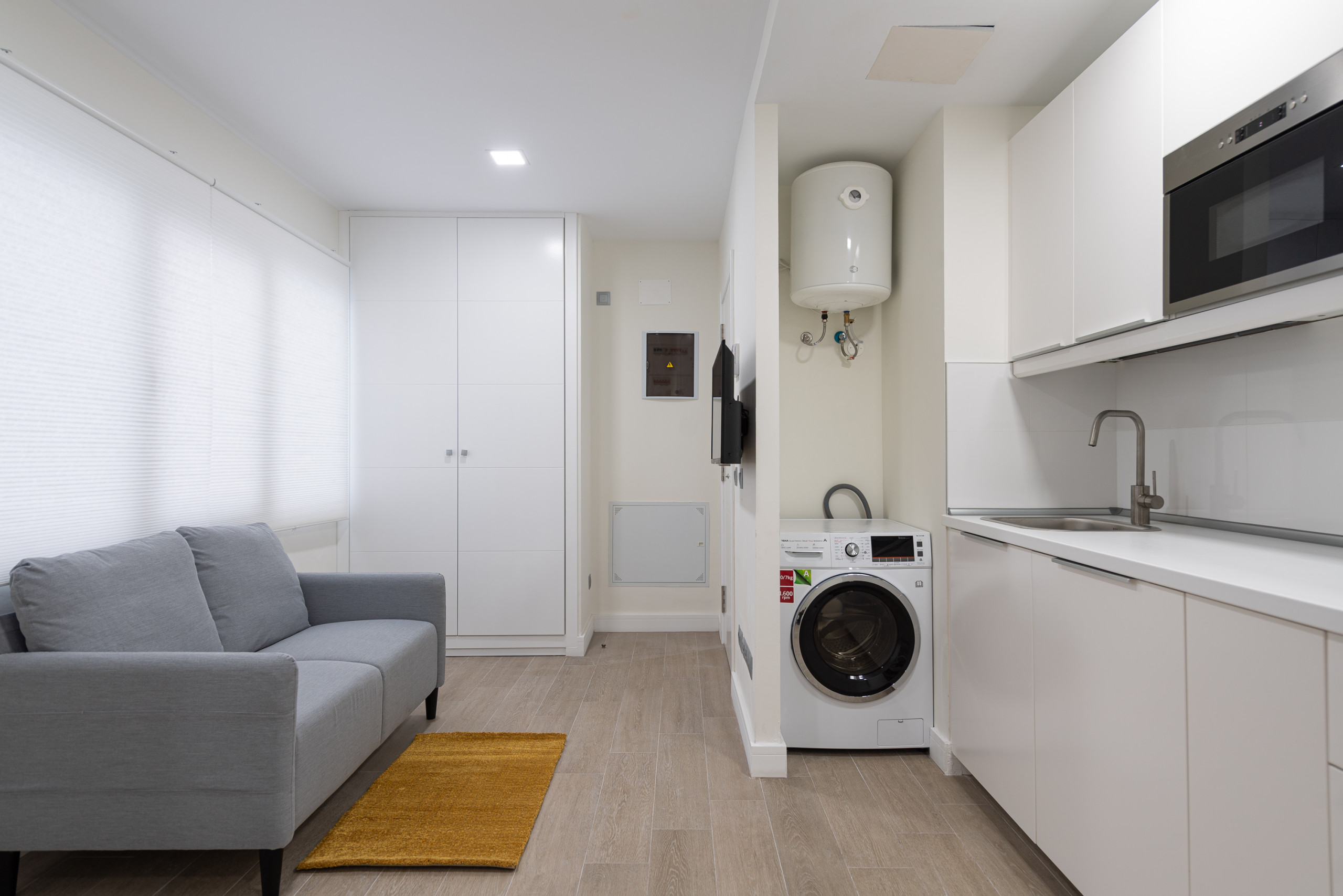 Logement de 29 m², intérieur mais très lumineux, au troisième étage, rénové en 2020, accueillant et fonctionnel. Il dispose d'un espace très bien utilisé distribué dans la même pièce. La cuisine, entièrement équipée avec réfrigérateur, micro-ondes, four, congélateur, lave-linge, sèche-linge, vaisselle/couverts, ustensiles/cuisine, machine à café, grille-pain, bouilloire, presse-agrumes et ustensiles de cuisine, est intégrée dans le même espace.